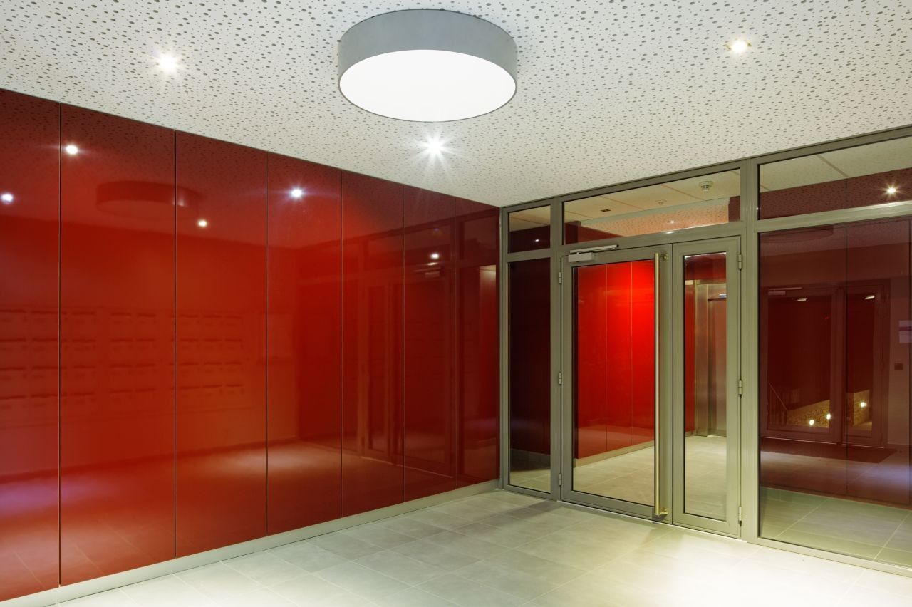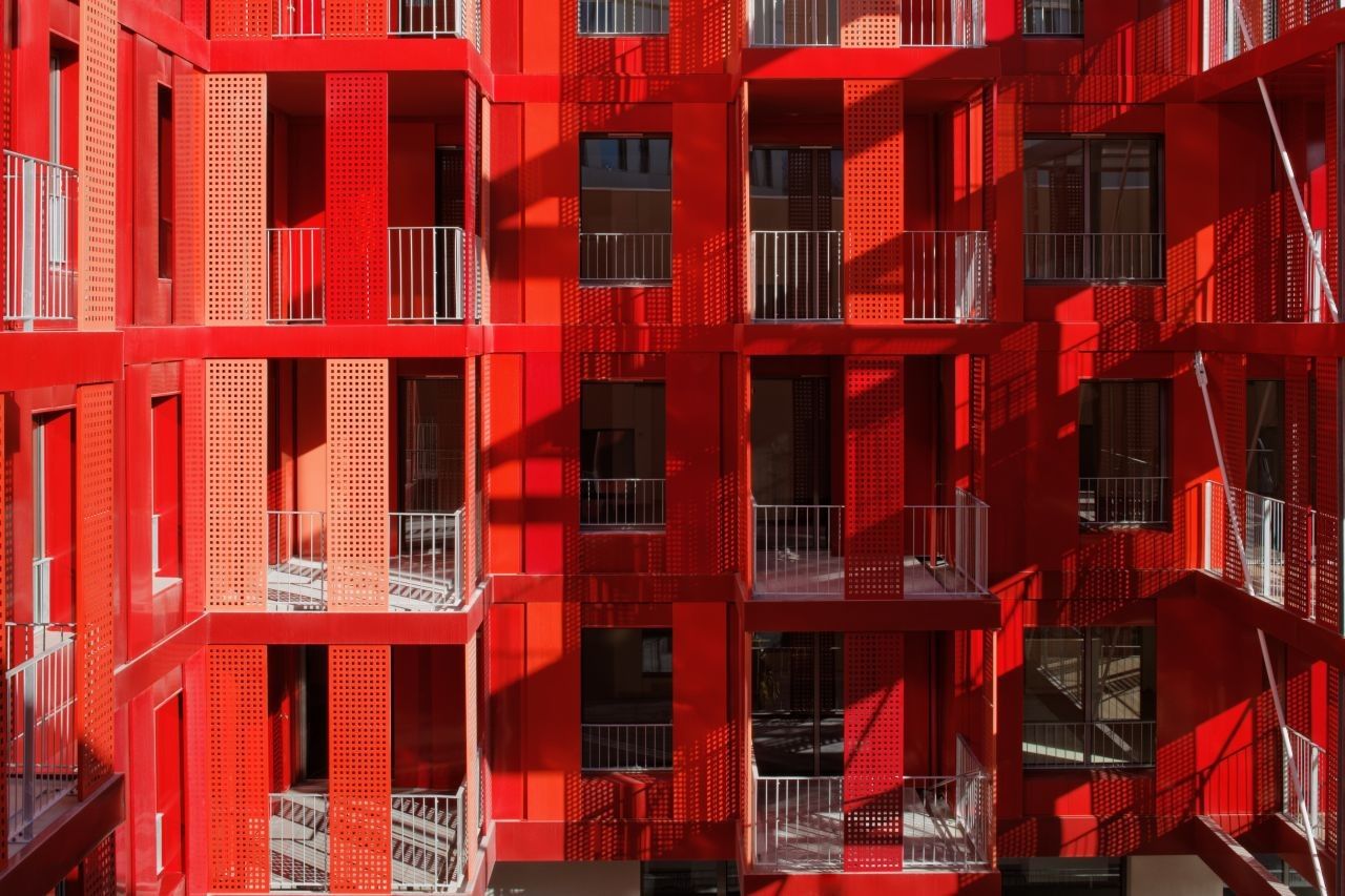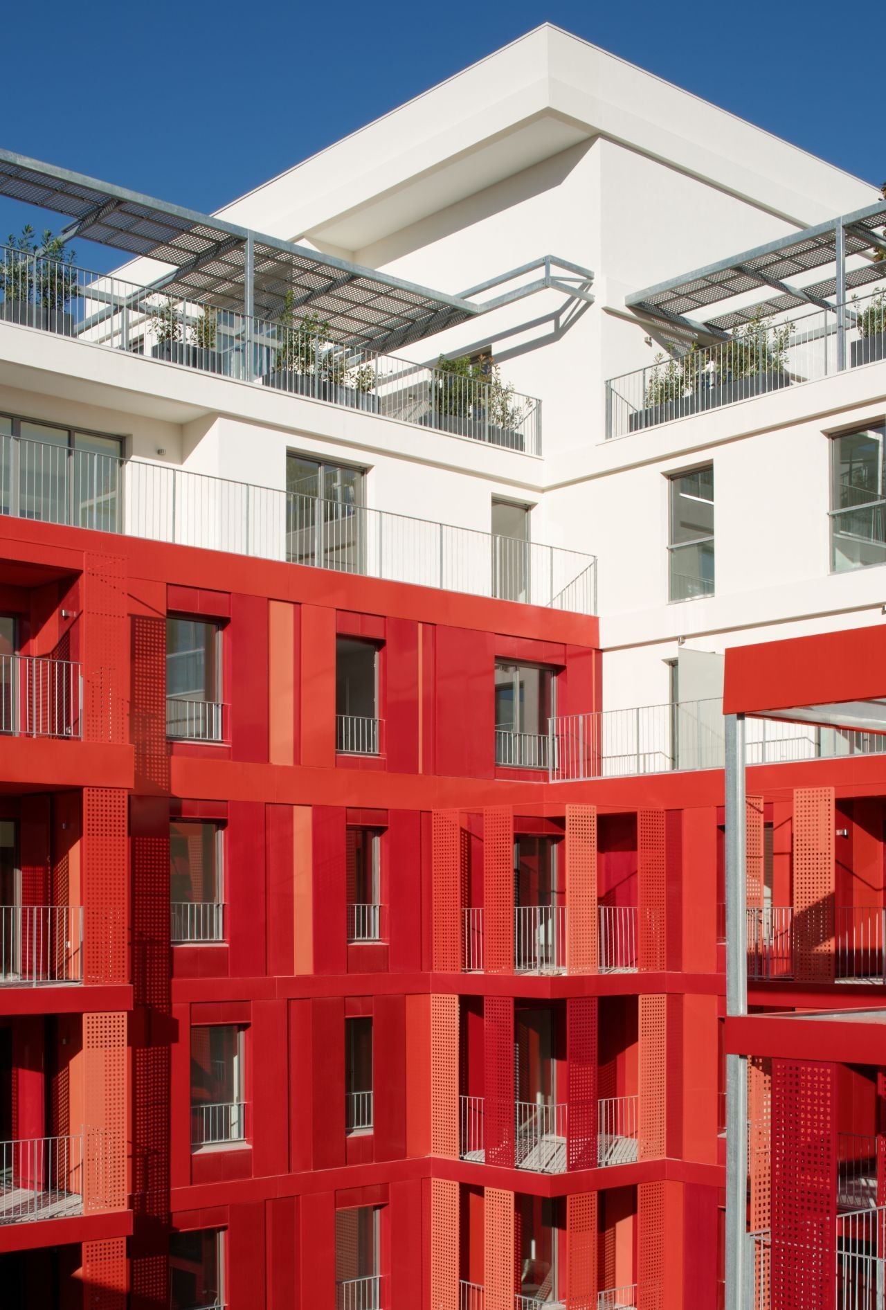 The building comprises of a stamped concrete podium upon which the main portion of the building from the third story to the seventh story sits along with a recessed attic, all of which was dictated by the ZAC. Along the north side of the site, the building comes to the highest point of ten stories compared to the south side which only comes up to six stories. The terraced top stories of the building all contain varying heights. The box formed by the top attic floors are made up of two floors containing two large luxury apartments. Following the overall theme of the ZAC, the building also adopts an overarching sustainable development approach utilizing external sun shades to provide protections from mid-season and summer solar inputs without blocking natural daylight. All the homes have a balcony or terrace with either fixed sun shades or sliding panels to further control the amount of light the interior spaces receive.The complex volume, formed by a series of recesses and overhangs, is finished with a metal cladding of aluminum cassette panels. The main portion of the building, atop the podium, is unified by the bold red color palette prominent of the facades of the housing development, adding to the various layers the design possesses.