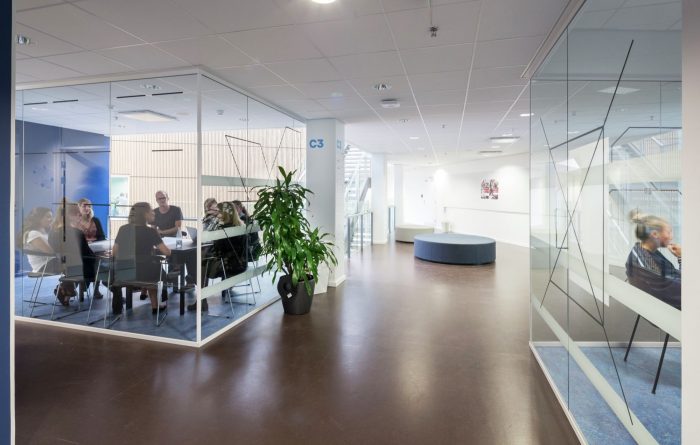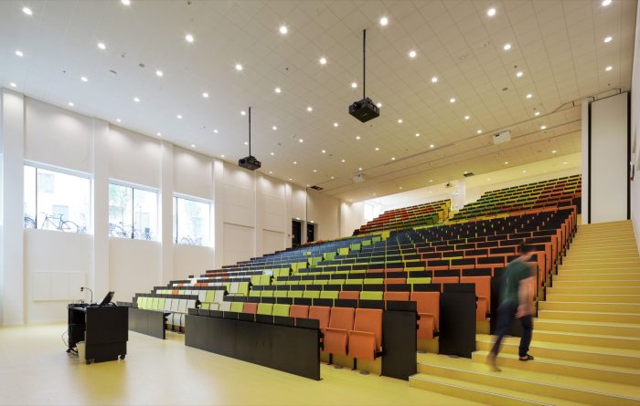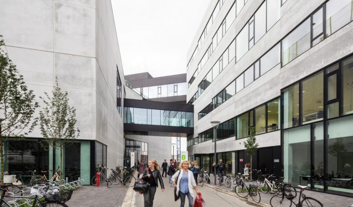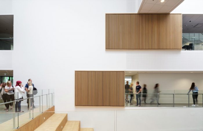 The Campus Area’s many functions are integrated into the overall building based on a matrix organization. This way of organization seeks to bring together professionalism in the vertical clusters and simultaneously unify the different educations horizontally – this happens in the floors, with cross couplings between the clusters.