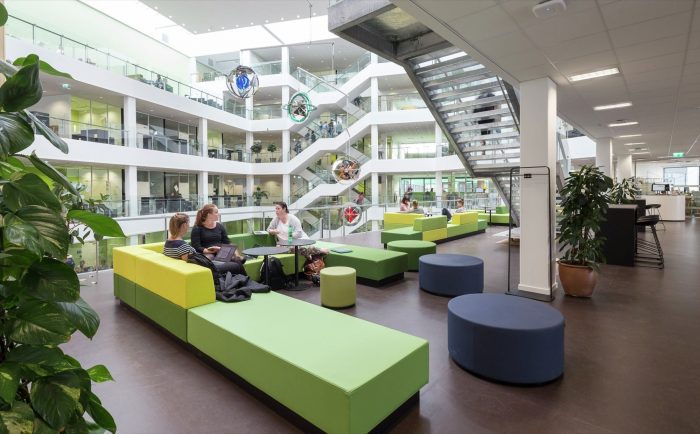 Knowledge Square is a spacious, exiting universe in several floors. With open sides facing the Aarhus city, it makes the life that takes place inside the building visible for the city outside. The large window-openings in the facade, create a very bright environment, which promotes the feeling of being a part of the town square outside.
