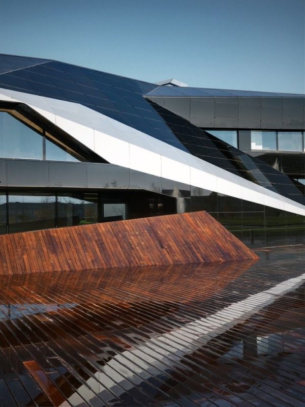 Designed by Damilano Studio Architects, Oficina Vidre Negre, for those not fluent in Catalan, means Black Glass Office, which very accurately describes the architecture of this building. The idea that is strongly observed within and around the structure is a reflection, making glass an easy choice of material for the façade. Reflection is one of those words that can be applied to a range of topics and interpretations. In this case, the smooth glass cladding of the prism hopes to reflect the surrounding park environment onto the building, which is also emphasized through its shape inspired by the landscape