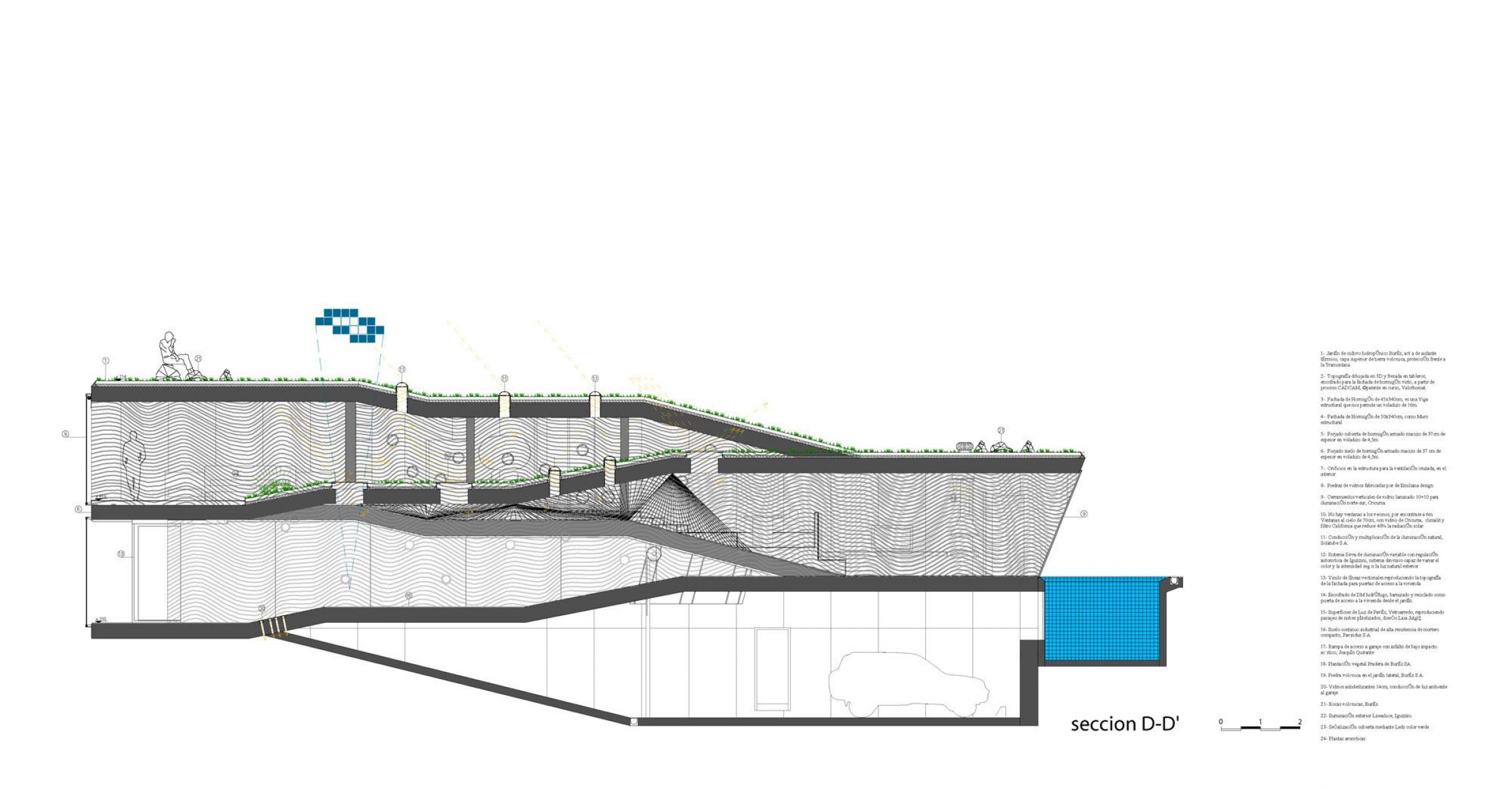The villa is constructed as a C-shaped continuous section. As one moves from back to font, the section can be understood as changing from being a capital C to a lowercase with no bottom at the front. From the front, the section falls away under the cantilever, becoming an underground garage. From this point the concrete home begins to cantilever, with a clear open space below for most of the plan.
