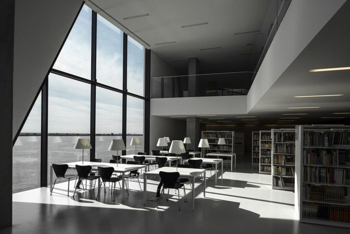 The proximity of the river, with all that it involves, wether by enjoying its movements or by the light effects that result from the sunlight on the watercourse, constituted luminance values when it came to contemplate the inner space of the Library.