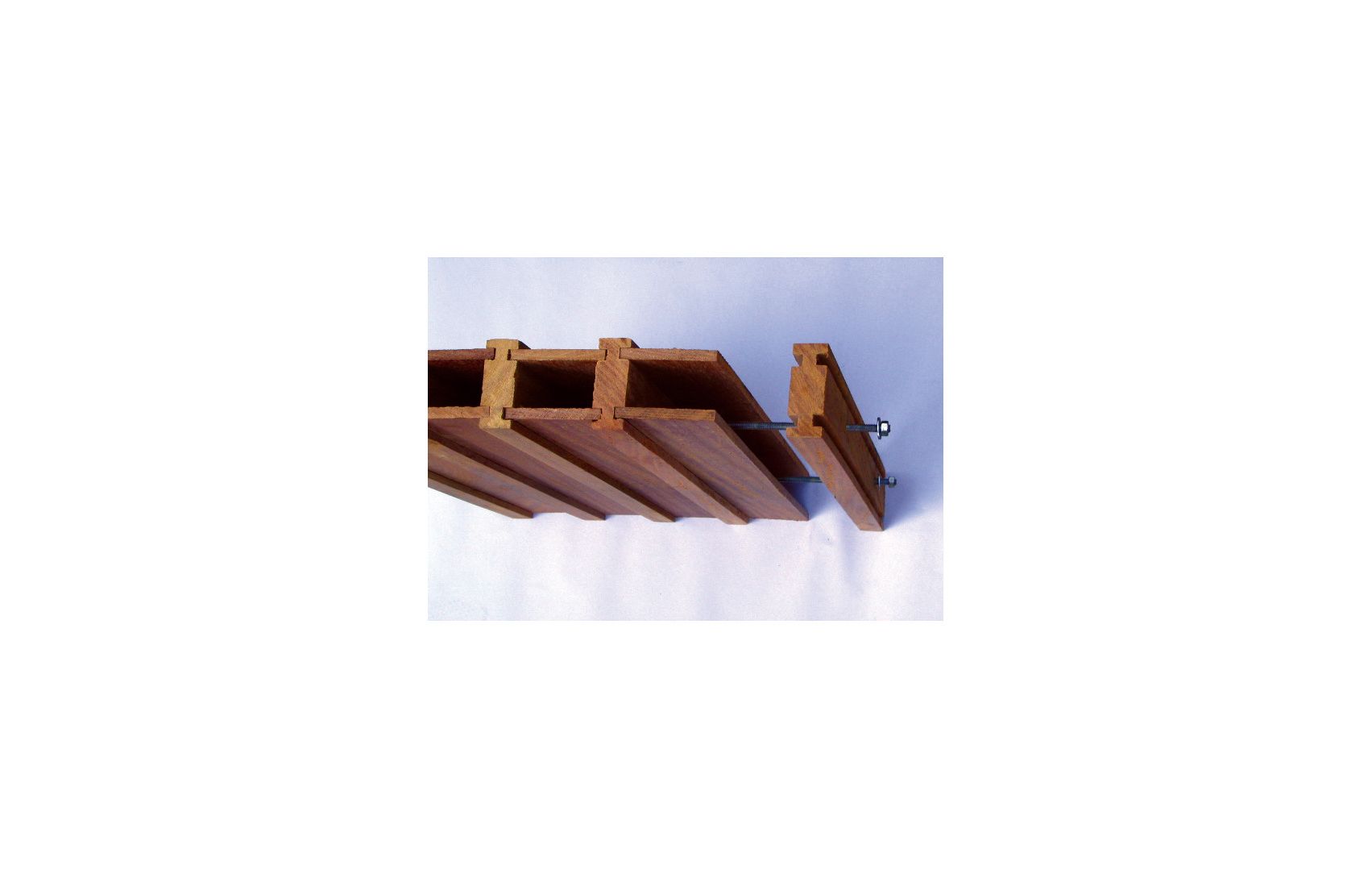 The 10 cm strip modular system used for panel production enables them to come in widths of between 20 cm and 300 cm and heights varying from 100 cm to 550 cm. The reasoning behind this design is to allow the use of small, solid wood parts whilst still meeting requirements for a variety of architectural designs. The final dimensions of each panel facilitate pre-fabrication in the workshop, storage and transport to the site.