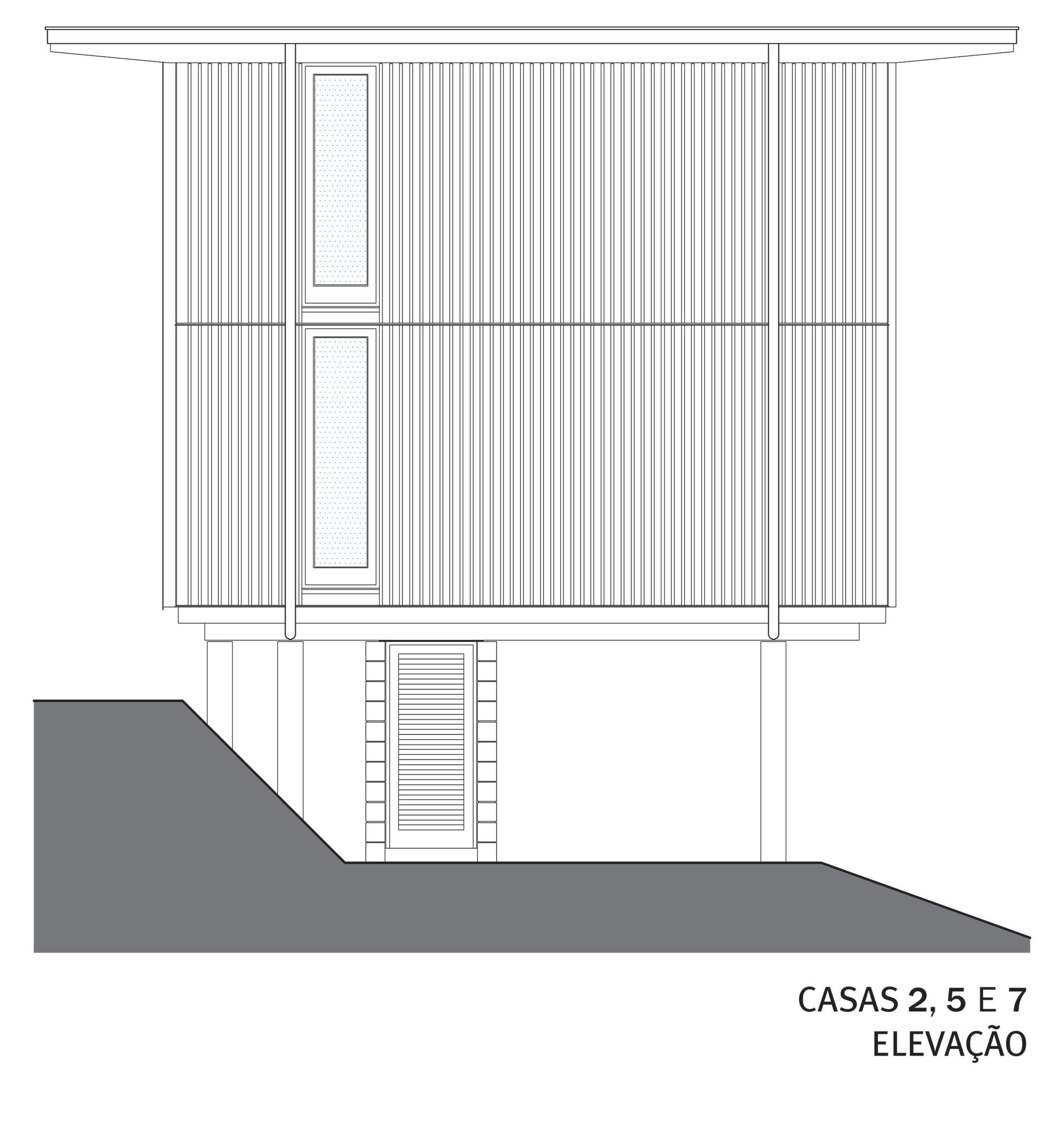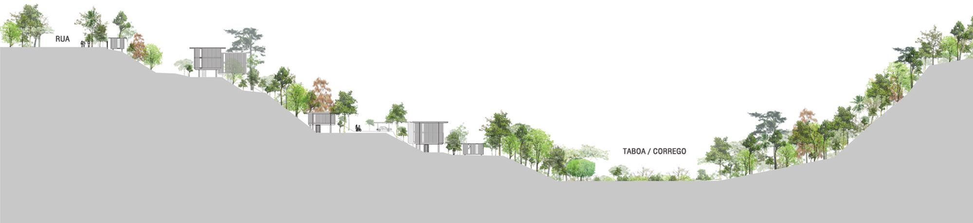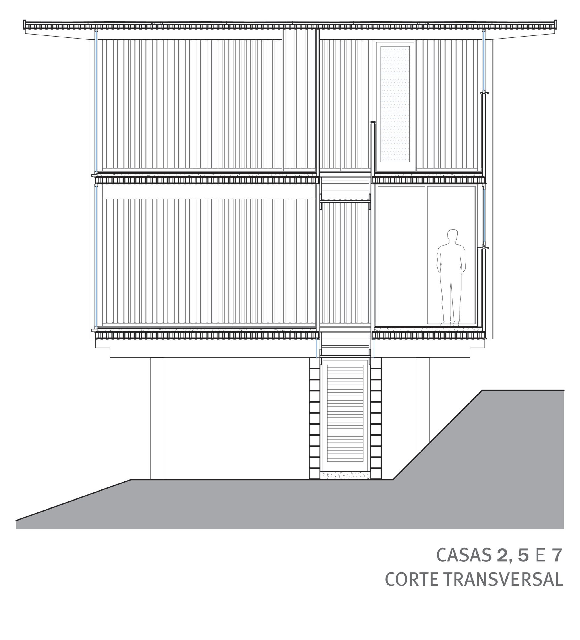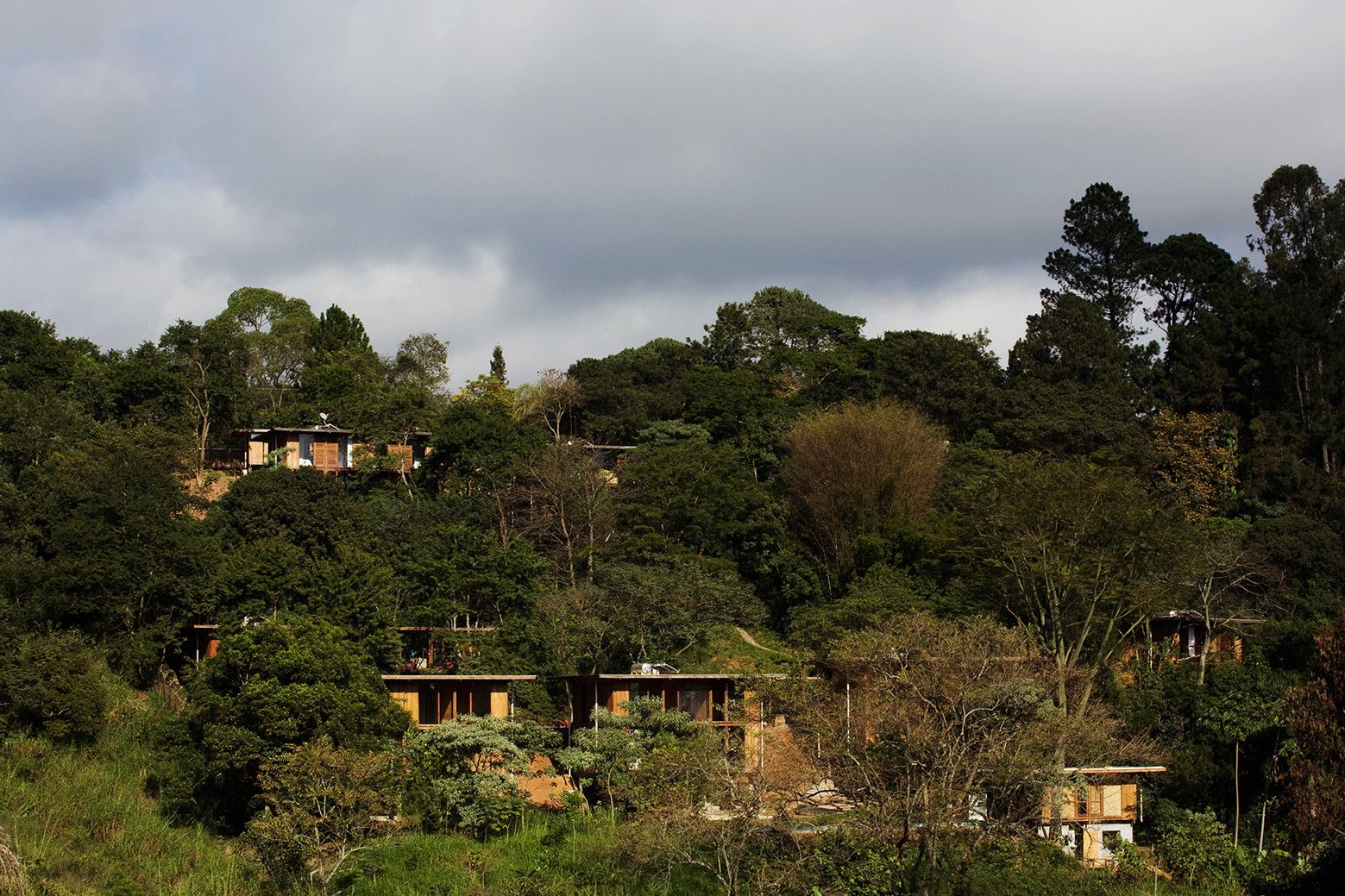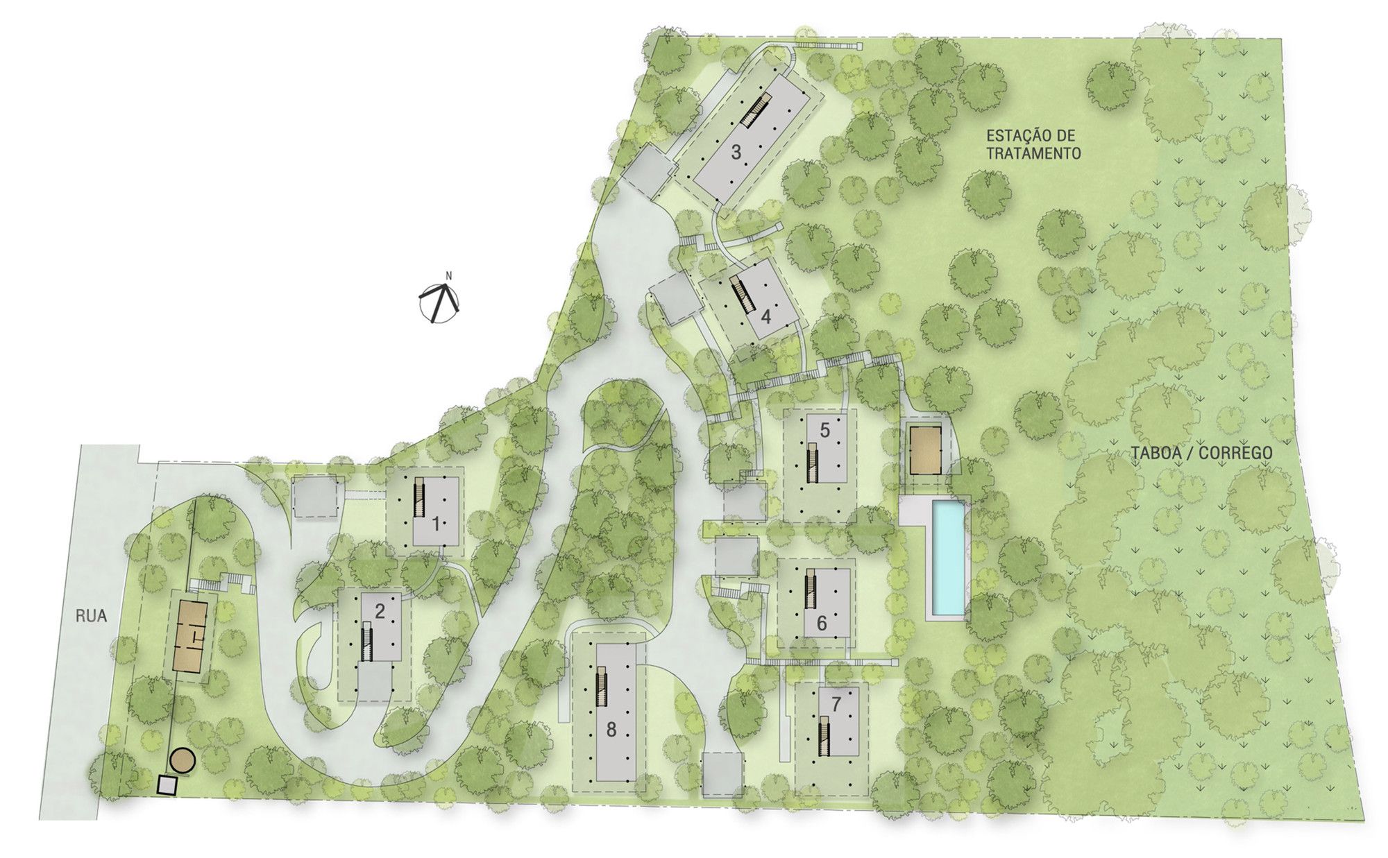 The site is placed among dense vegetation on an East facing, 35% slope and the implantation sought to maintain the natural terrain to the greatest extent possible. The eight houses are elevated off the ground, creating terrace gardens. The trees were preserved and new ones will be planted, reinforcing the native flora.