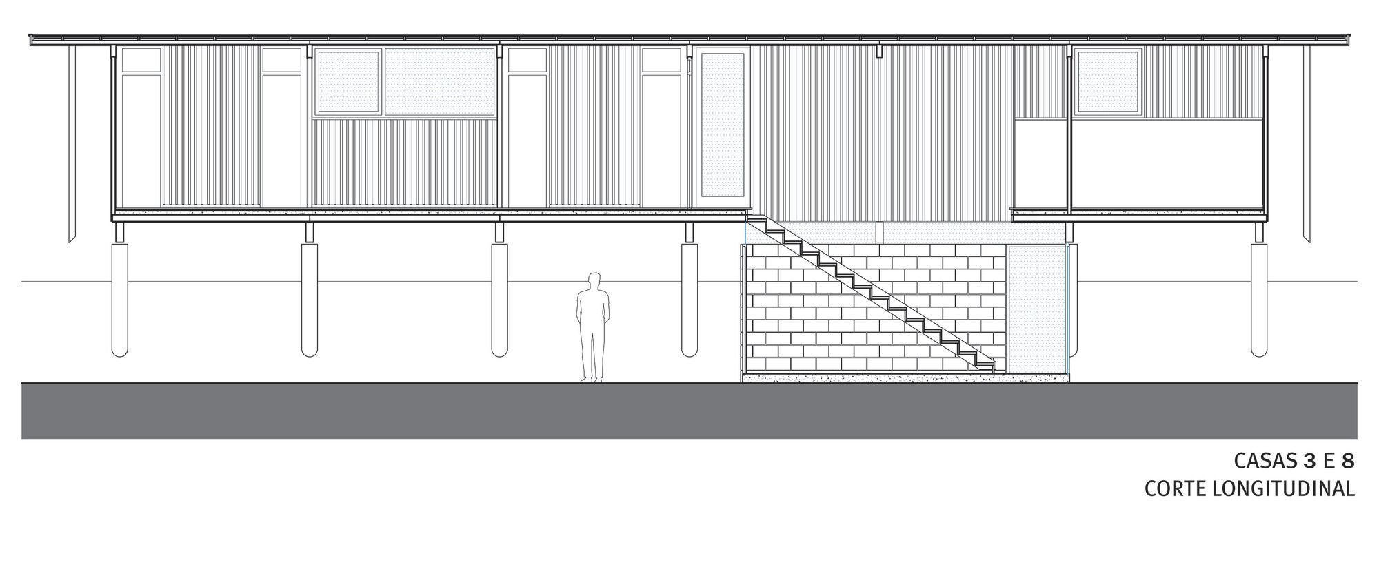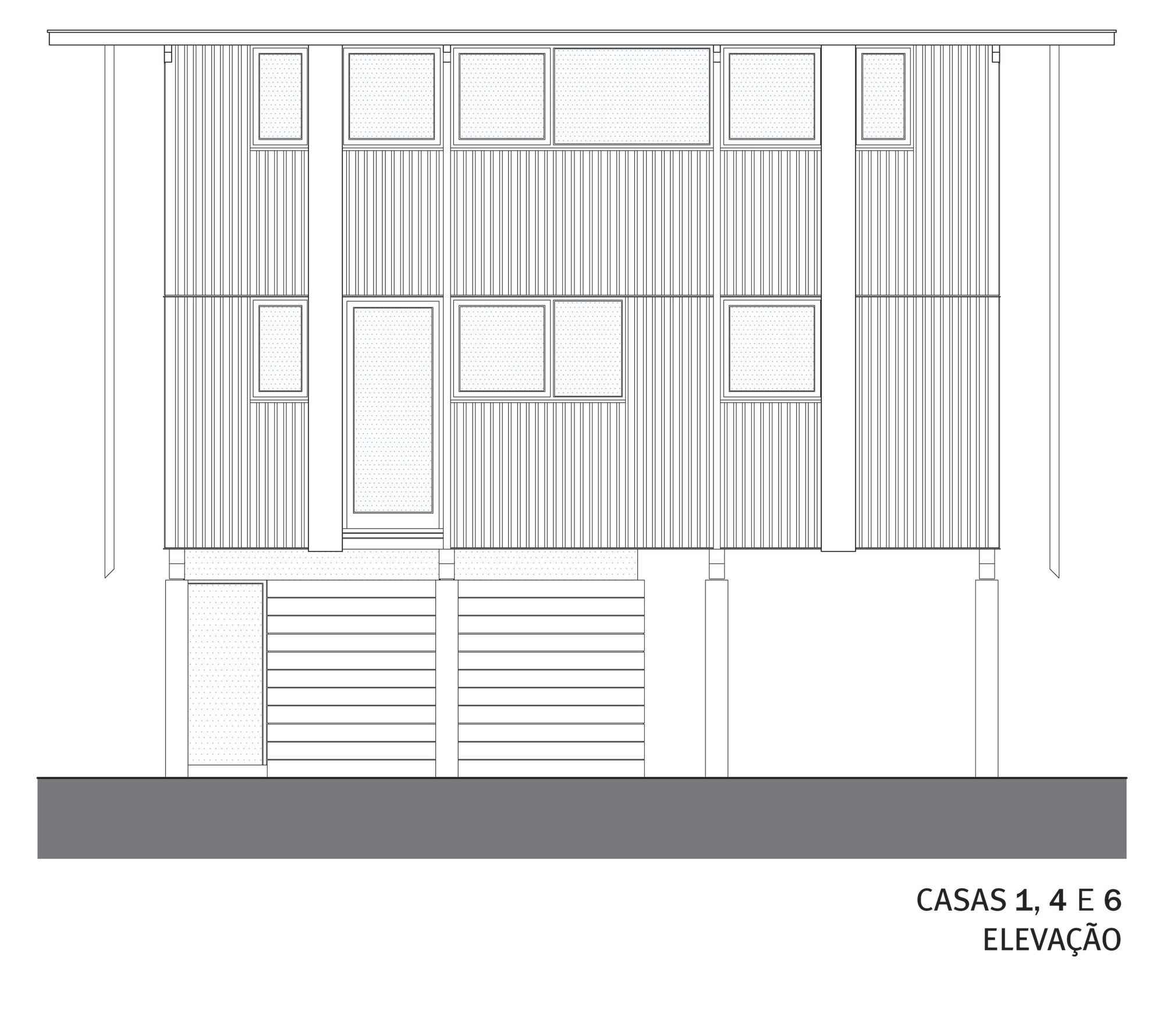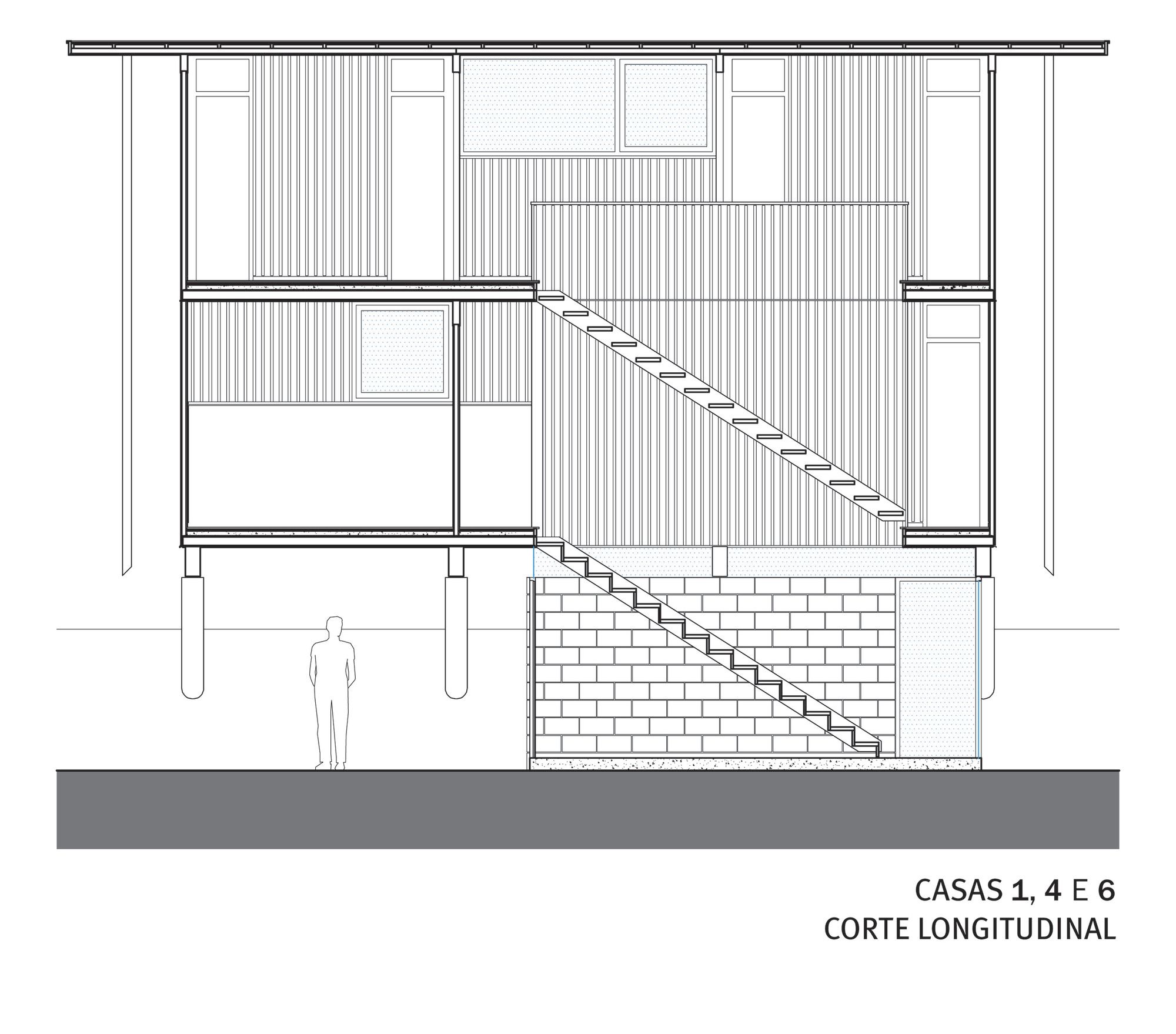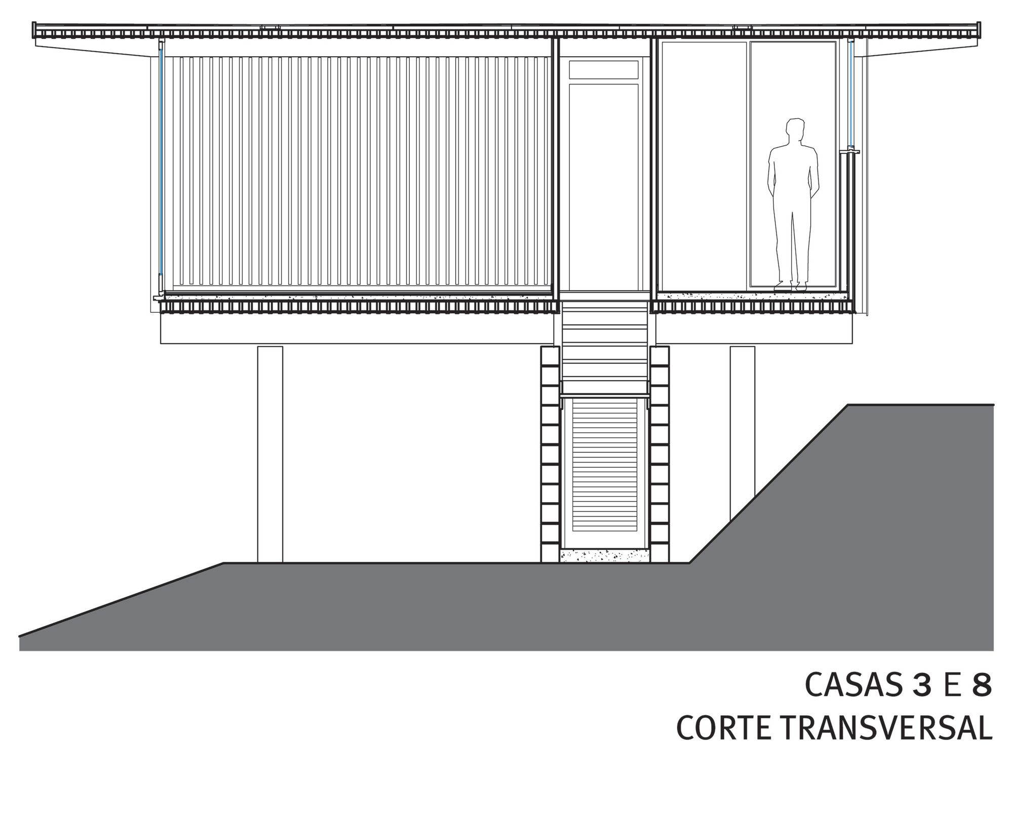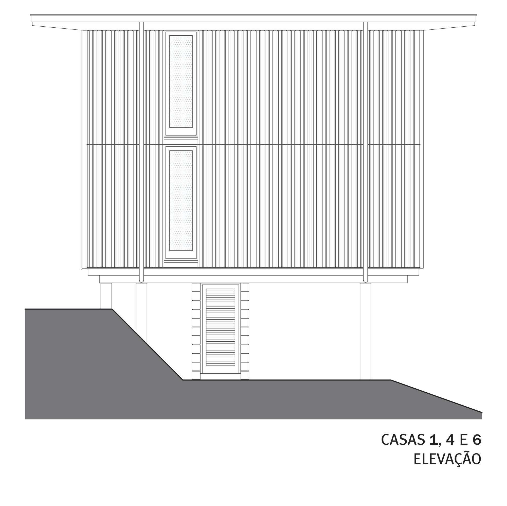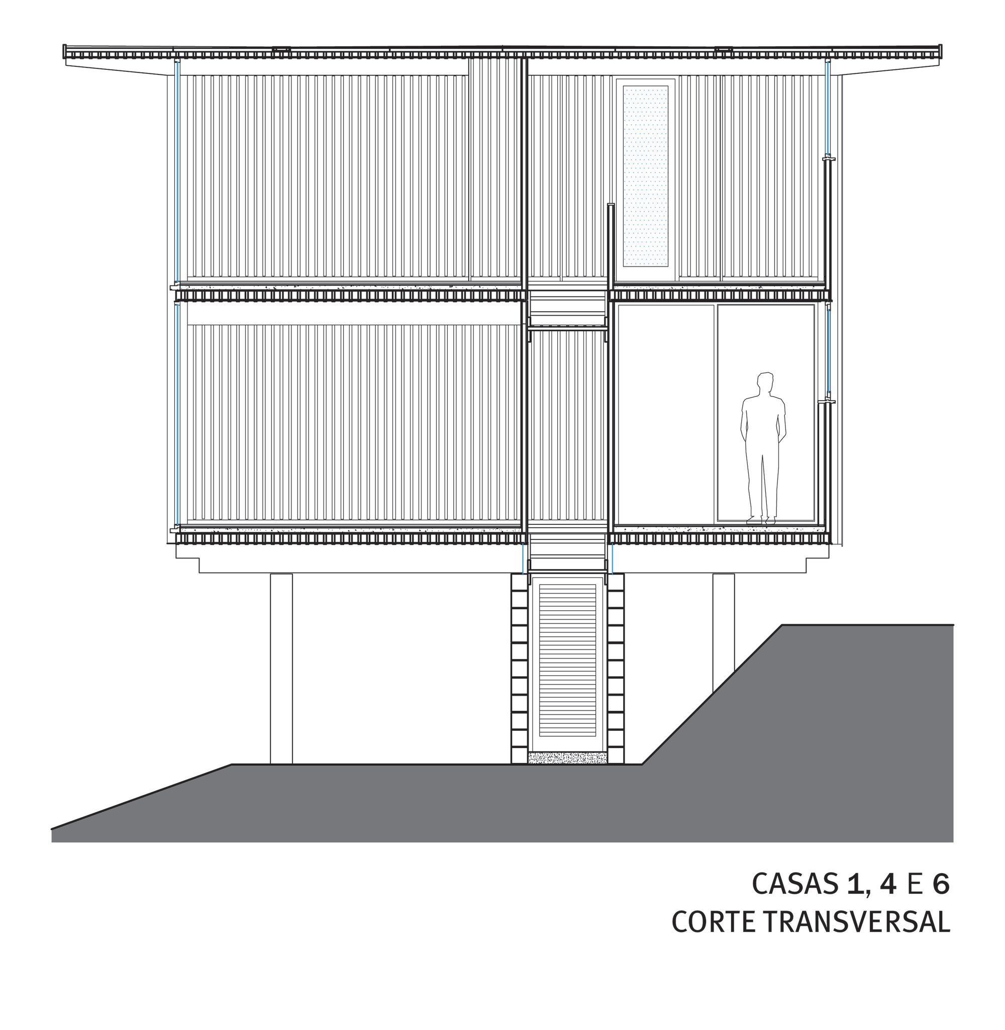 The site is placed among dense vegetation on an East facing, 35% slope and the implantation sought to maintain the natural terrain to the greatest extent possible. The eight houses are elevated off the ground, creating terrace gardens. The trees were preserved and new ones will be planted, reinforcing the native flora.