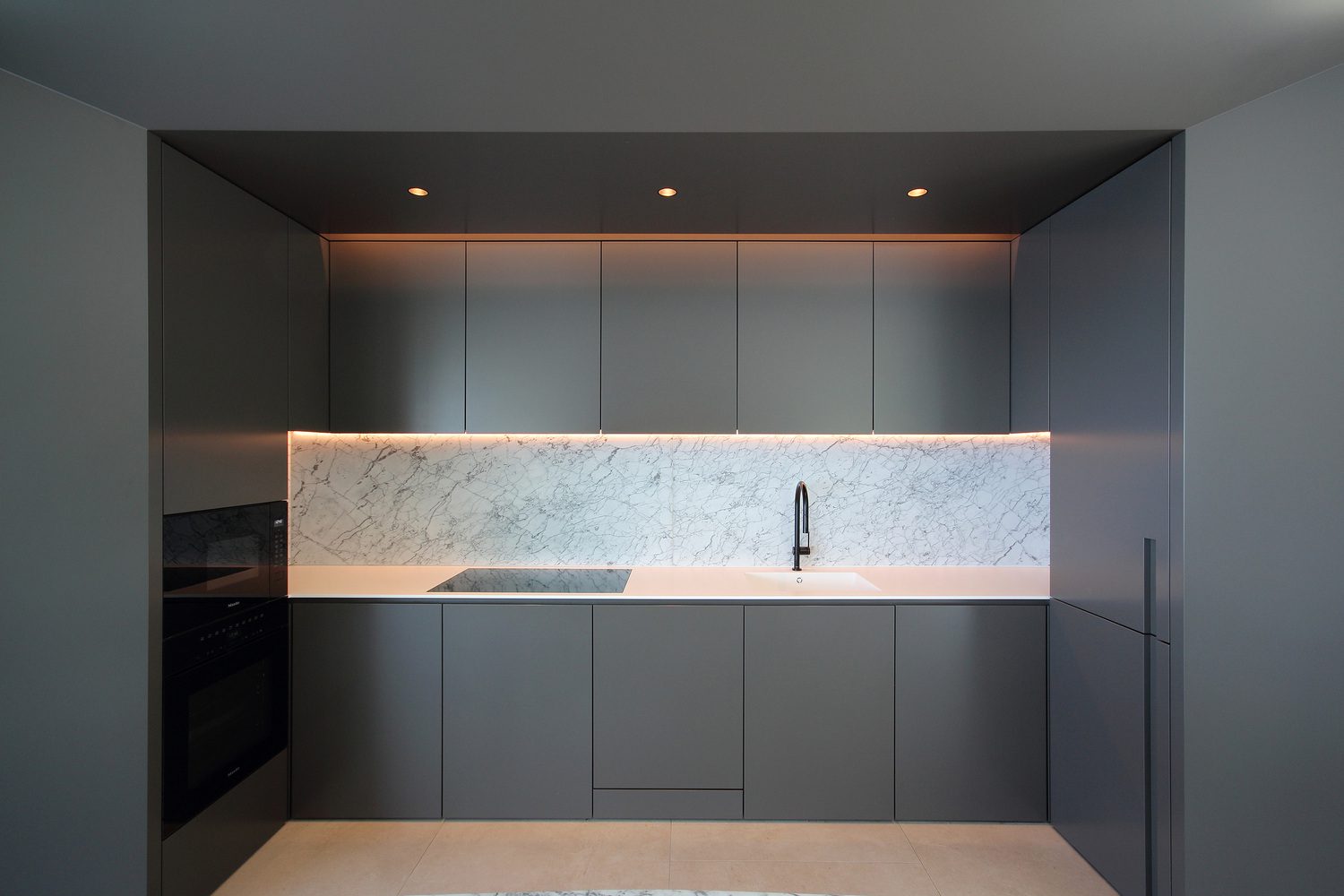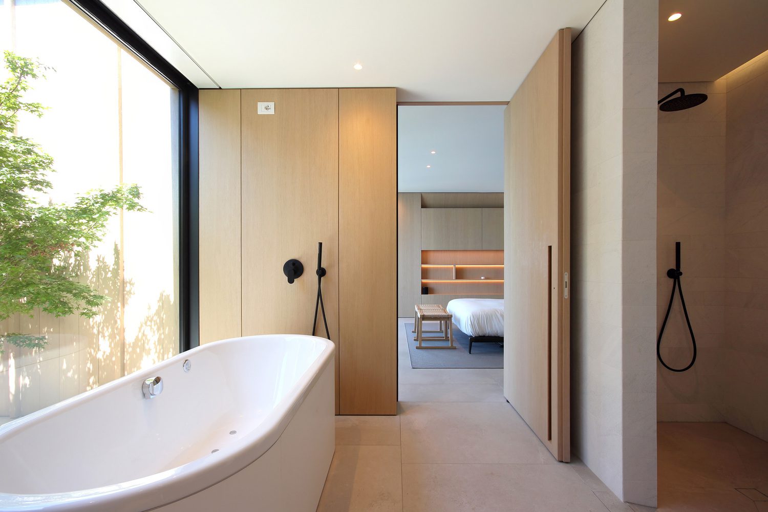 The interiors include fully custom-made fixed furniture, like the oak “boiserie” that covers the walls, the marble vanities in the bathroom or the open kitchen that integrates various technical equipment into its structures. The furniture floats in the rooms to intensify light and and contemporary appearance of the interior. Privacy is managed through the use of retractable roller blinds which, perfectly integrated on the perimeter of the internal ceiling, could filter the view from the outside.