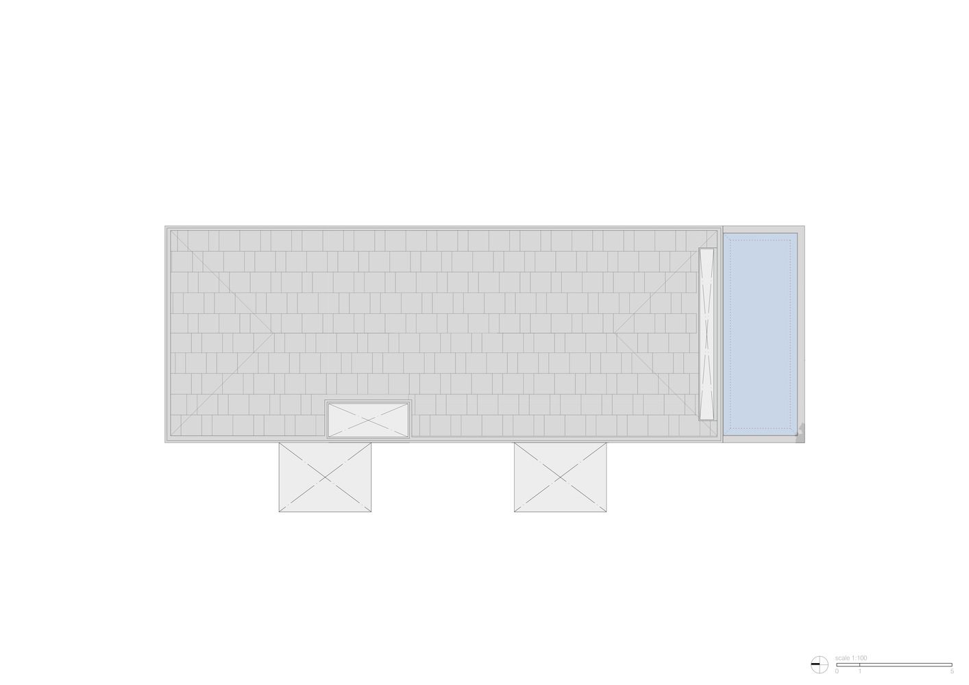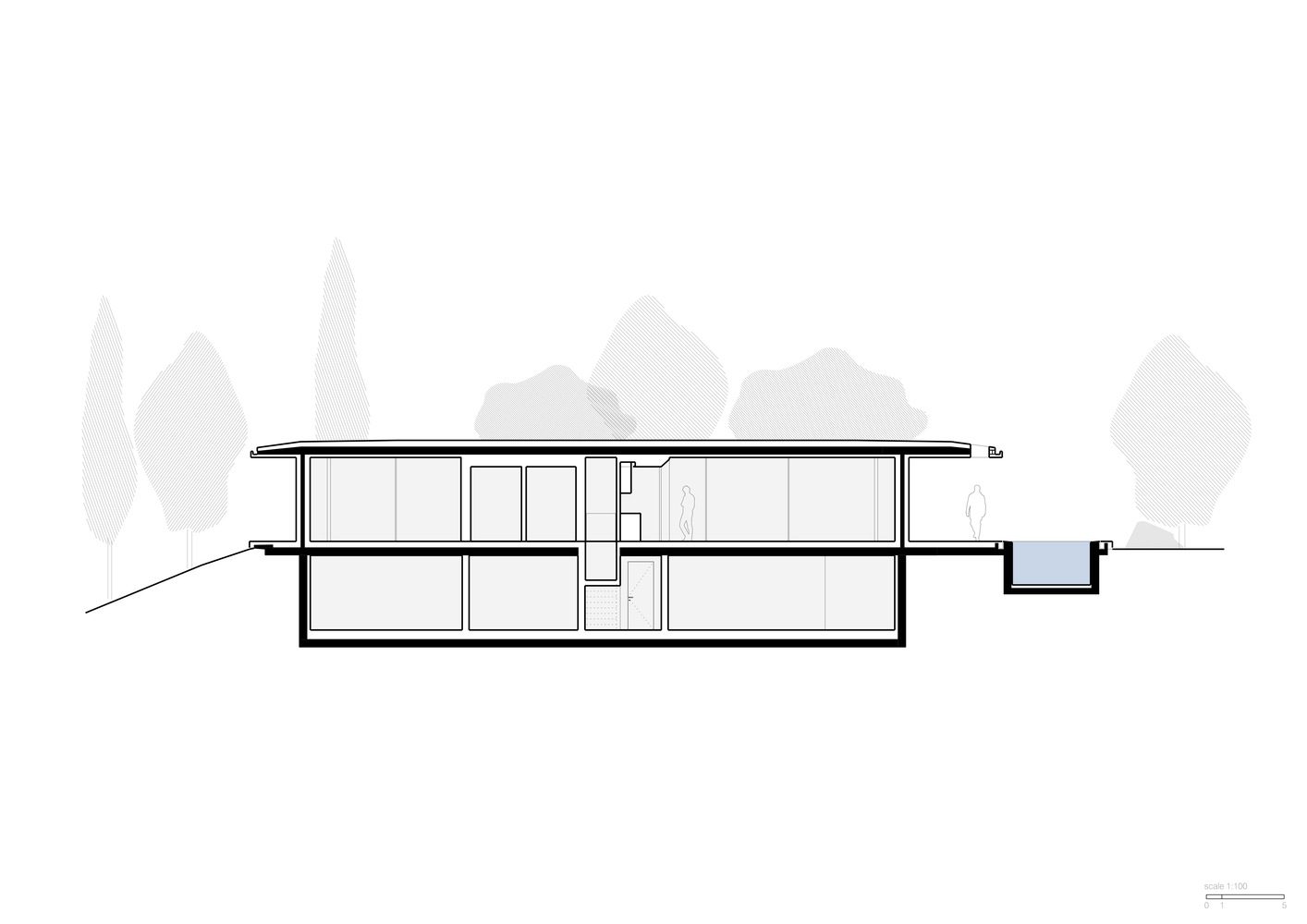 It is a one-storey pavilion where the living area is on one end and the Master Bedroom on the other. The service spaces are in the center, where a staircase descends into the underground areas that have been designed from a careful study of the natural slope. Two large patios, opened towards the lake, allow the rooms on this lower level to enjoy the view and natural light, and they are shaped on the slope of the terrain.