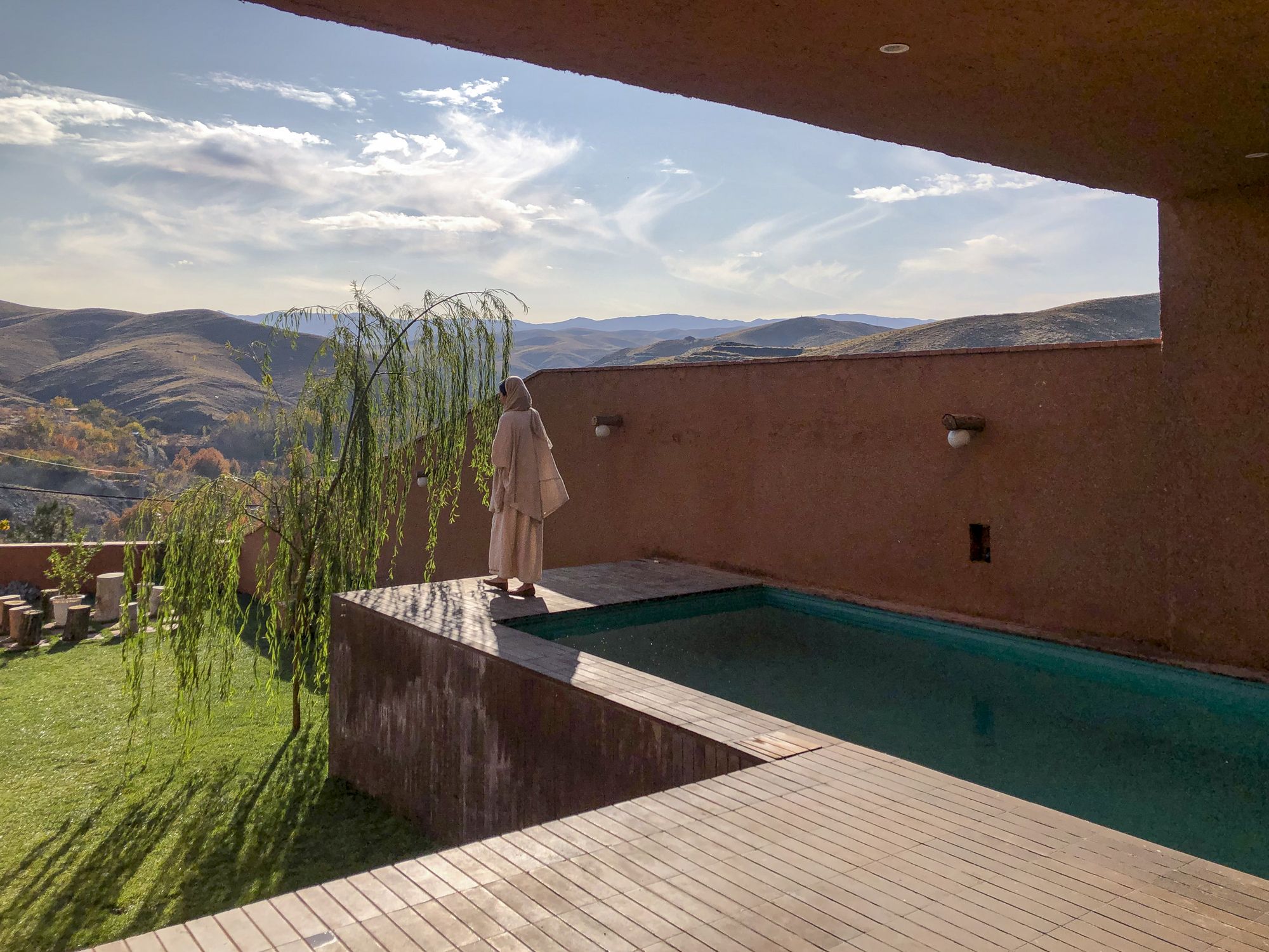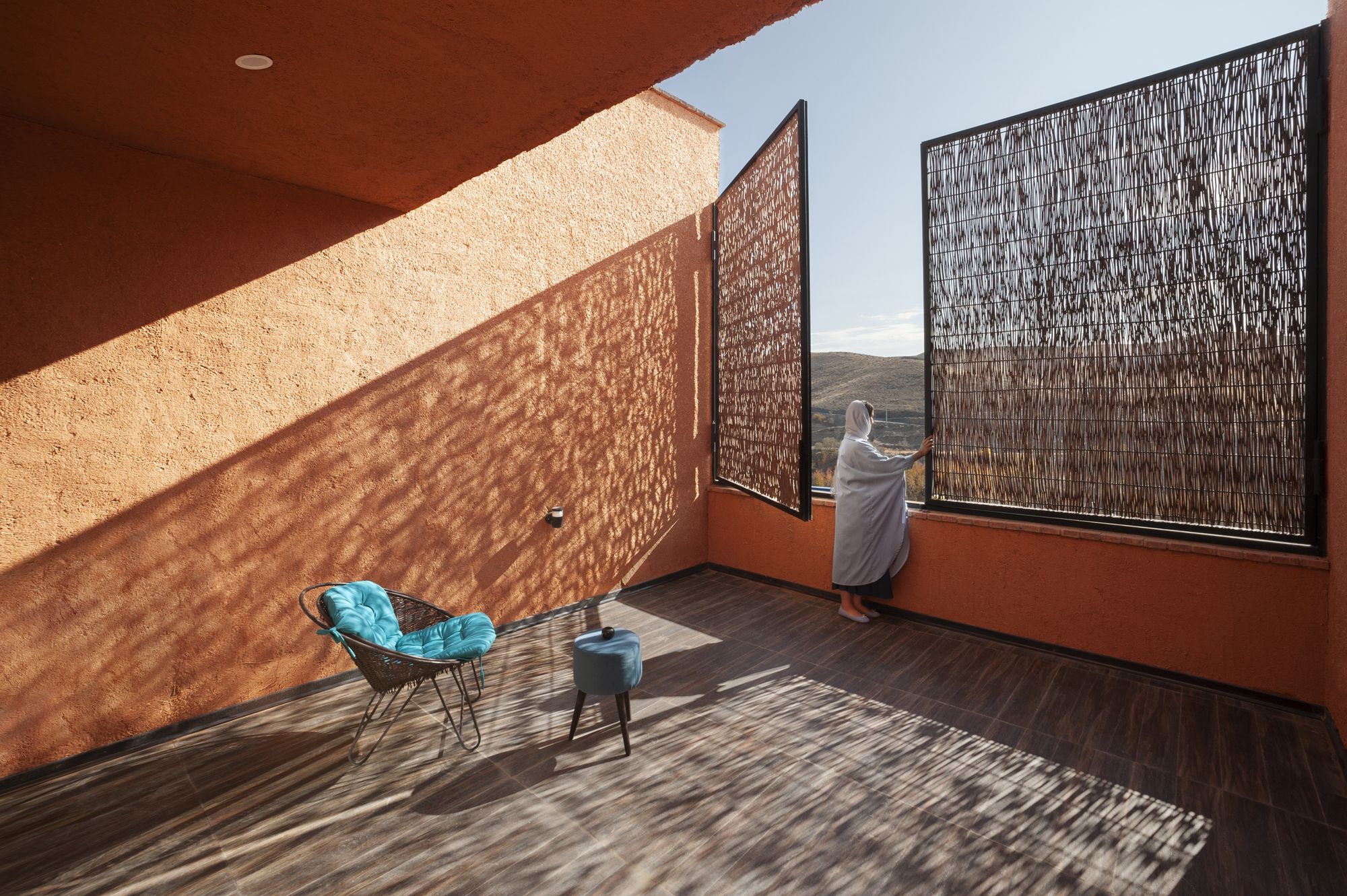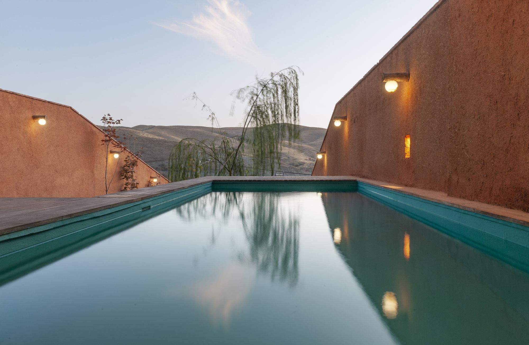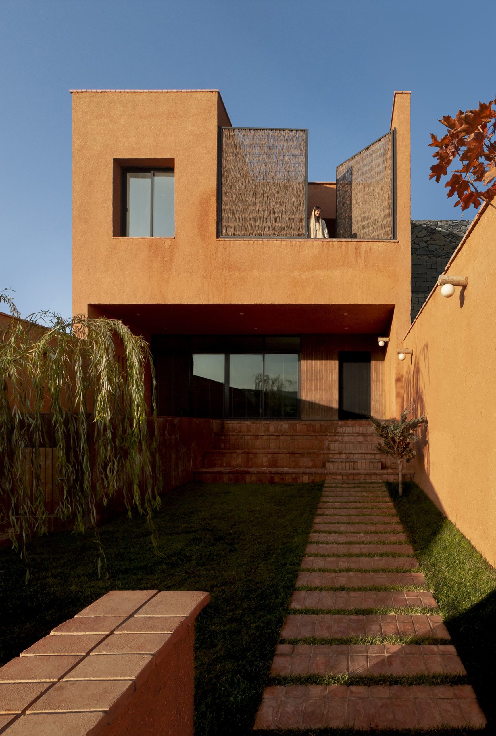 Porches play a key role in reducing the mass of the volume, to strengthen its relationship with the context by providing adequate visibility and sunlight. The extension of the green courtyard forms a relatively deep porch, which defines the covered living space as well as the relative lateral privacy for the pool. Also, the courtyard of the first floor, which is to provide proper privacy, an opening and closing structure from the native plant cover of the region, called “Judas tree (Arqavan)” has been used, which is one of the handicrafts of “Torqabeh” region of Mashhad.