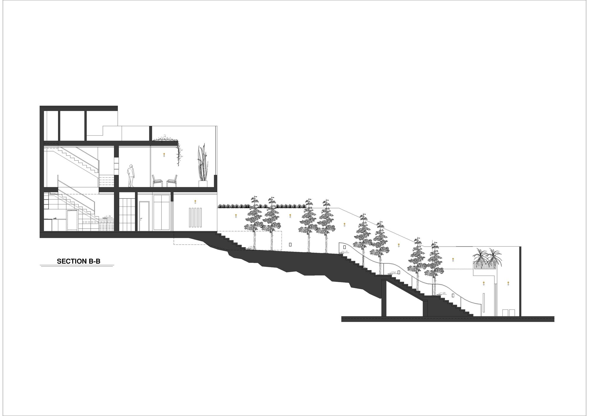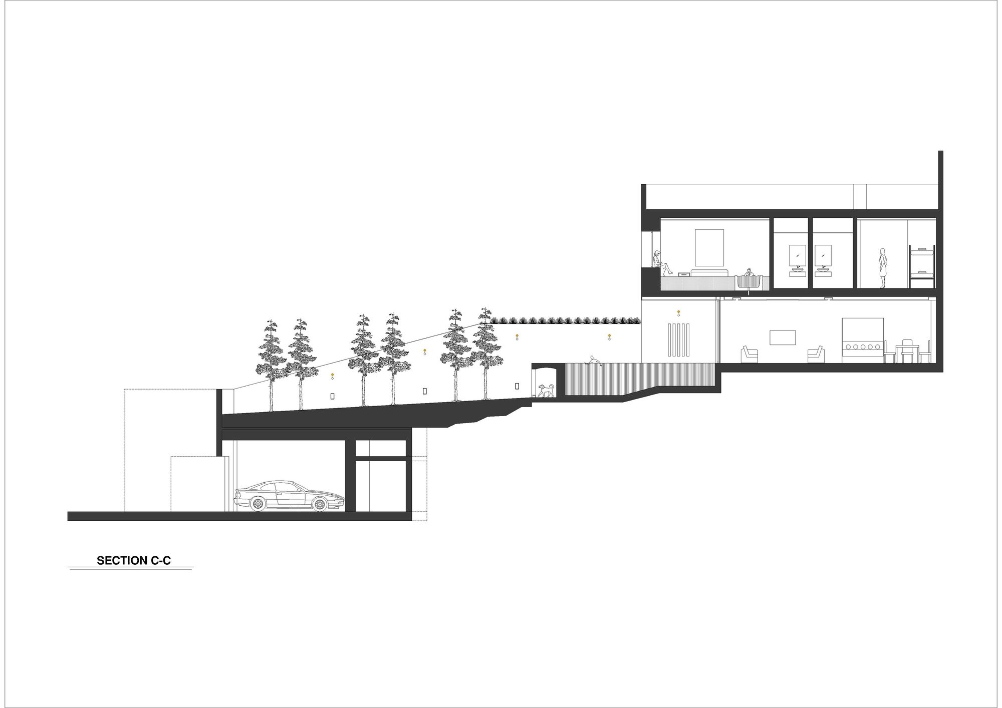 Due to the limited land area, severe topography, and the summer climate of the region, designing through the section was used as the main process to form the basis of the relationship between context and volume to solve its problems. Placing only two volumes (parking-entrance volume and residential volume) on two different levels, and establishing a relationship between them through a green space and roof garden, presented a suitable response to the program, landscape, and open space of the project.