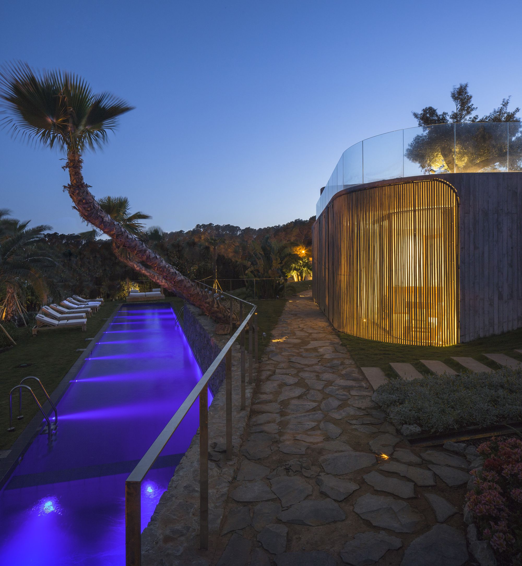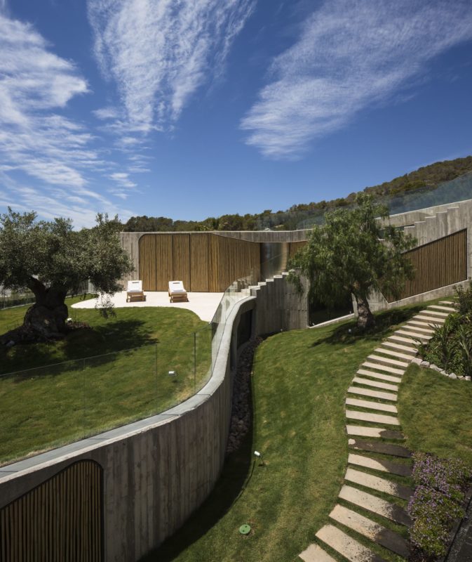 The Villa shape follows the natural slope of the ground and it is lying perfectly on the hill, in a shape the reminds of an amphitheater, surrounded by nature. The use of simple materials like irregular board-formed concrete and drywalls underlines the desire to avoid a popular image of luxury, while instead pursuing a connection with the island, the ground, and its tradition. The result is thus informal and hospitable, according to the lessons of Busiri Vici, Couelle and Vietti.