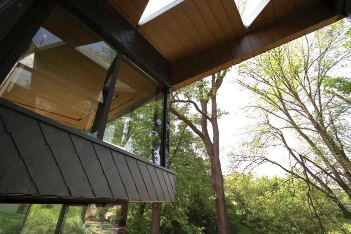 The spaces of the house are therefore organised around external atrium. The combination of the atrium, the roof of the atrium and the house and existing trees around the house create a sustainable concept such as: The half – transparent and half – non transparent ventilated membrane roof of the external atrium creates and airy rain-proof external space. In combination with dense greenery of surrounding trees atrium is cool in summer and provides rain protection.