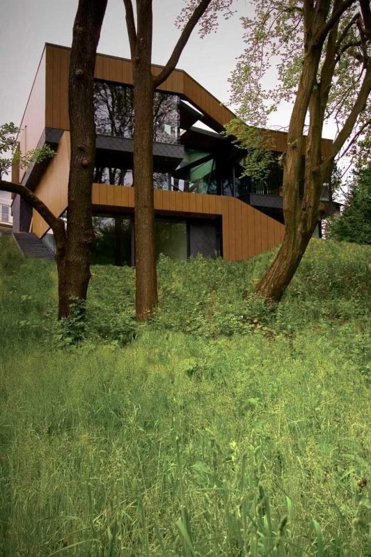 The private client for Villa Old Oaks convoked a proper architectural competition for five invited offices,the idea being to choose an architect for his new residence. The residence is situated in a new neighbourhood of six larger villas.The unique feature of the site is a splendid view of a stand of oak trees that are over a hundred years old.