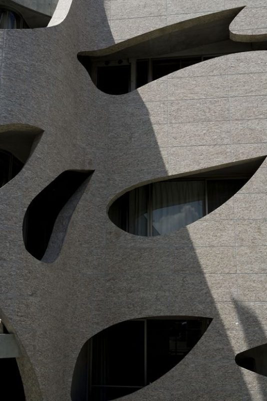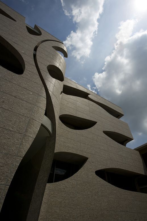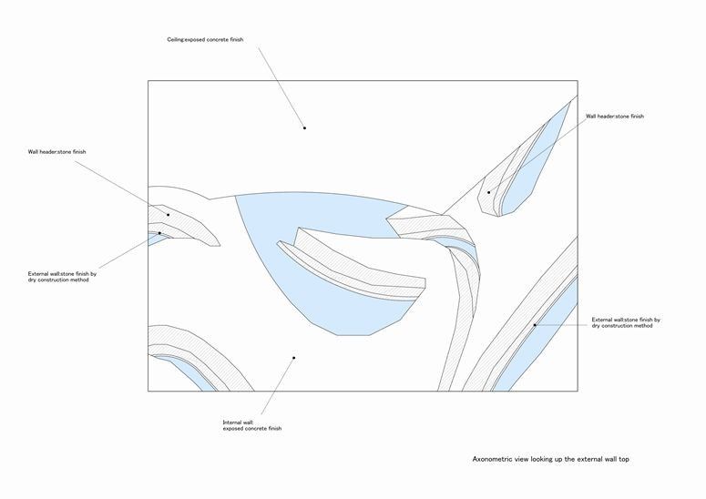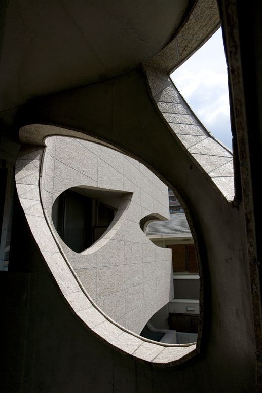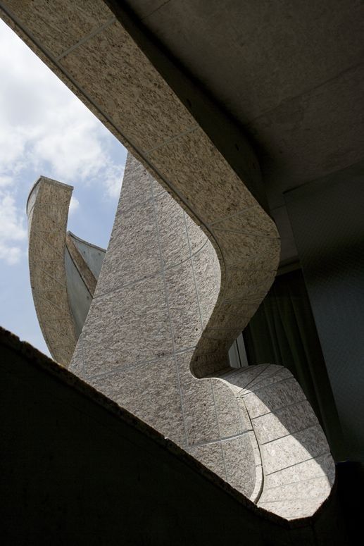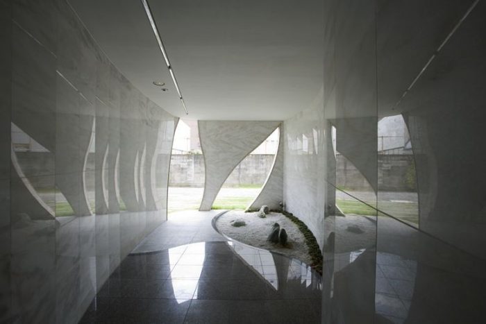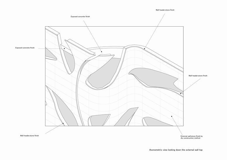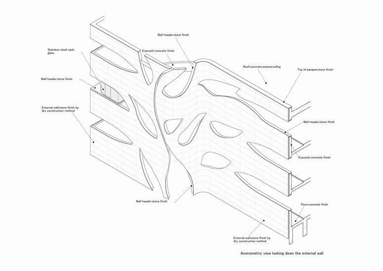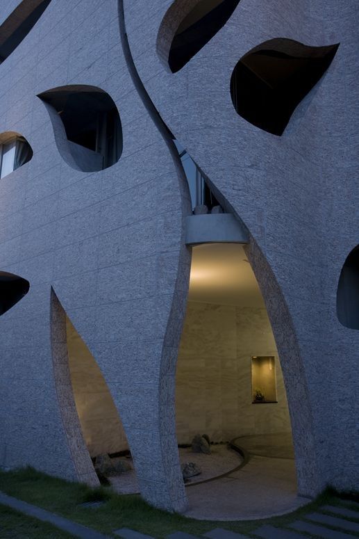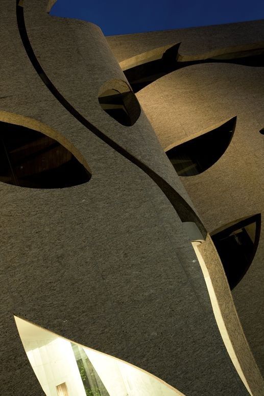 The architecture is covered with a wall in which holes are cut. The shape of the holes resembles a trunk, leaves, a root and bulbs. It also can be seen as clouds floating over the trees. Concrete shape which is based on nature turns into a hollow cave, light, and sunbeams filtered through trees.