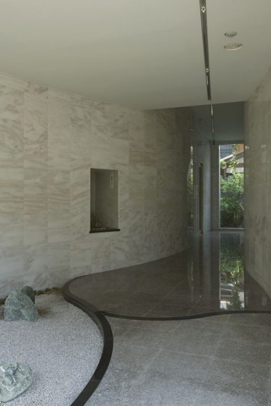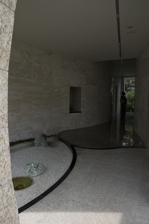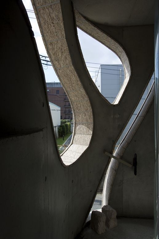 Since curved holes are made on a carved wall surface, it is physically inevitable that the section of holes is also twisted. This distortion resembles the shape of plants and the organic and free style of nature. The entrance to the house is from the root carved into the center of the front wall. An inner pathway peculiar to Kyoto can be found there. An inner pathway is a narrow corridor which runs from street to street and from lot to lot.