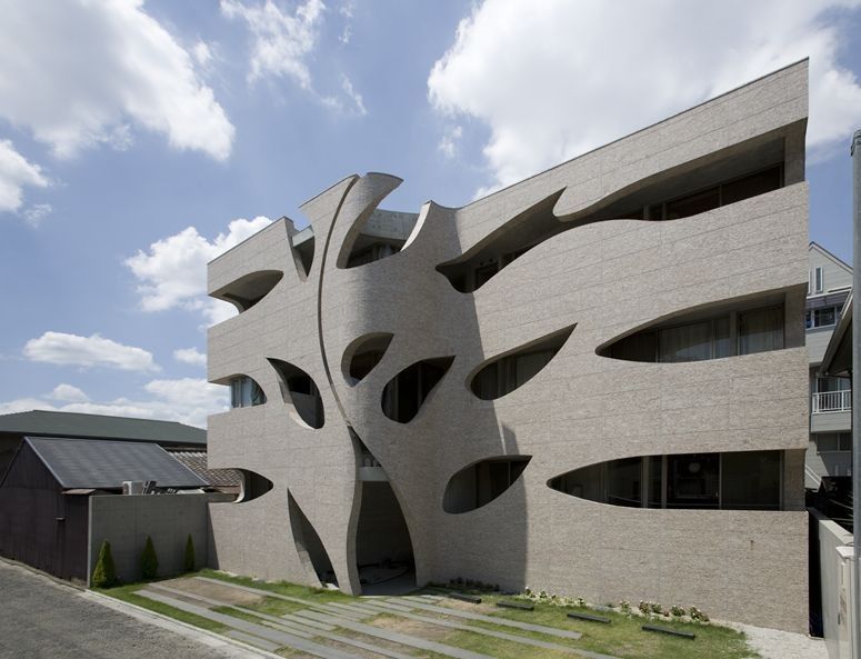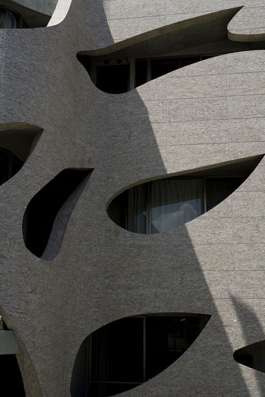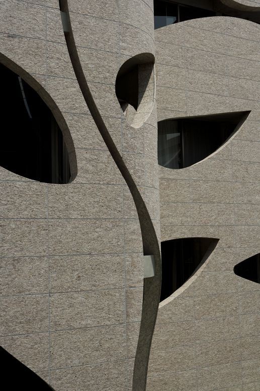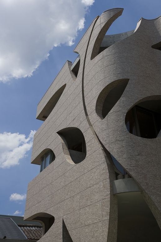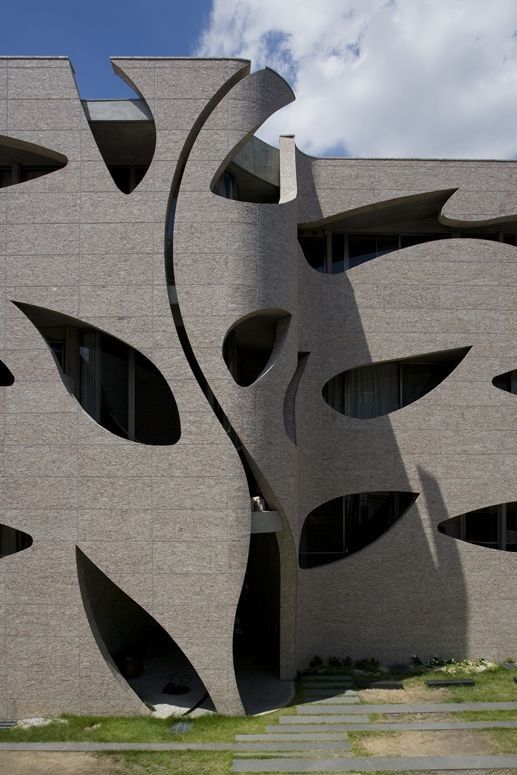 The idea of windows like sunbeams filtered through trees has developed with the following methods: lined up balconies of average collective housing are completely hidden here. there is no balcony for each room. the ceiling height of one room is raised. dwelling units are elevated one meter from the ground. floor level of entrance and apartments is different, center of the wall surface is curved ,the center of the façade of the architecture is sculptured a curved winding slit is made on the curved wall surface, the shape of the holes matches with the winding slit. the result is one shape of a plant growing roots undulating from it.