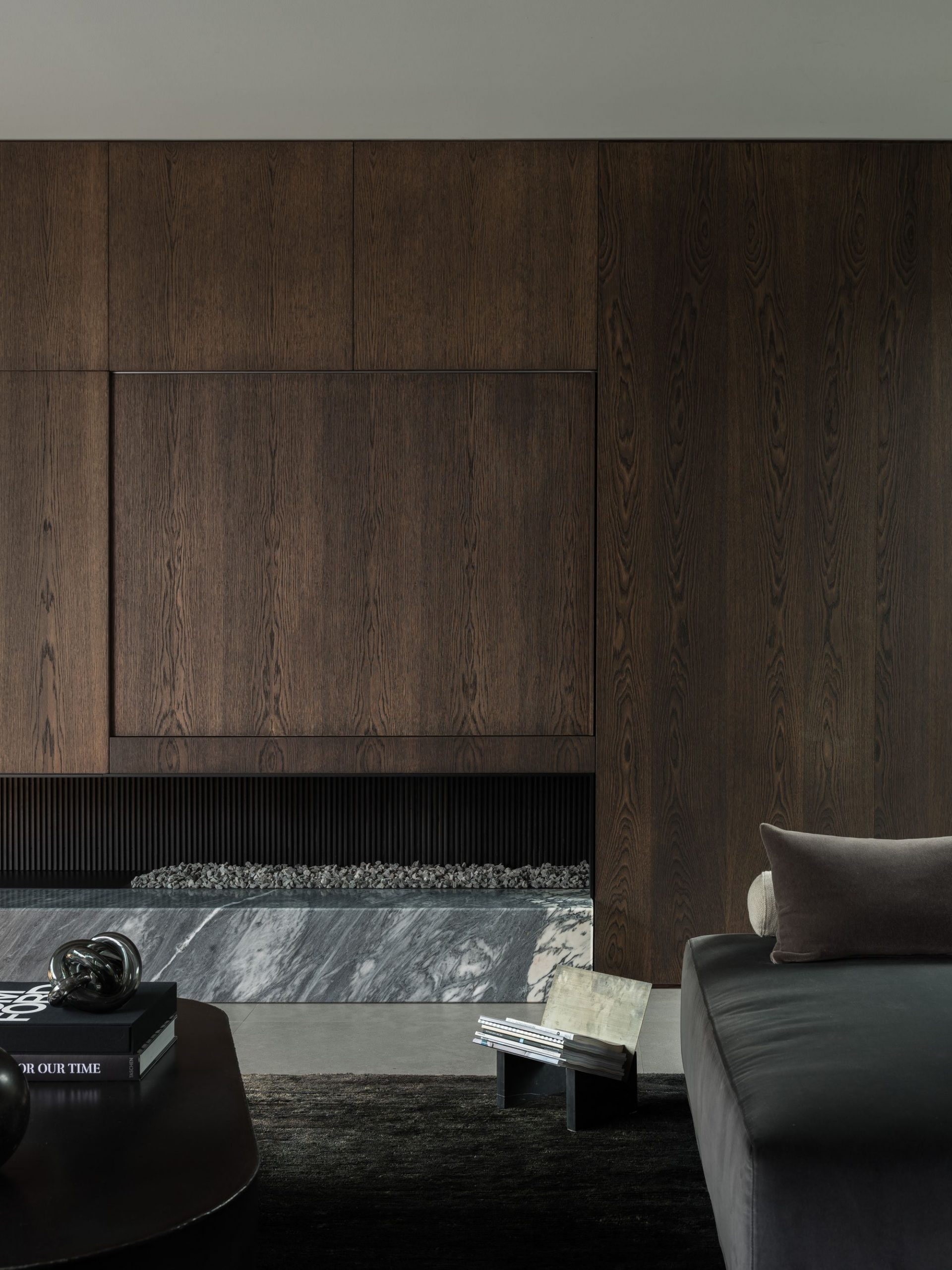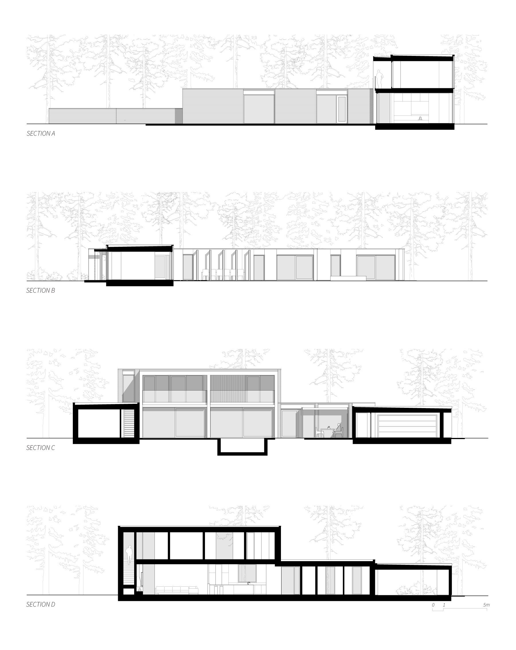 A great deal of the interior fittings are designed by the architect‘s office and made specifically for the site. While each space has its own character and is adapted to its function, the material palette is cohesive, presenting only a select few materials. The dark brick and dark gray aluminum of the exterior stand in stark contrast to the interior, in which warmer materials, such as oak and cedar, are introduced. Across the house, a consistently high level of detailing ties the material palette together.