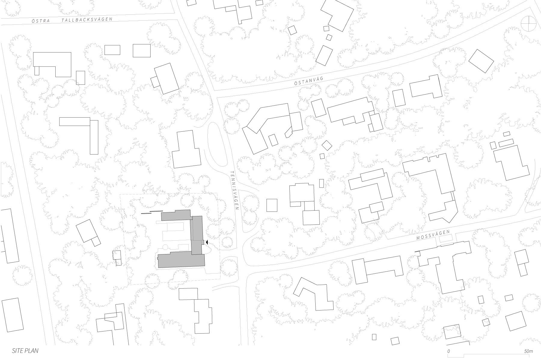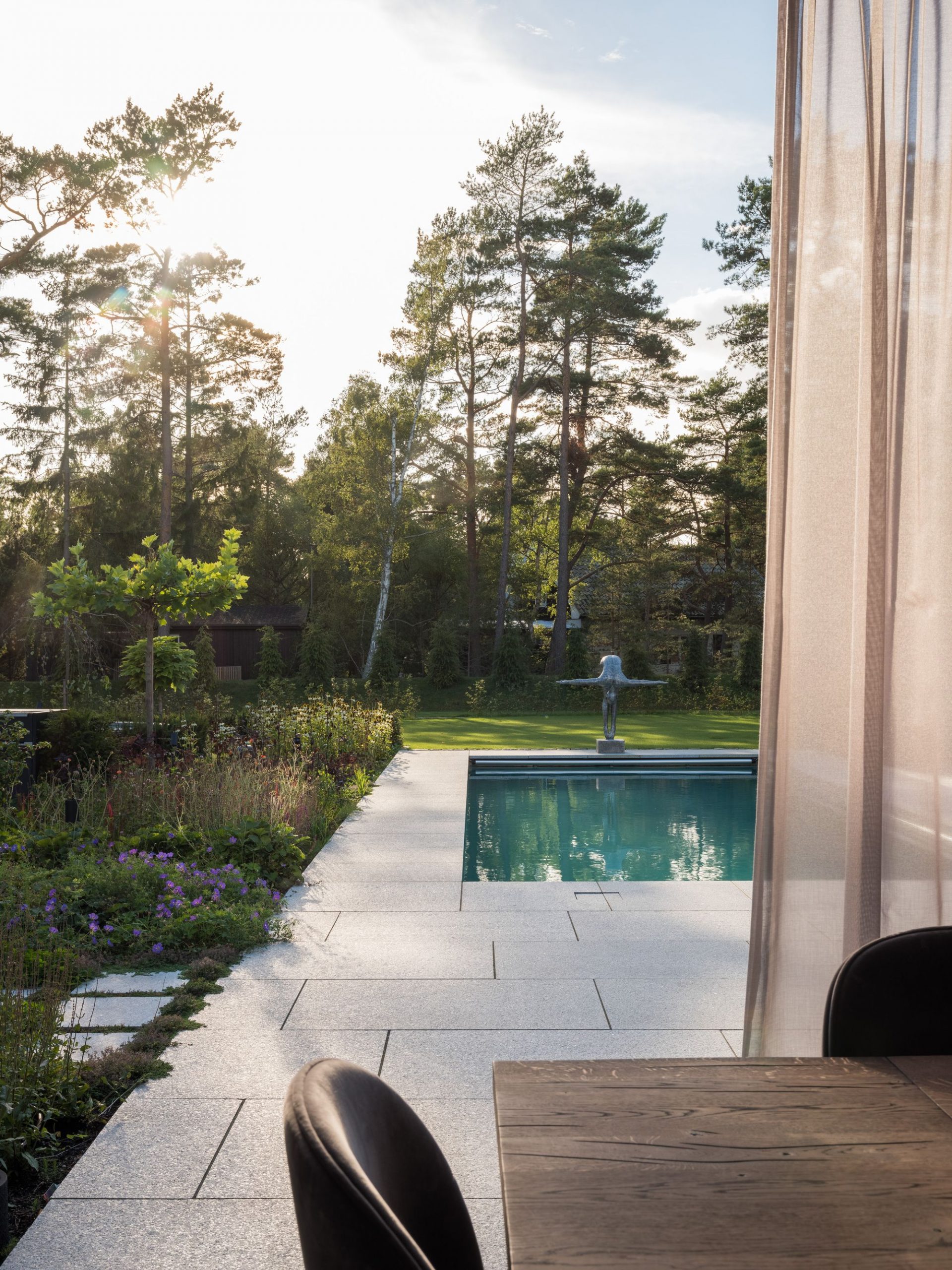 Villa Tennisvägen comprises several interconnected volumes arranged in a U-formation, which envelop an inner garden with an open pool area framed by greenery. From the outside, the house has a cohesive and relatively closed character, while the interior feels welcoming and is characterized by light, space, and generous views of the garden and surrounding nature.