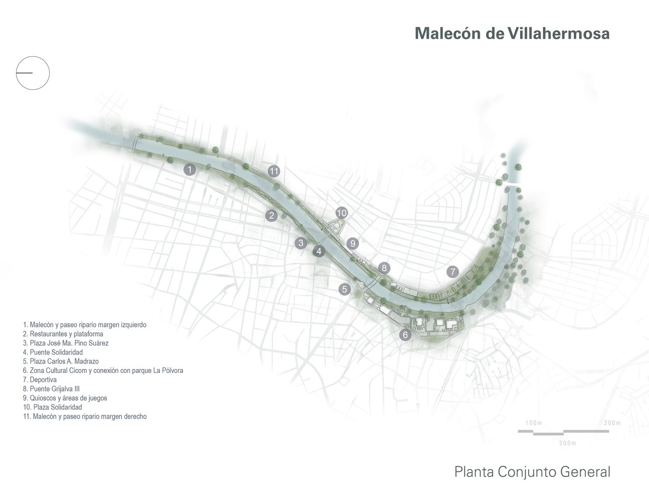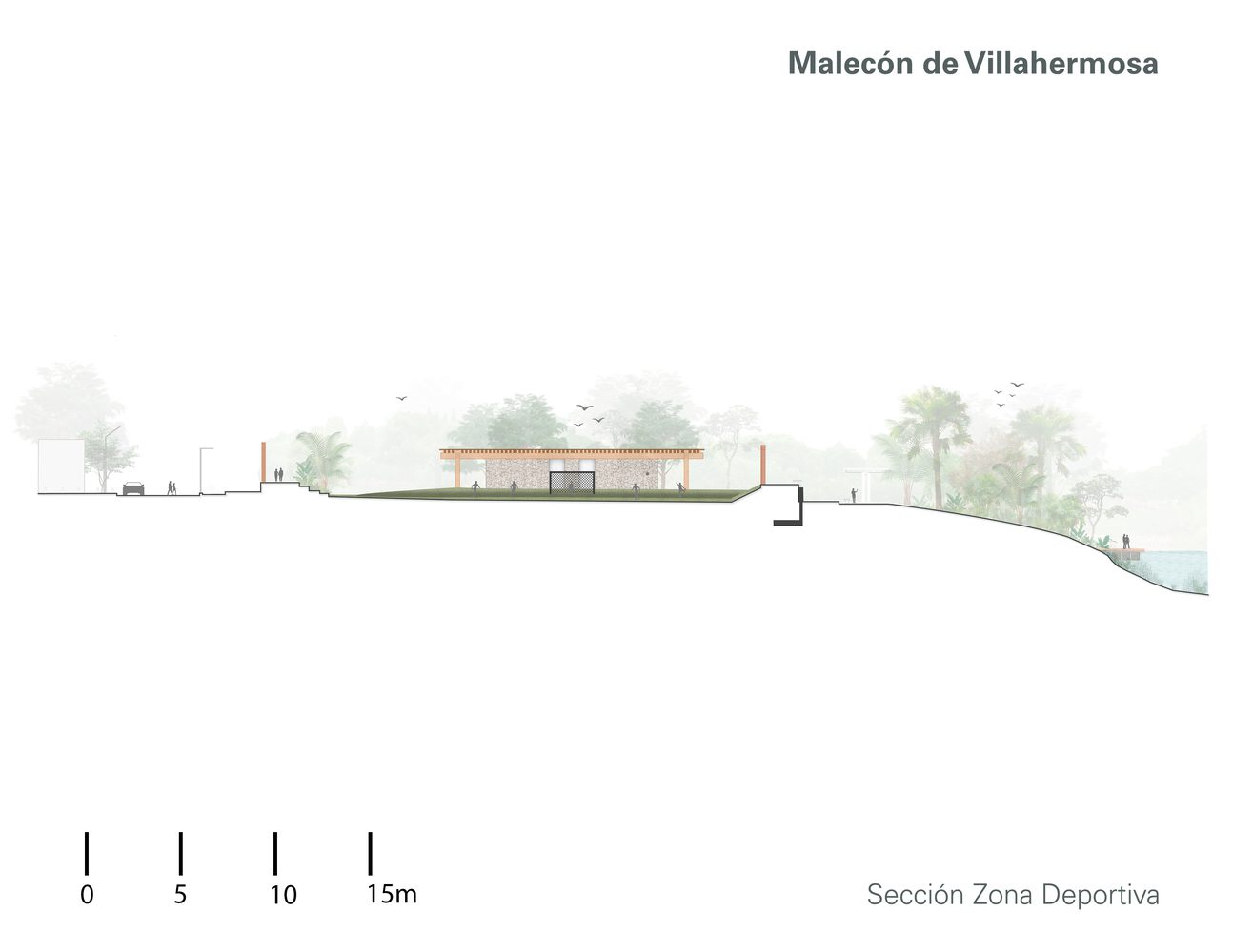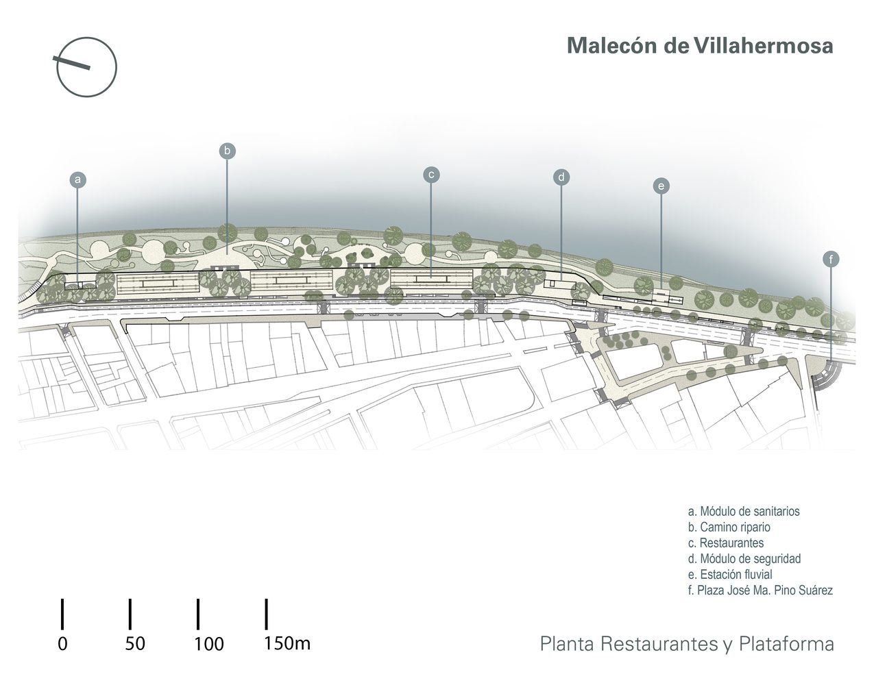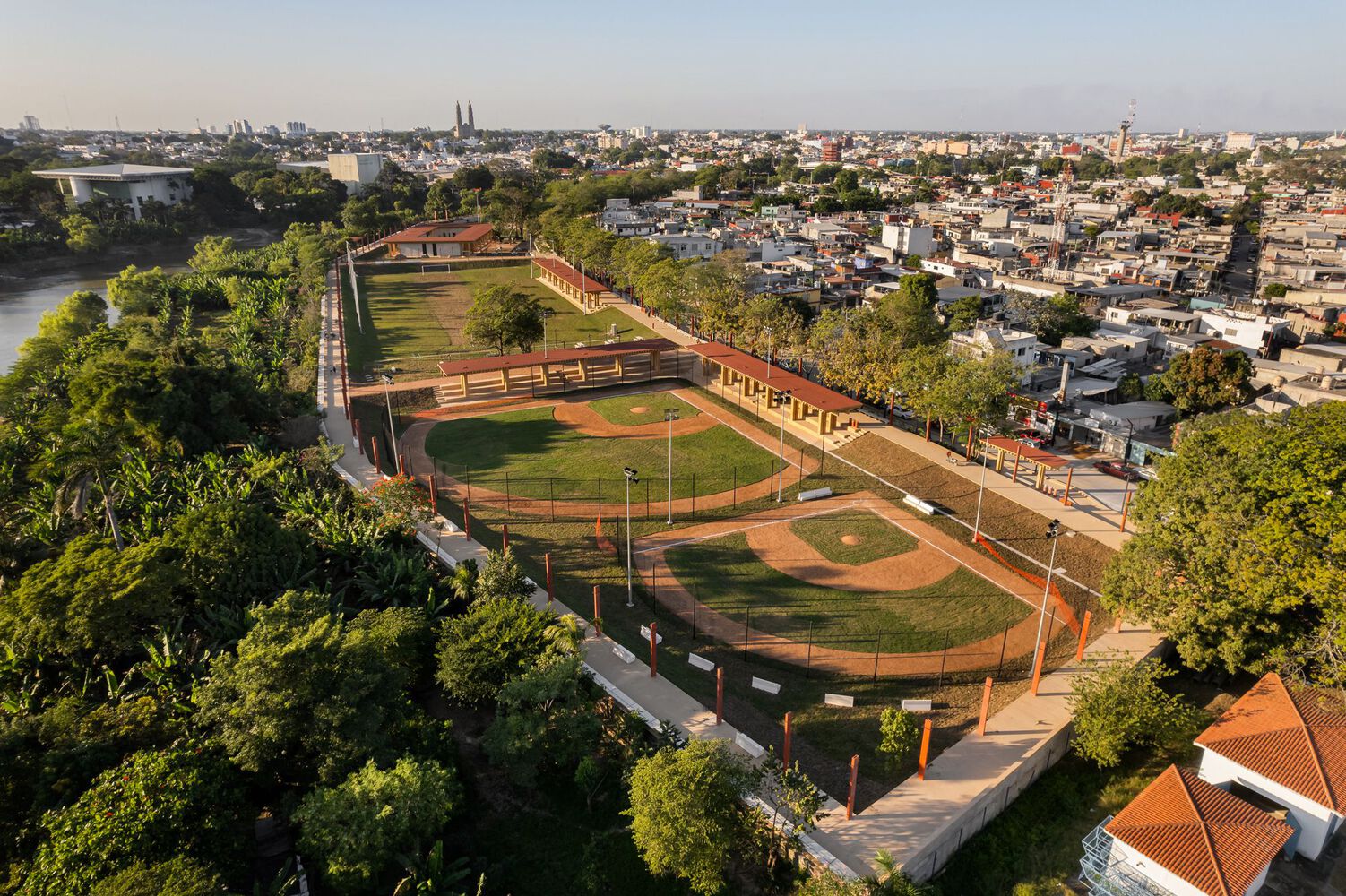 Spanning 6 linear kilometers on both sides of the river, the urban and architectural proposal for the Malecón de Villahermosa was guided by a master plan promoted by SEDATU. This plan included the creation of a pedestrian walkway with panoramic views of the river. Additionally, various recreational and sports areas were created, such as baseball fields, basketball and soccer courts, a skatepark, playgrounds, pavilions, and three buildings for restaurants and kiosks whose designs harmoniously integrate with the natural landscape and generate employment, attracting local, national, and international tourism.