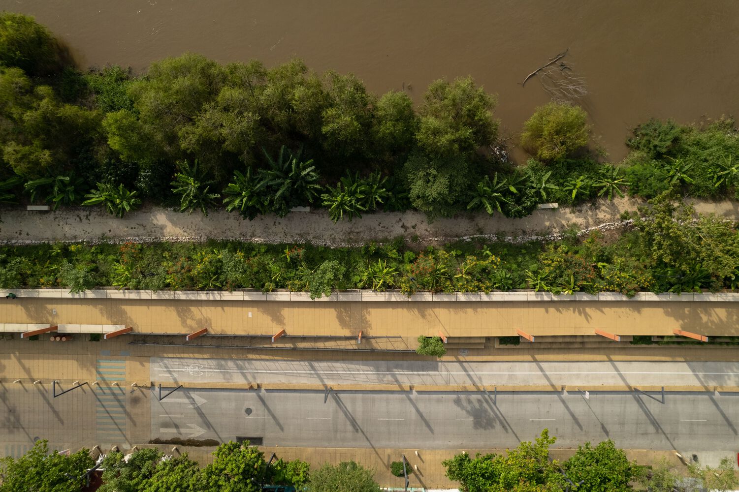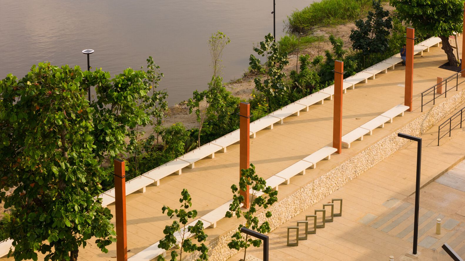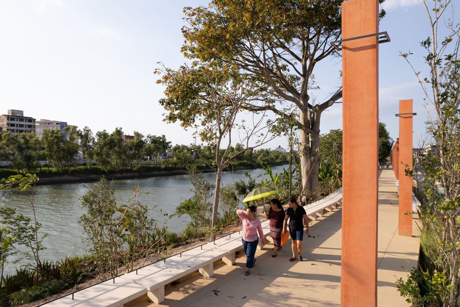 The intervention also includes the restoration of more than 125,000 m2 along the riverbank. This area was reforested with low-maintenance native vegetation and equipped with playgrounds, benches, tables, contemplative areas, pedestrian walkways, public lighting, and parks designed to coexist with the river, even when it rises. These zones were conceived as spaces that can flood during one season of the year and then resurface for the inhabitants to enjoy and explore again. The vegetation helps regulate the temperature and serves as a source of organic matter for the river.