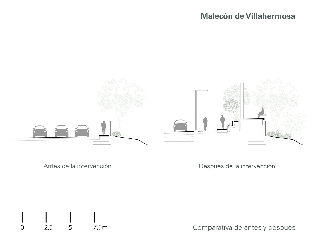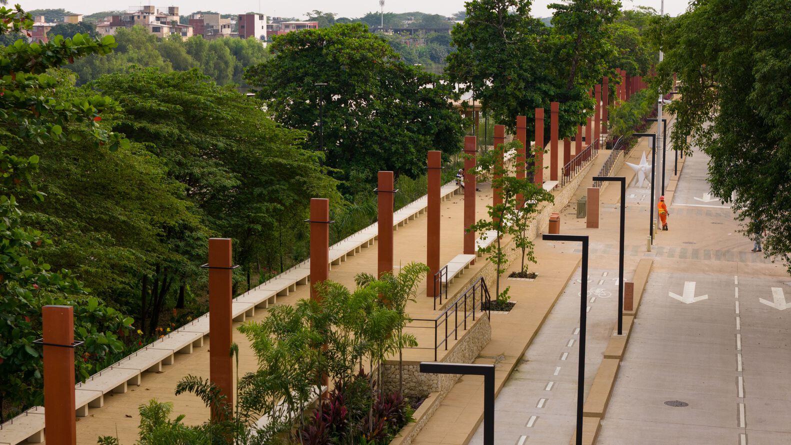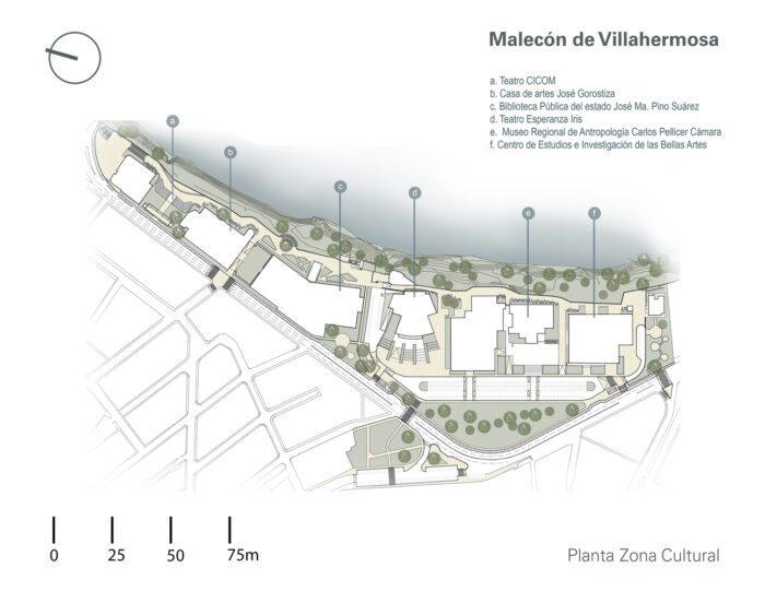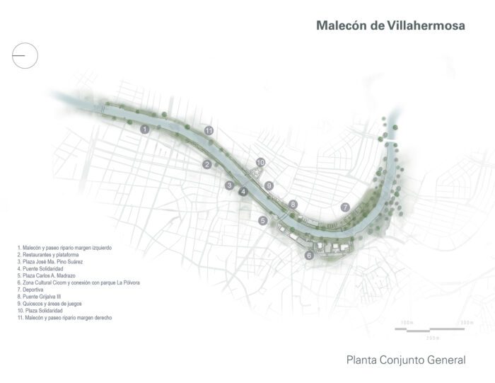 The cultural zone was rehabilitated, with the facade of the Regional Anthropology Museum being enhanced with a latticework by the artist Carlos Pellicer. A bike path was incorporated throughout the entire route to promote non-motorized mobility, and work was done to rehabilitate docks and piers to ensure accessibility and connection with the river. The project included the renovation of sidewalks, the creation of safe pedestrian crossings in vehicular areas, including access ramps and elements for visually impaired people, the implementation of a new lighting project, and the enhancement of low-maintenance native vegetation in the streets to provide shade and along the riverbanks.