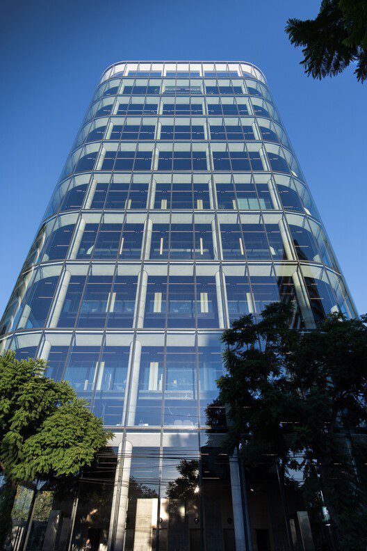 The project is made up of four fully glazed facades, a statement of precision and lightness articulated by curved glass corners free of visible mullions that dissolve the interior/exterior boundary, rising seamlessly from the ground to the sky. Oversized glass panels extend continuously across the tower’s 60-meter elevation.