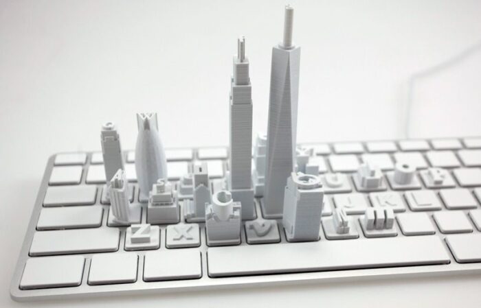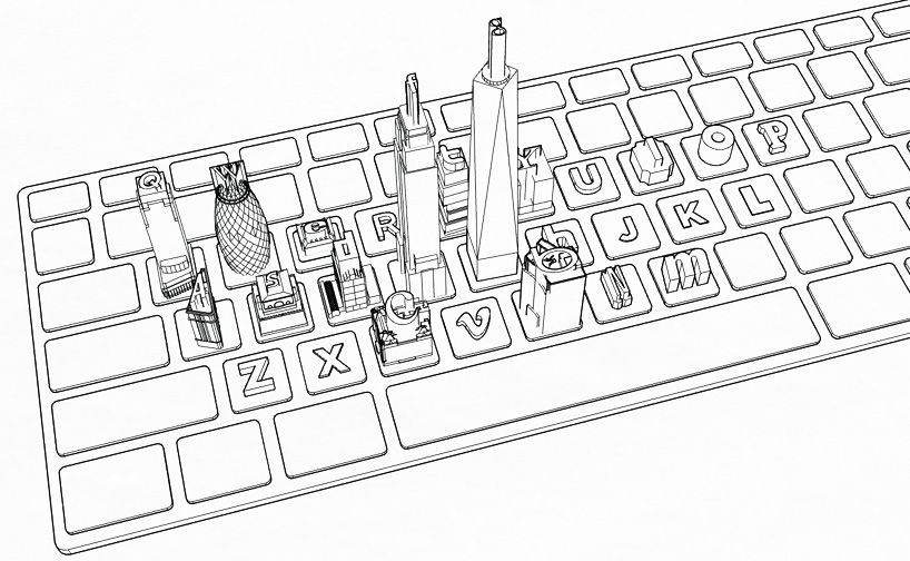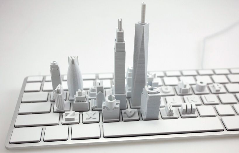 This kyeboard+ titled ‘Virtual City’ is a corporeal visualization of the current topography of the internet. This topography is formed by the major websites (it’s surprising to see how few websites so many of us visit so much) which guide the visitation trends of the web’s billions of users. The buildings are 3d printed and fixed to a clean white keyboard, with the buildings’ heights corresponding to the estimated unique monthly visitors of the websites they represent. With 88 million visitors, ebay is represented by New York’s Grand Central Terminal; Twitter at 250 million is the new museum in Manhattan; 750 million gets Facebook the Empire State Building; Wikipedia, the Gherkin, at 350 million; and the grand puba, Google gets the World Trade Centre with 800 million.