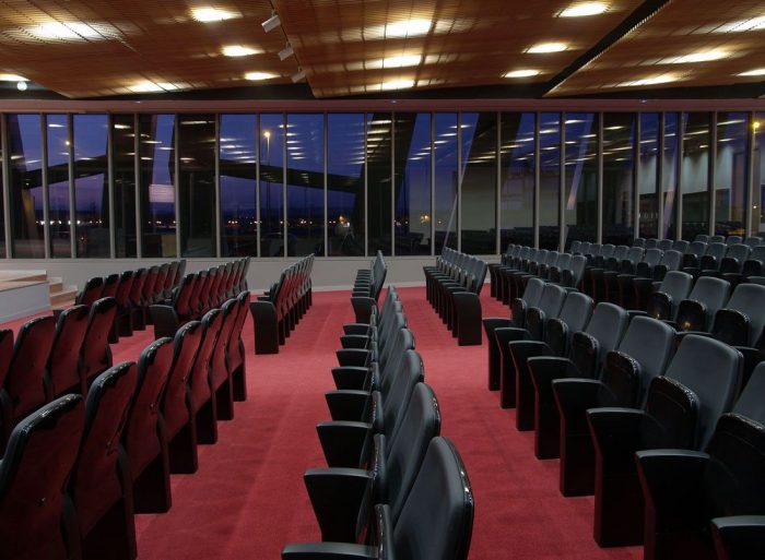 This is the headquarters of the local savings bank. The building reproduces the scale of the surrounding small woods, a park of the Nature 2000 networking program. The structural concept is based on pairs of exterior metal supports, clad in stainless steel composite panels. One of the arms has been conceived as a 26-meter cantilever. In this case, the concept changes and the pairs do not have any structural function.