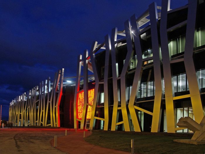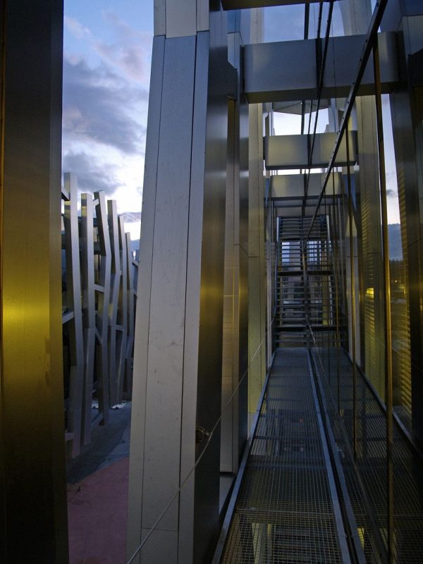 The idea is to identify the building as a live organism in motion. A black skin made of glass protects the inhabited spaces behind the stainless steel pairs.