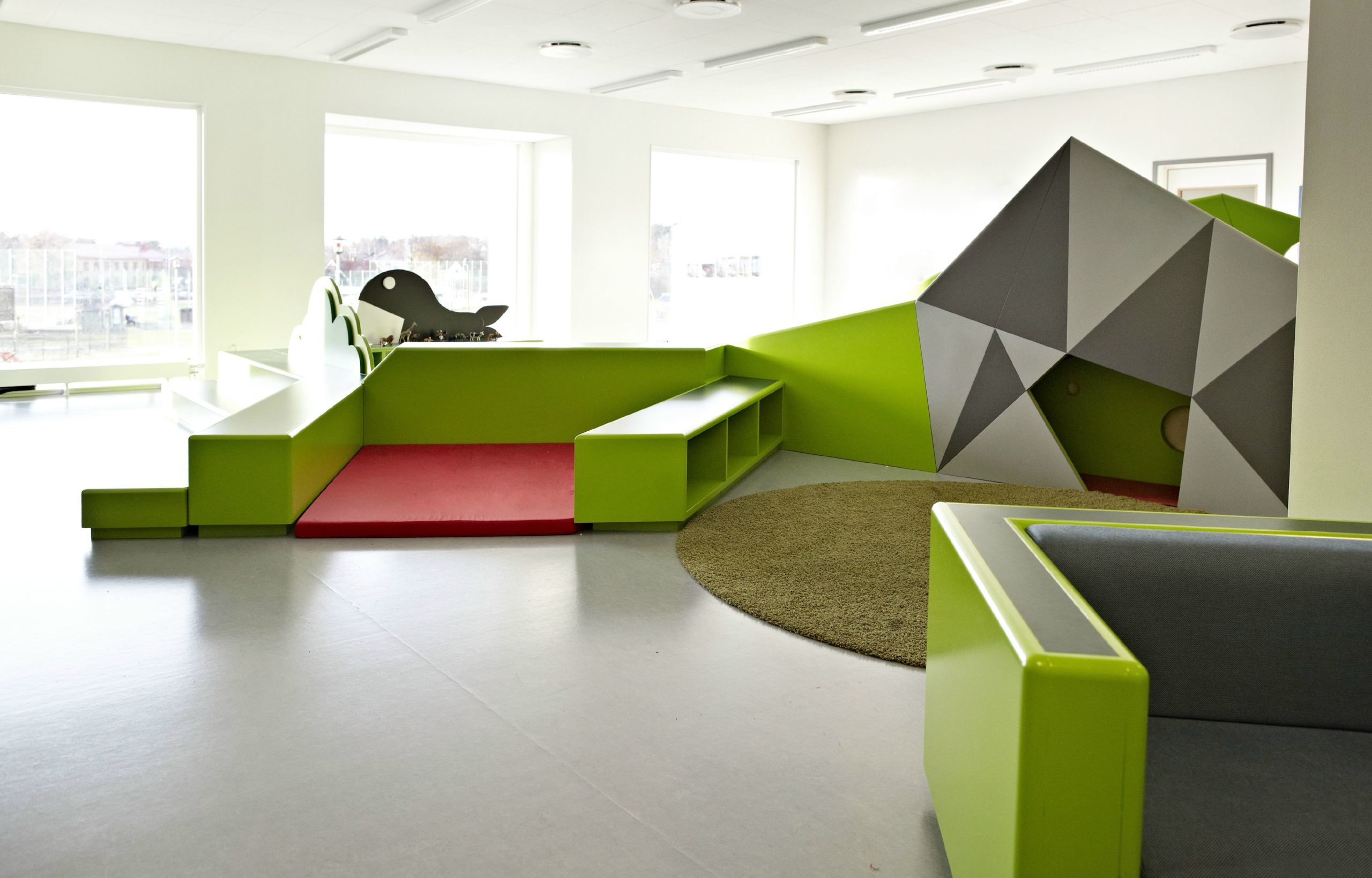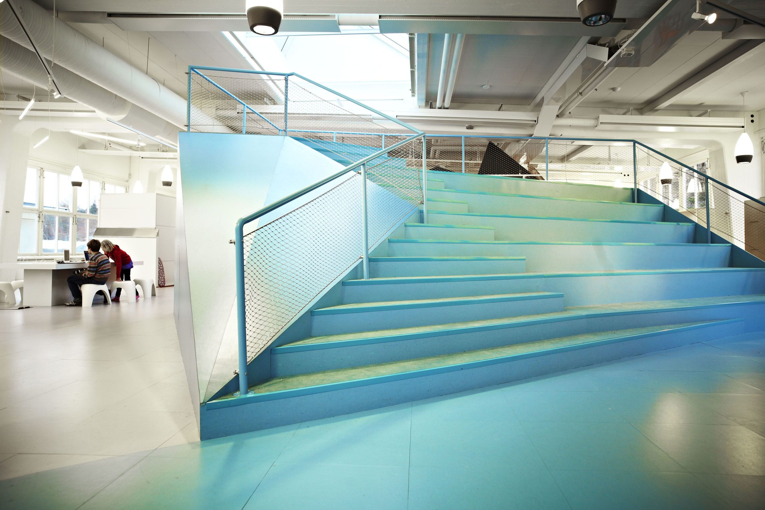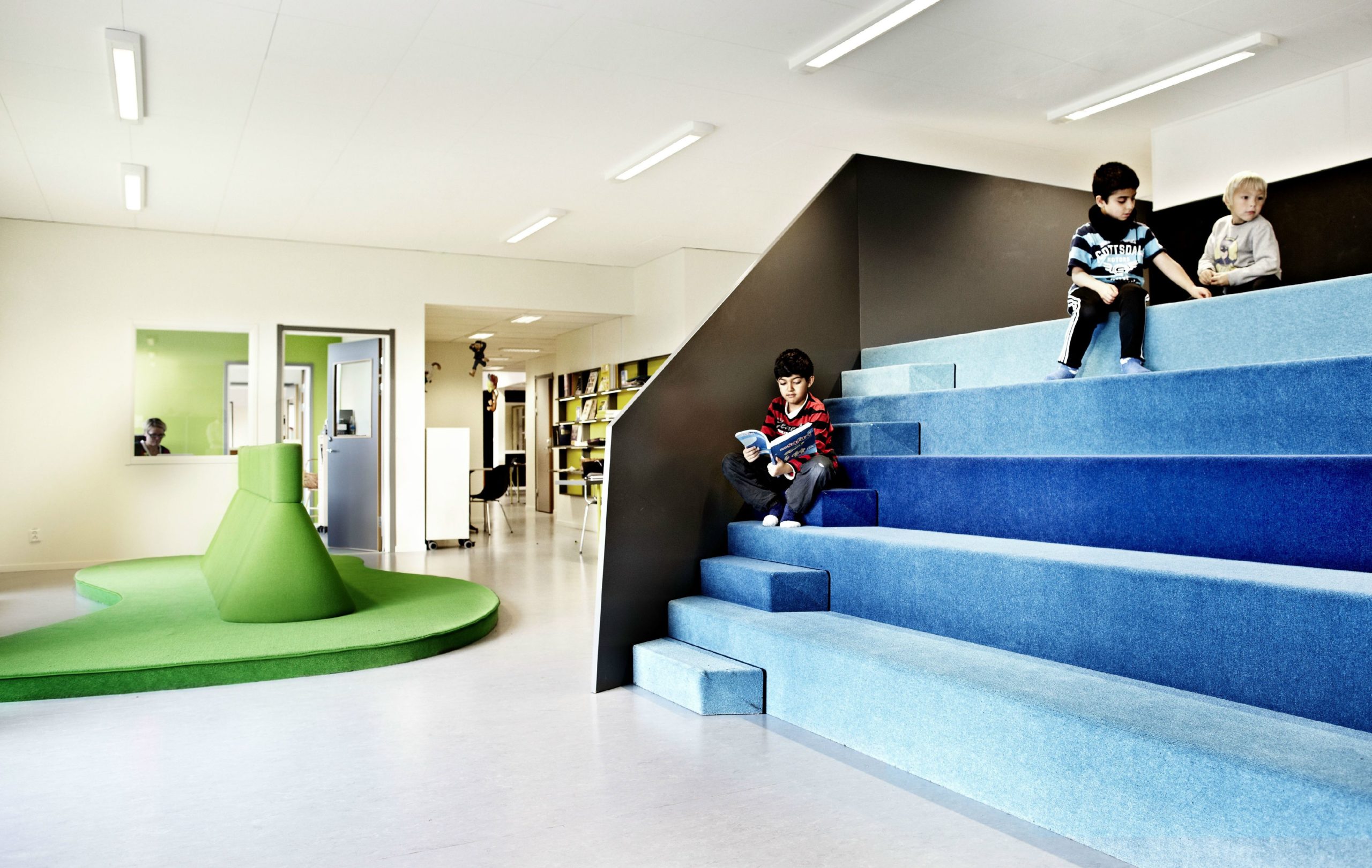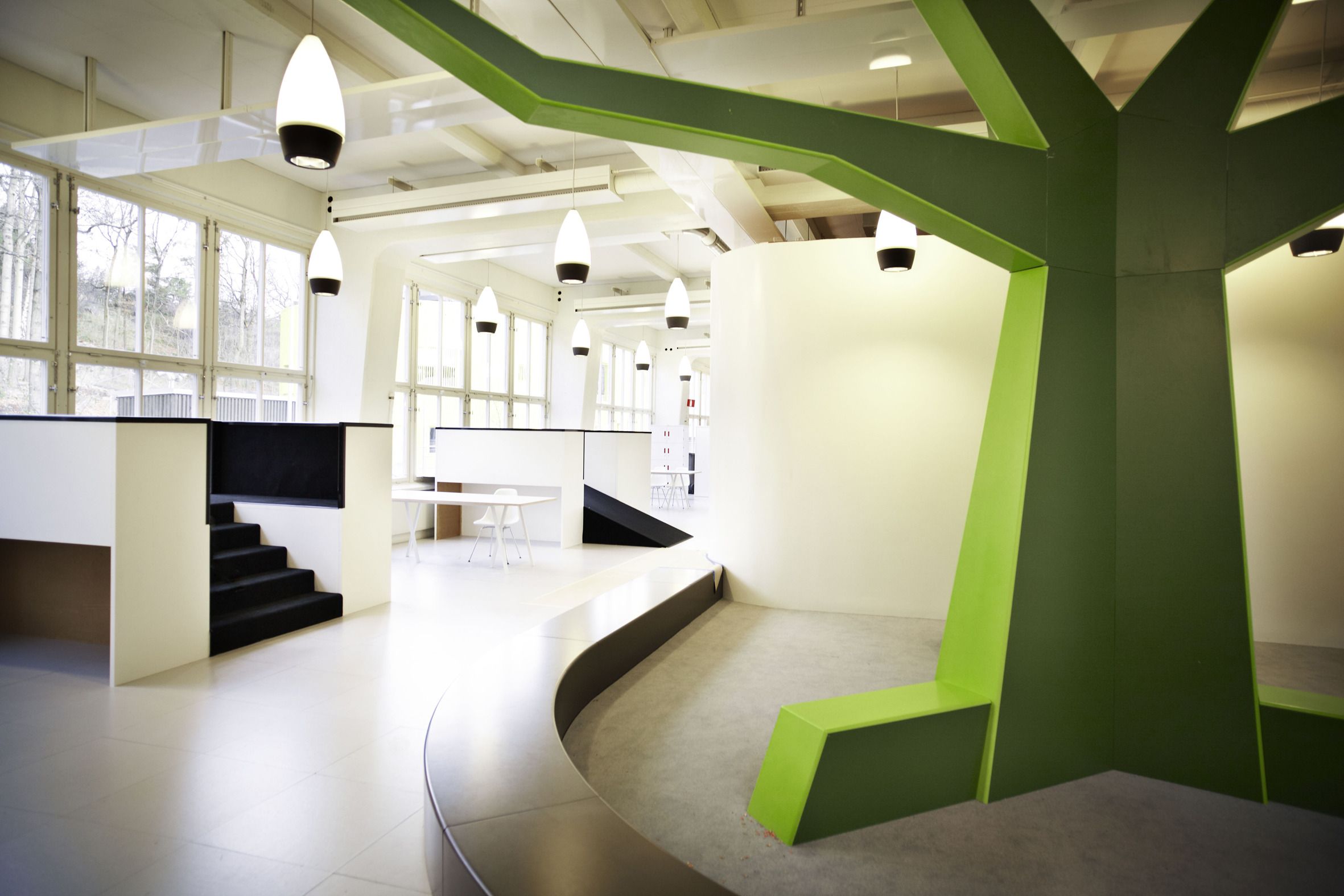 In connection with the establishment of a new Vittra school in Stockholm, Telefonplan, Rosan Bosch Ltd. has created the school’s interior with spatial divisions and significant custom design. The interior takes it the point of departure in Vittra’s pedagogical principles and serves as a pedagogical tool for development in the every day of the school. Instead of classical divisions with chairs and tables, a giant iceberg, for example, serves as cinema, platform, and room for relaxation, and sets the frame for many different types of learning. Moreover, flexible laboratories make it possible to work hands-on with themes and projects.