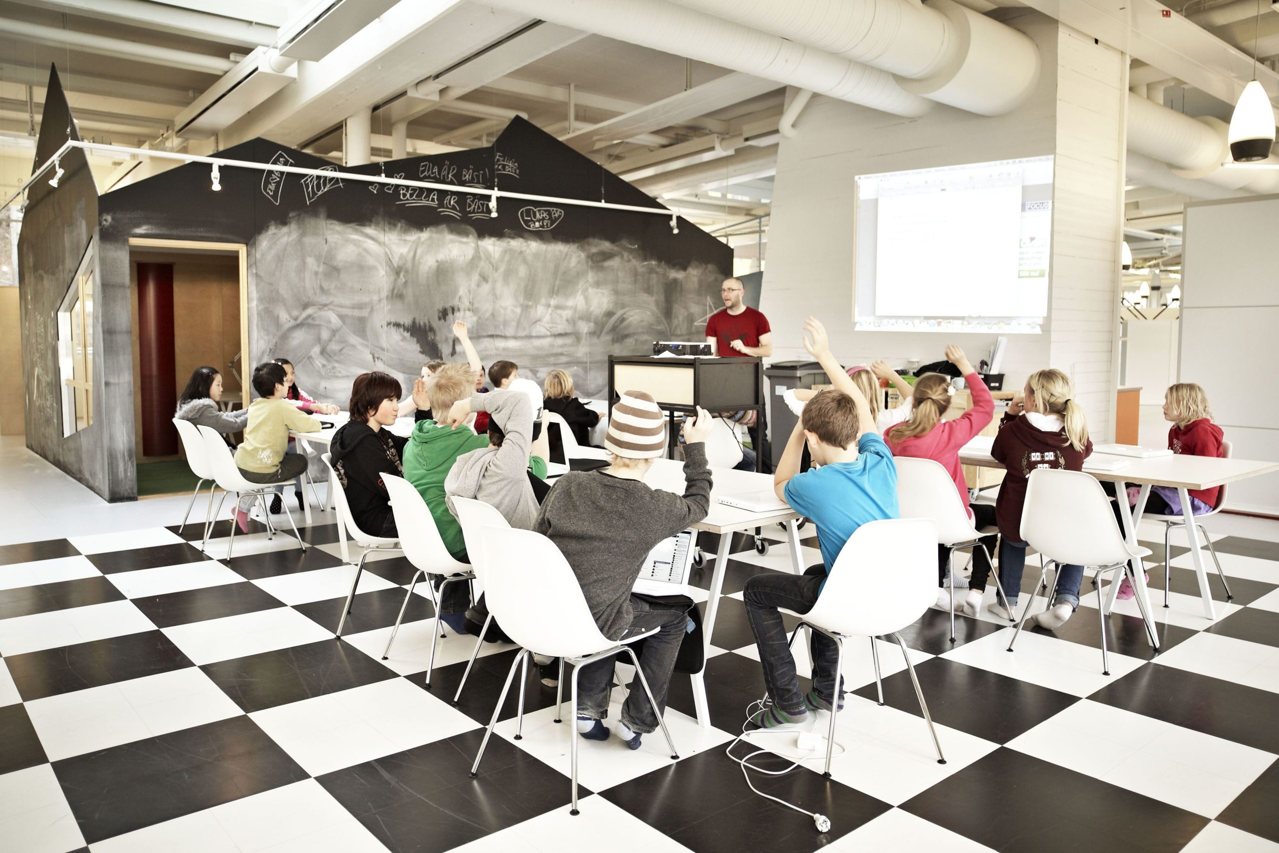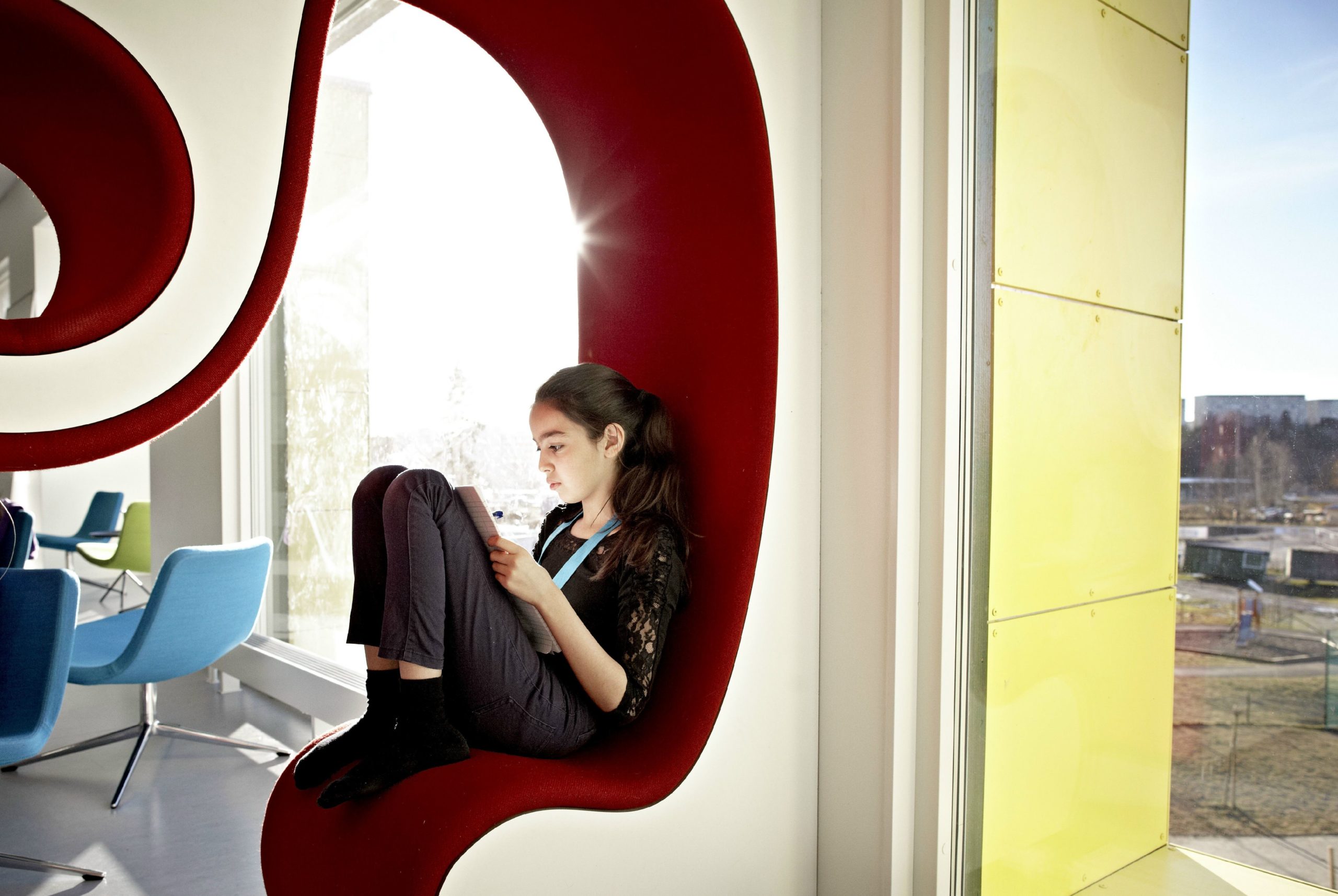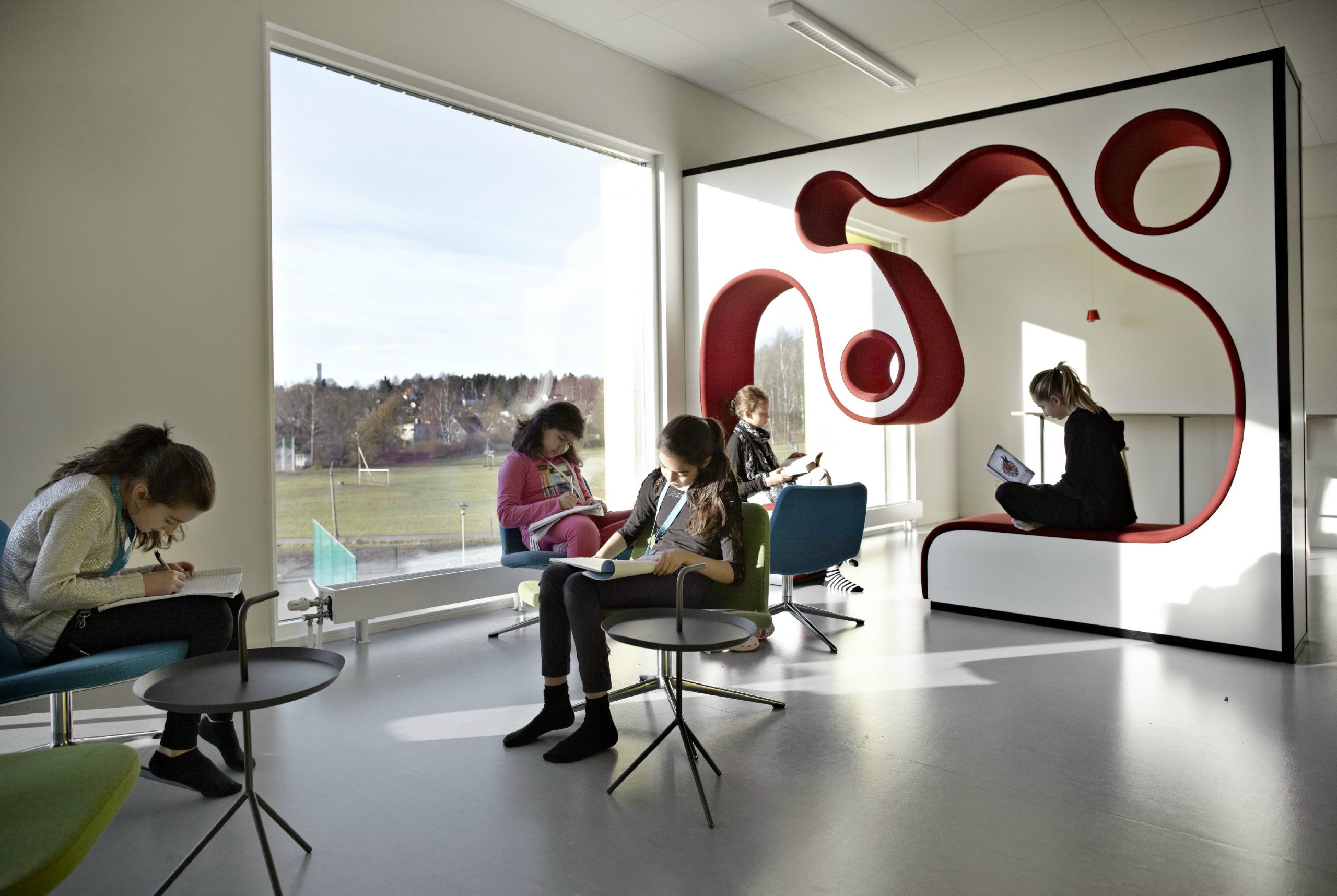 How do you create a school without any walls? In the 30 schools of the Swedish free school organisation Vittra there are no classes or classrooms – instead, the students are taught in groups according to level based on the school’s pedagogical principles of ’the watering hole’, ’the show-off’, ’the cave’, ’the campfire’ and ’the laboratory’ – didactic approaches that create different types of learning and teaching situations. In Vittra, they do not believe in regular classes and the school organization’s vision is to create an every day for the individual students where individual development, a living cultural work, and challenging learning environments are most important.