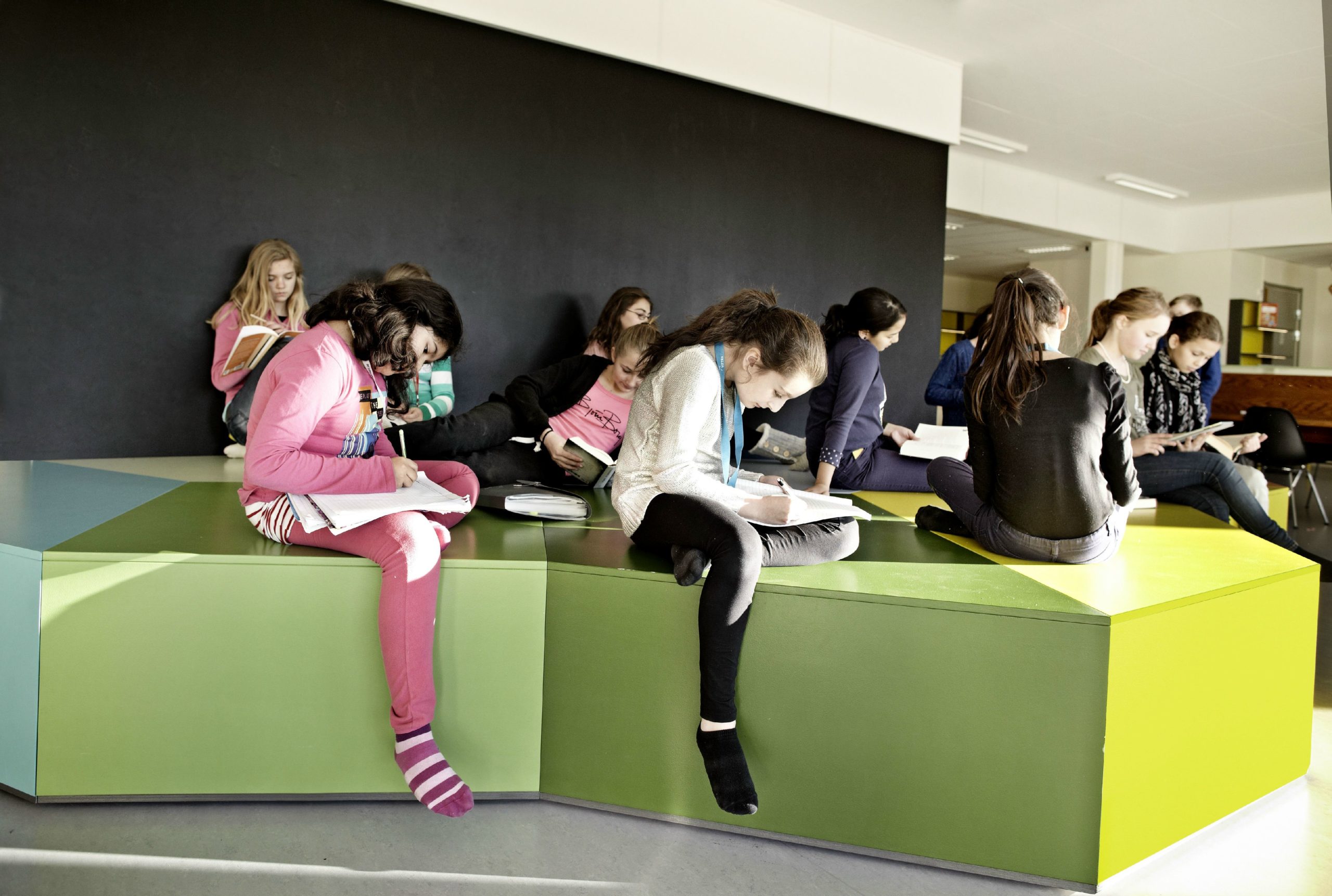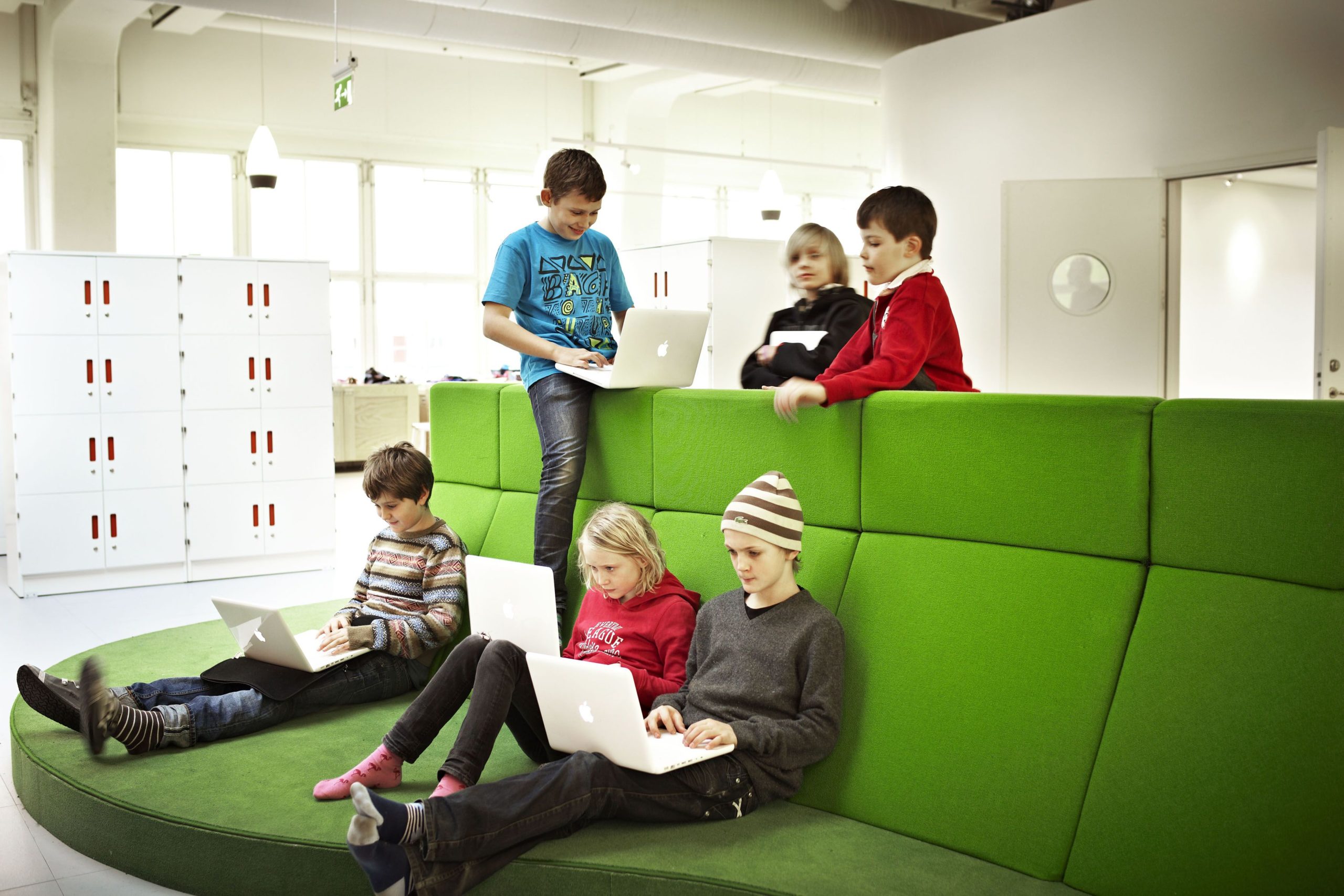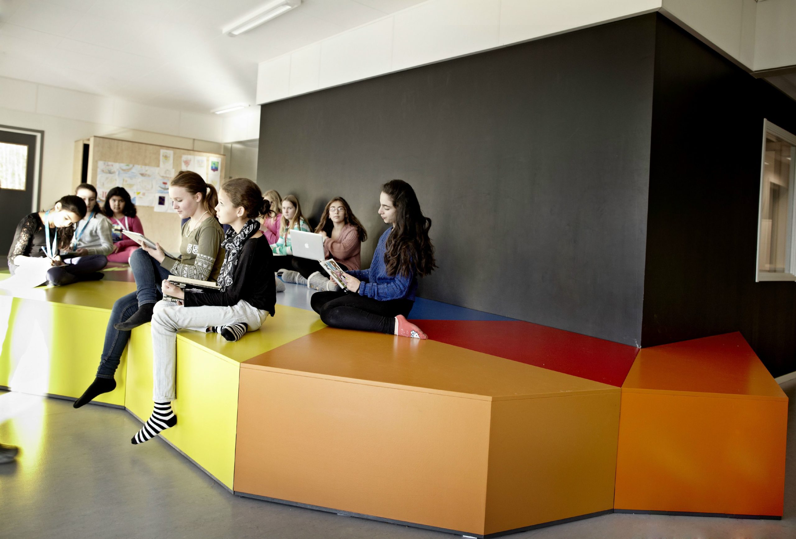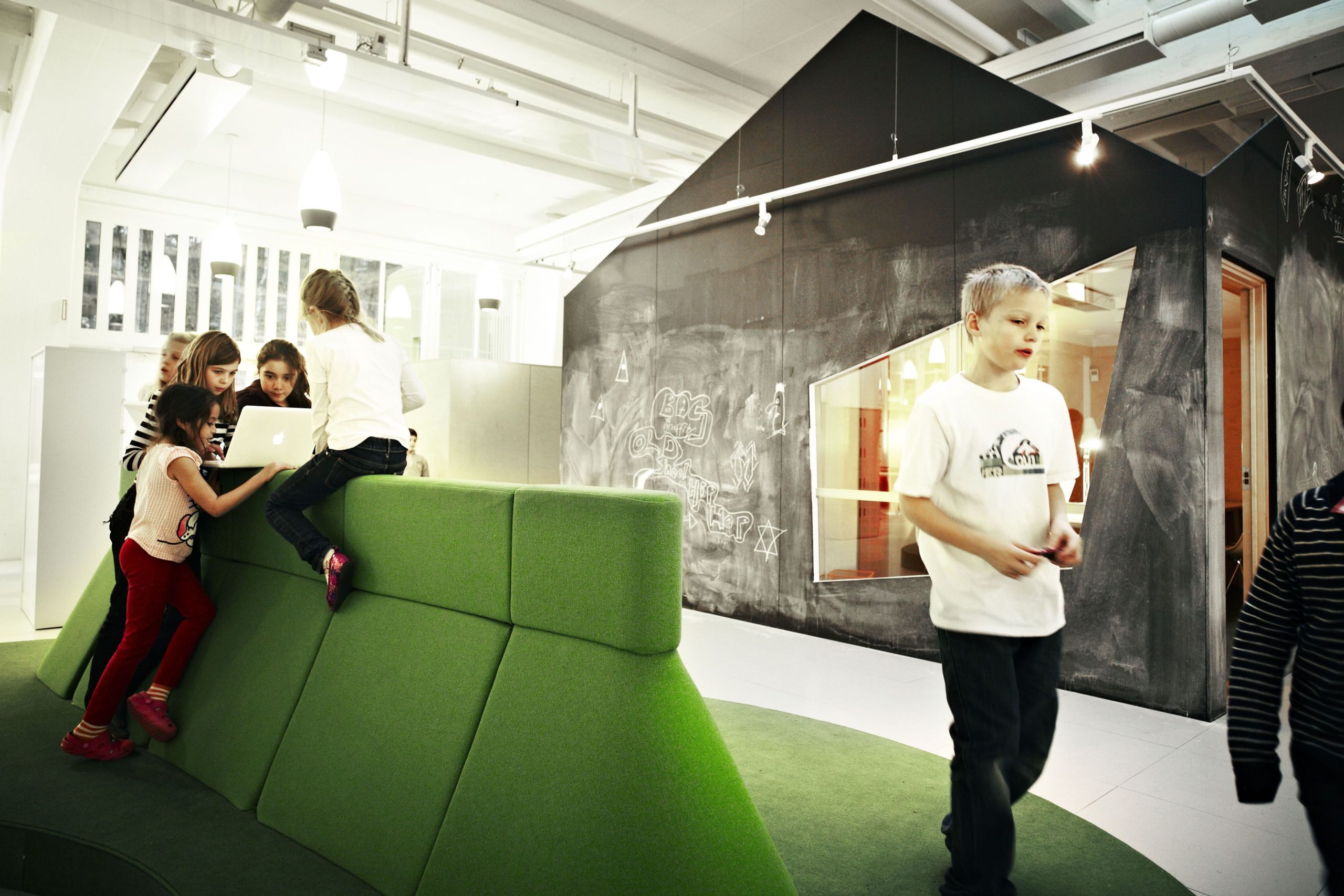 The design and interior are accustomed to Vittra’s active work with digital media and a generally digitalised didactic where the children’s laptops are their most important tool in the everyday – whether they are sitting, lying or standing up when working.