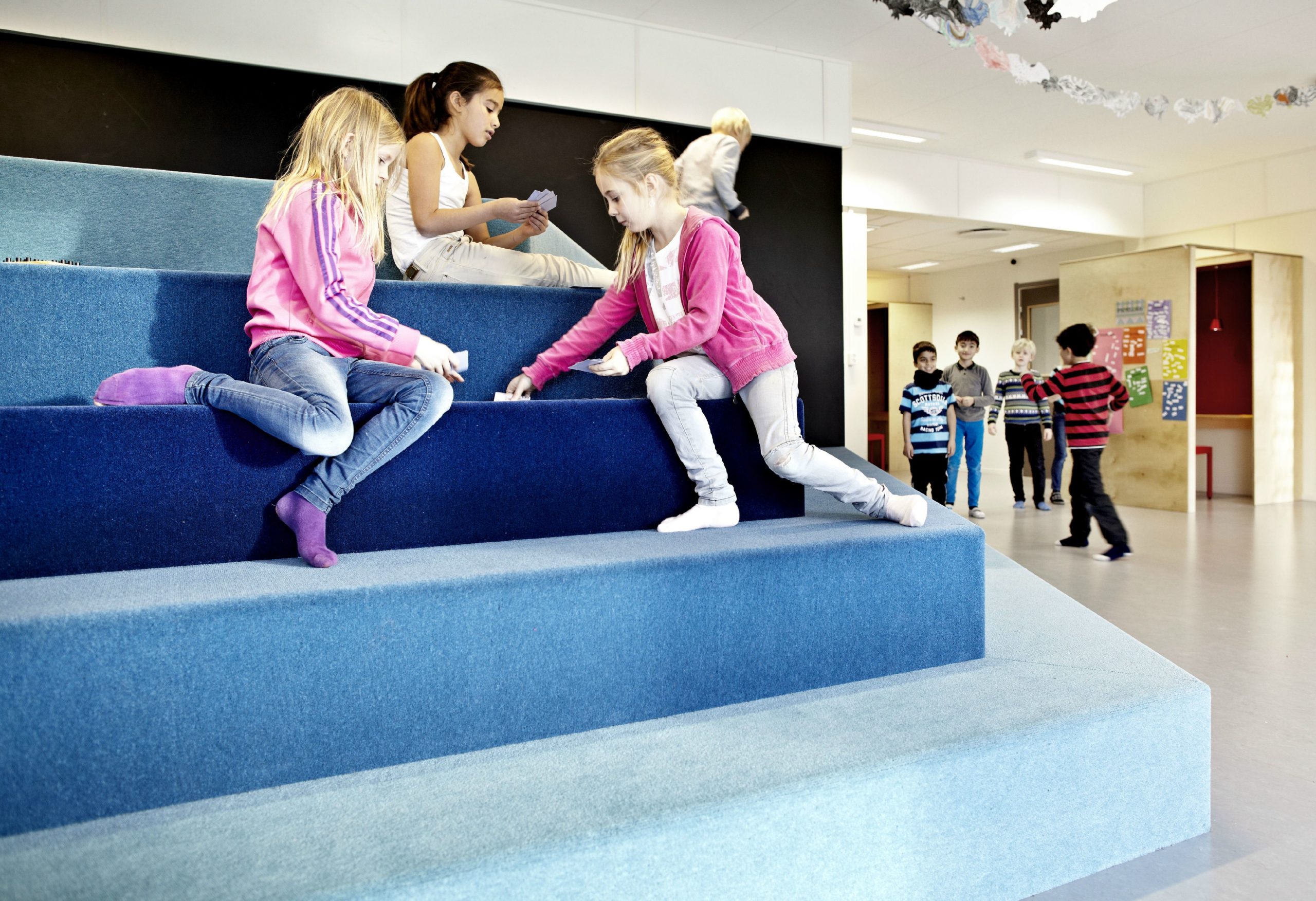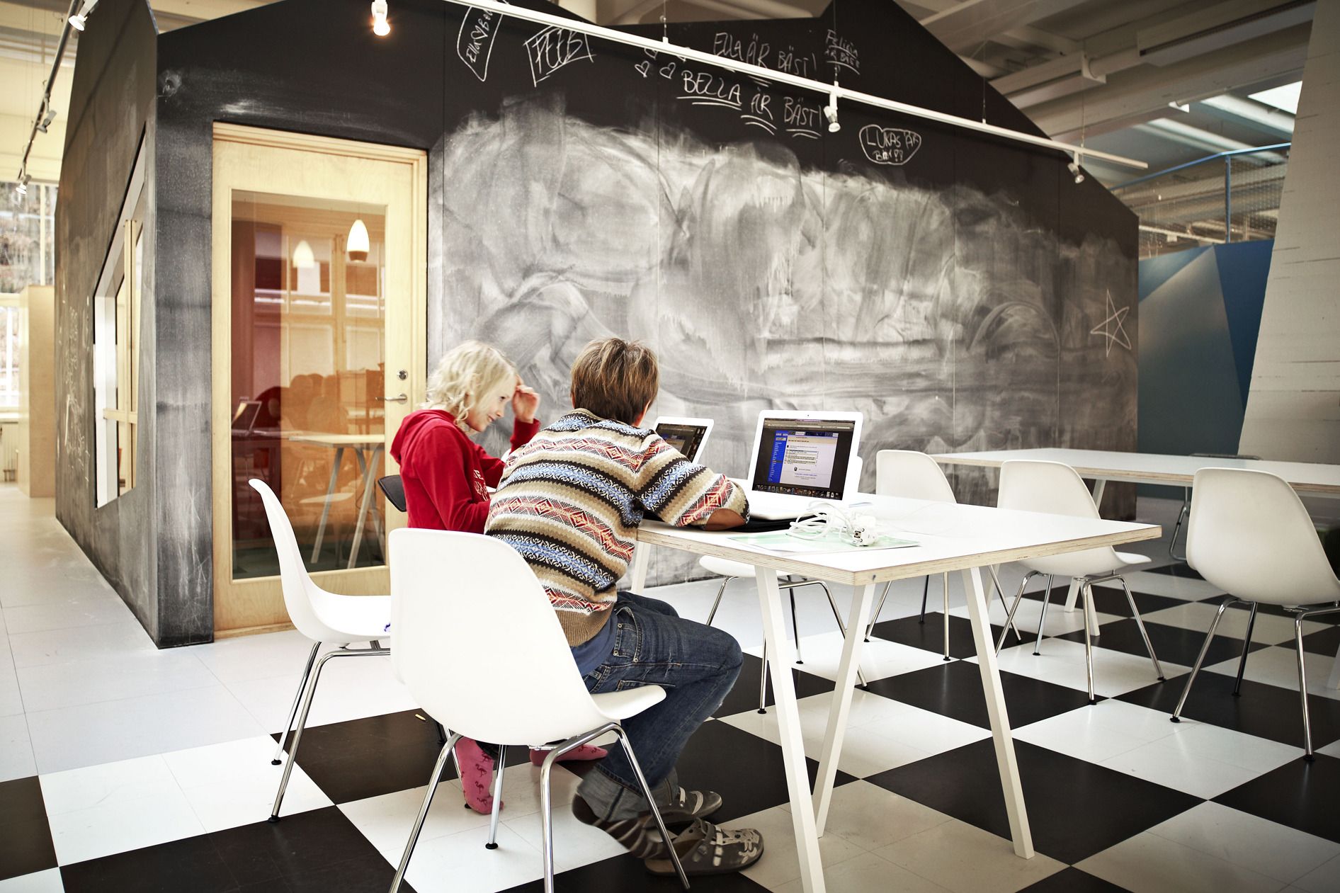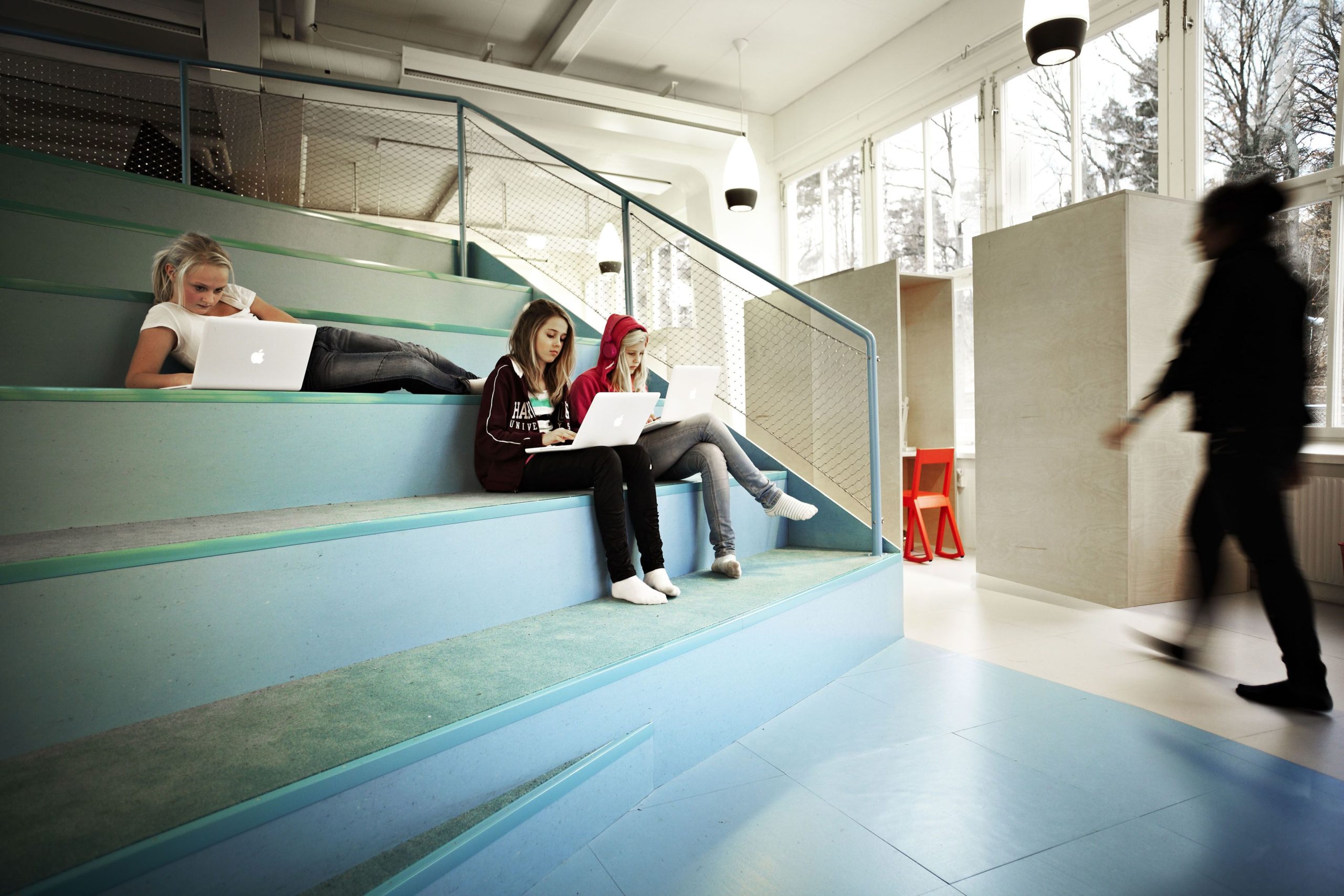 The design and interior are accustomed to Vittra’s active work with digital media and a generally digitalised didactic where the children’s laptops are their most important tool in the everyday – whether they are sitting, lying or standing up when working.