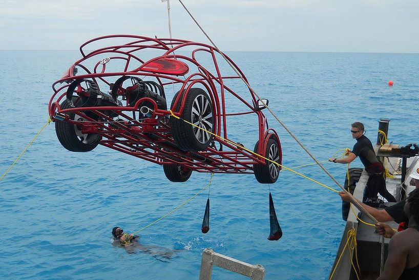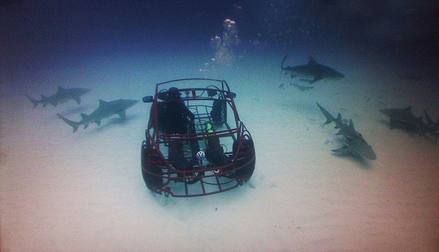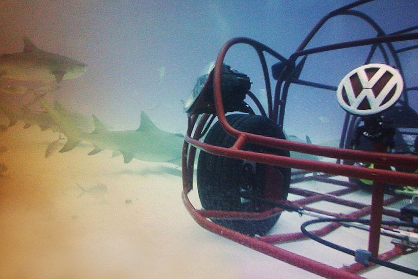 Beetles can swim! Well, a “Volkswagen beetle mobile shark cage” can. Volkswagen has teamed up with the discovery channel to provide shark divers a stylish metallic framed sea beetle to help film Shark Week.