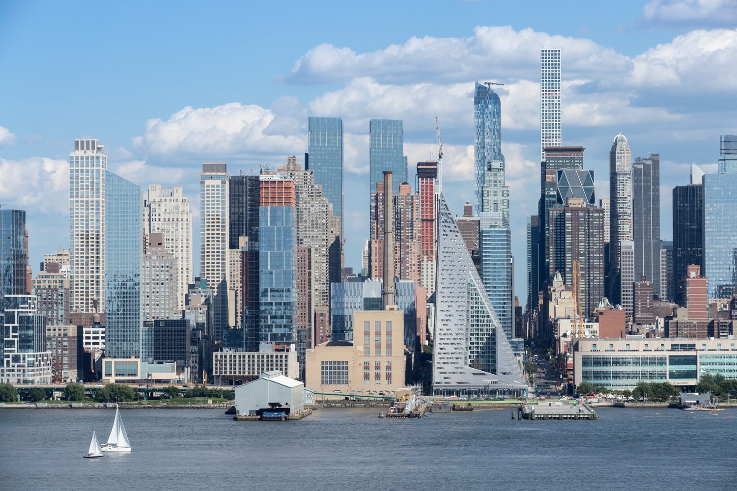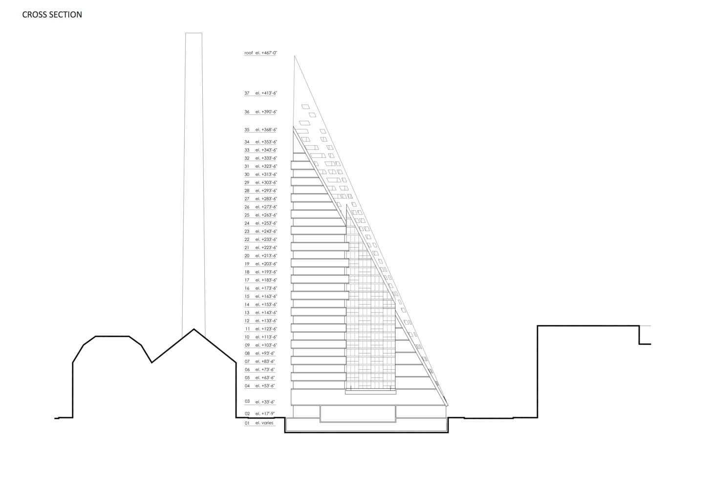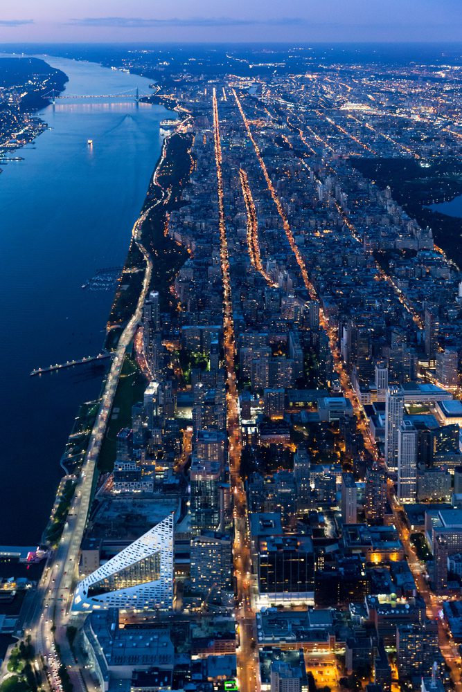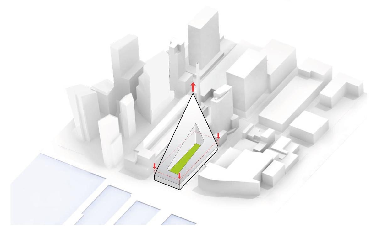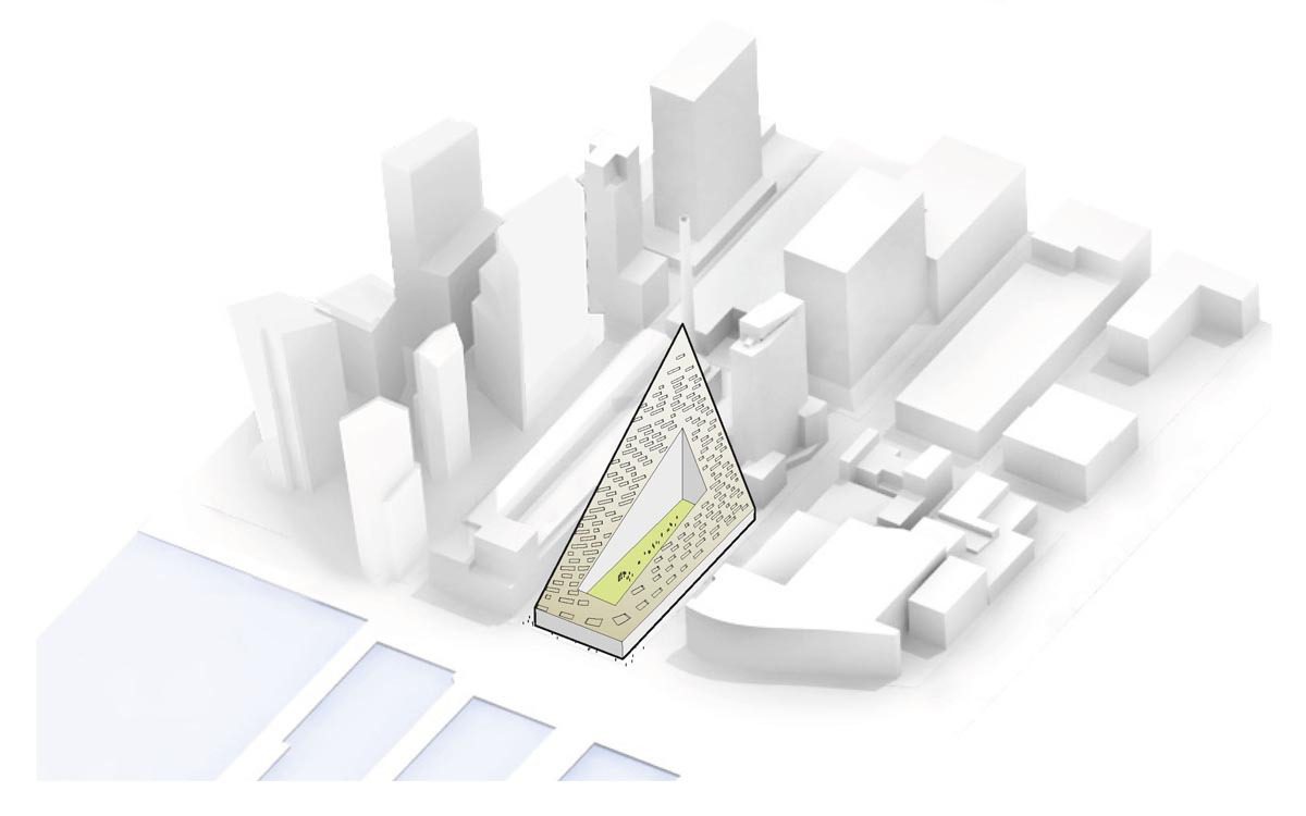 BIG’s inaugural project in NY is a hybrid between the European perimeter block and a traditional Manhattan high-rise, West 57 th has a unique shape which combines the advantages of both: the compactness and effi ciency of a courtyard building providing density, a sense of intimacy and security, with the airiness and the expansive views of a skyscraper.By keeping three corners of the block low and lifting the north-east corner up towards its 467 ft peak, the courtyard opens views towards the Hudson River, bringing low western sun deep into the block and graciously preserving the adjacent Helena Tower’s views of the river. The form of the building shifts depending on the viewer’s vantage point. While appearing like a pyramid from the West-Side-Highway, it turns into a dramatic glass spire from West 58th Street.