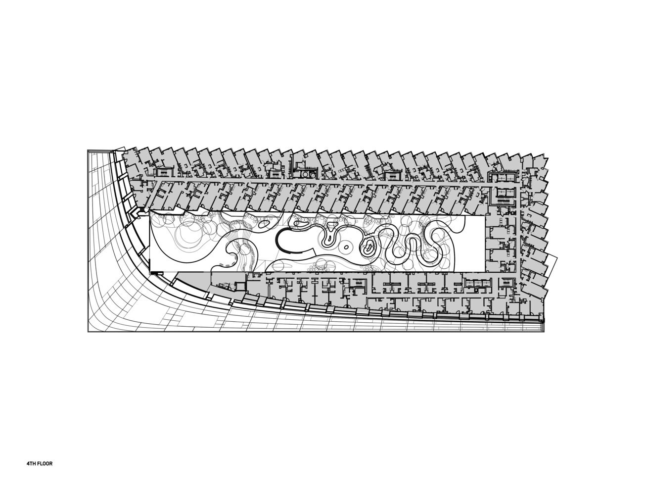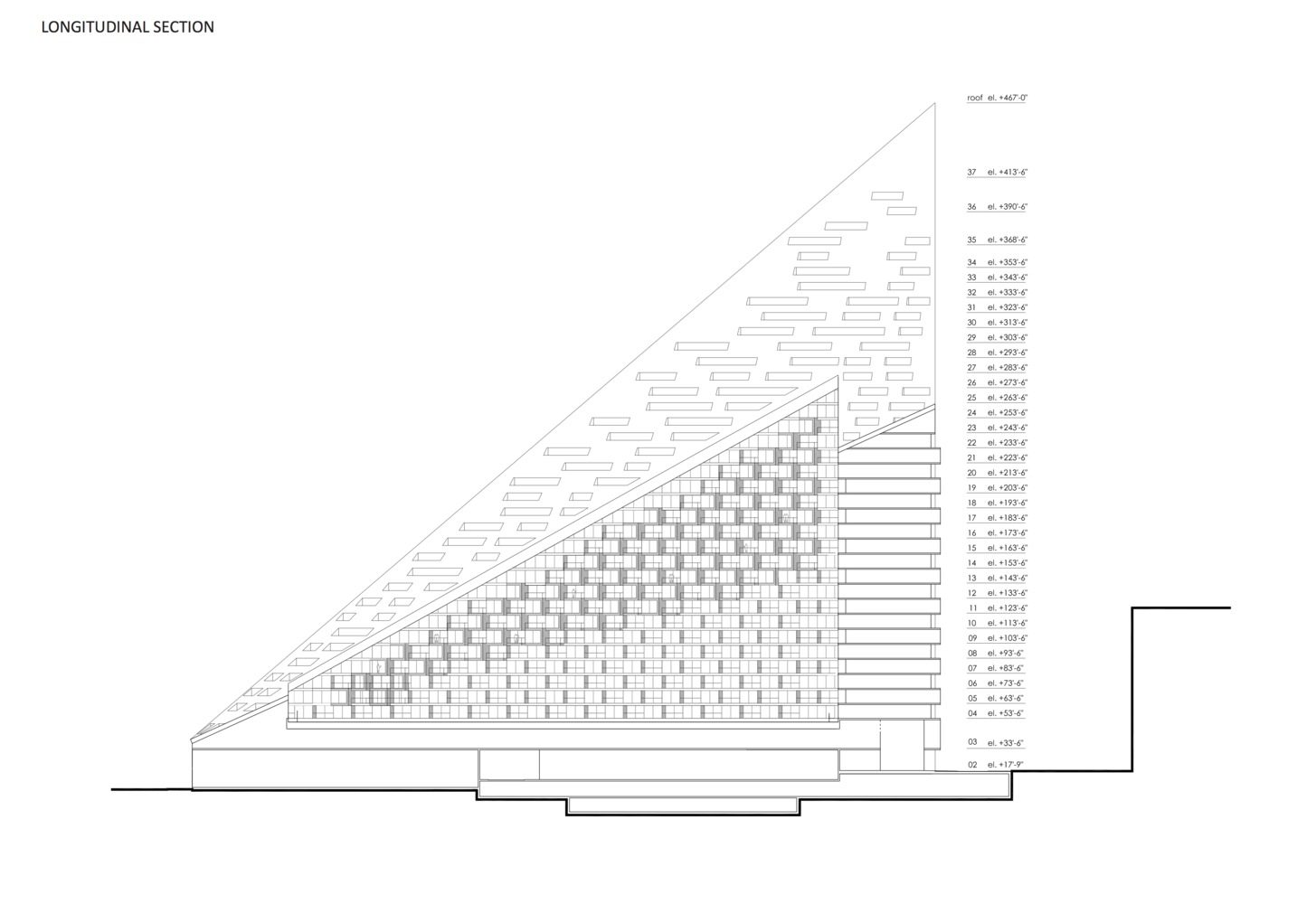 The courtyard which is inspired by the classic Copenhagen urban oasis can be seen from the street and serves to extend the adjacent greenery of the Hudson River Park into the West 57th development. The slope of the building allows for a transition in scale between the low-rise structures to the south and the high-rise residential towers to the north and west of the site. The highly visible sloping roof consists of a simple ruled surface perforated by terraces—each one unique and south-facing. The fi shbone pattern of the walls are also refl ected in its elevations. Every apartment gets a bay window to amplify the benefi ts of the generous view and balconies which encourage interaction between residents and passers-by.