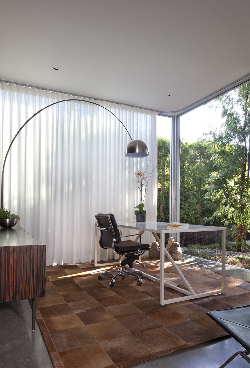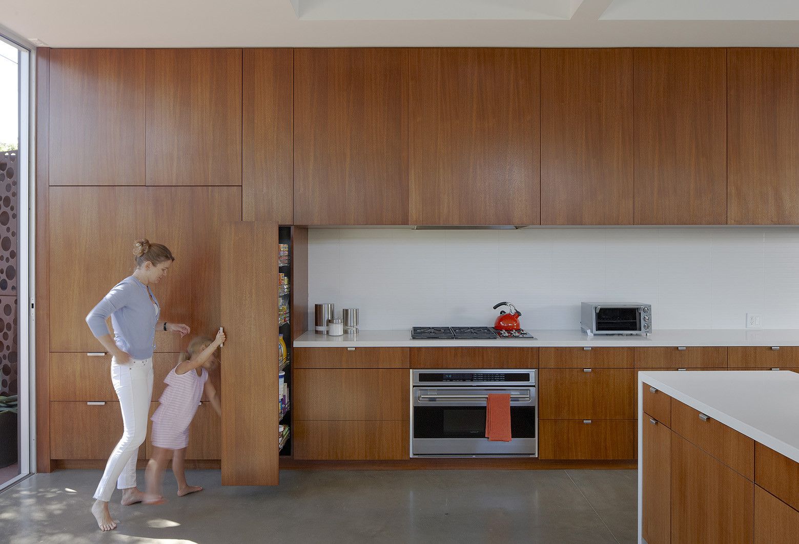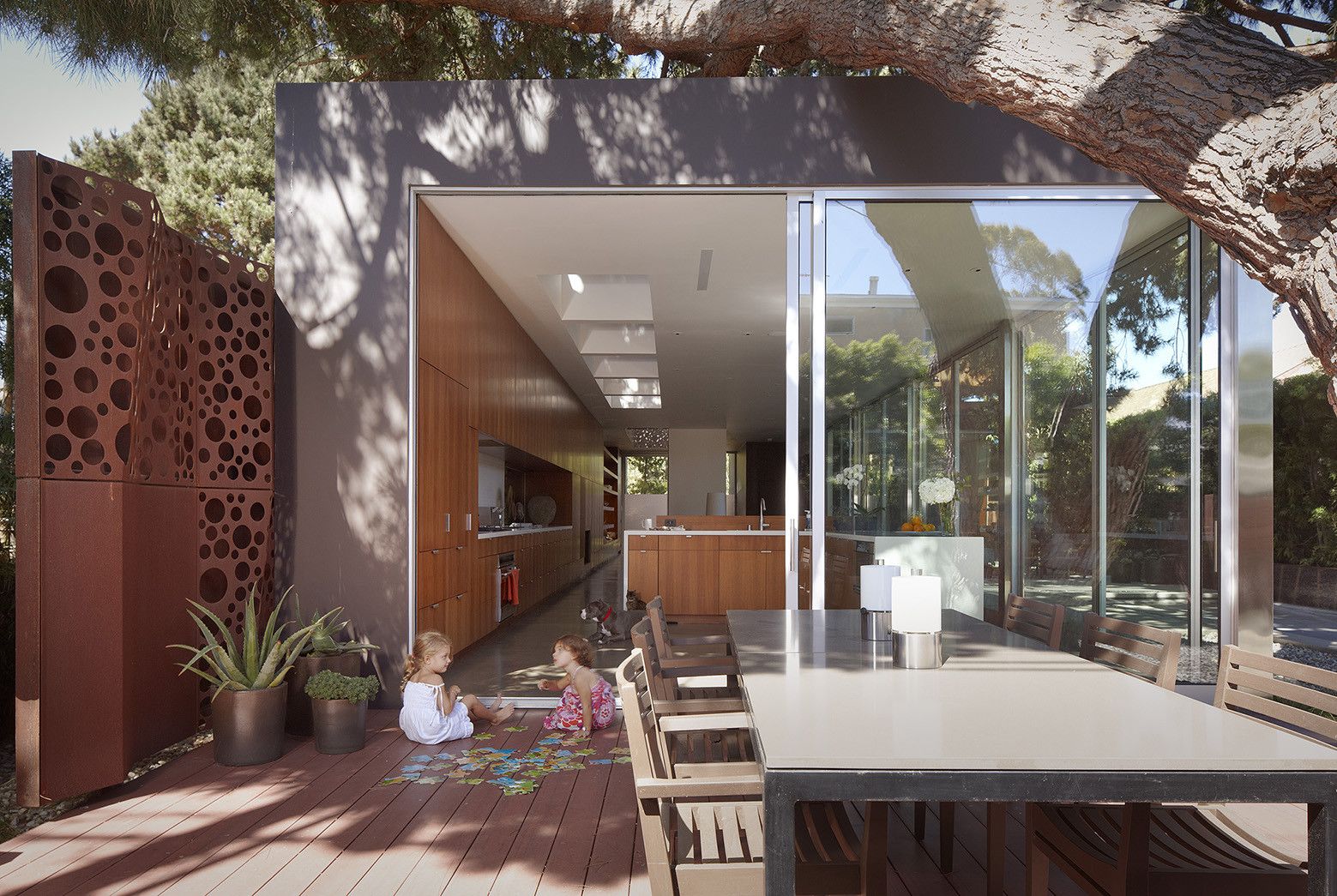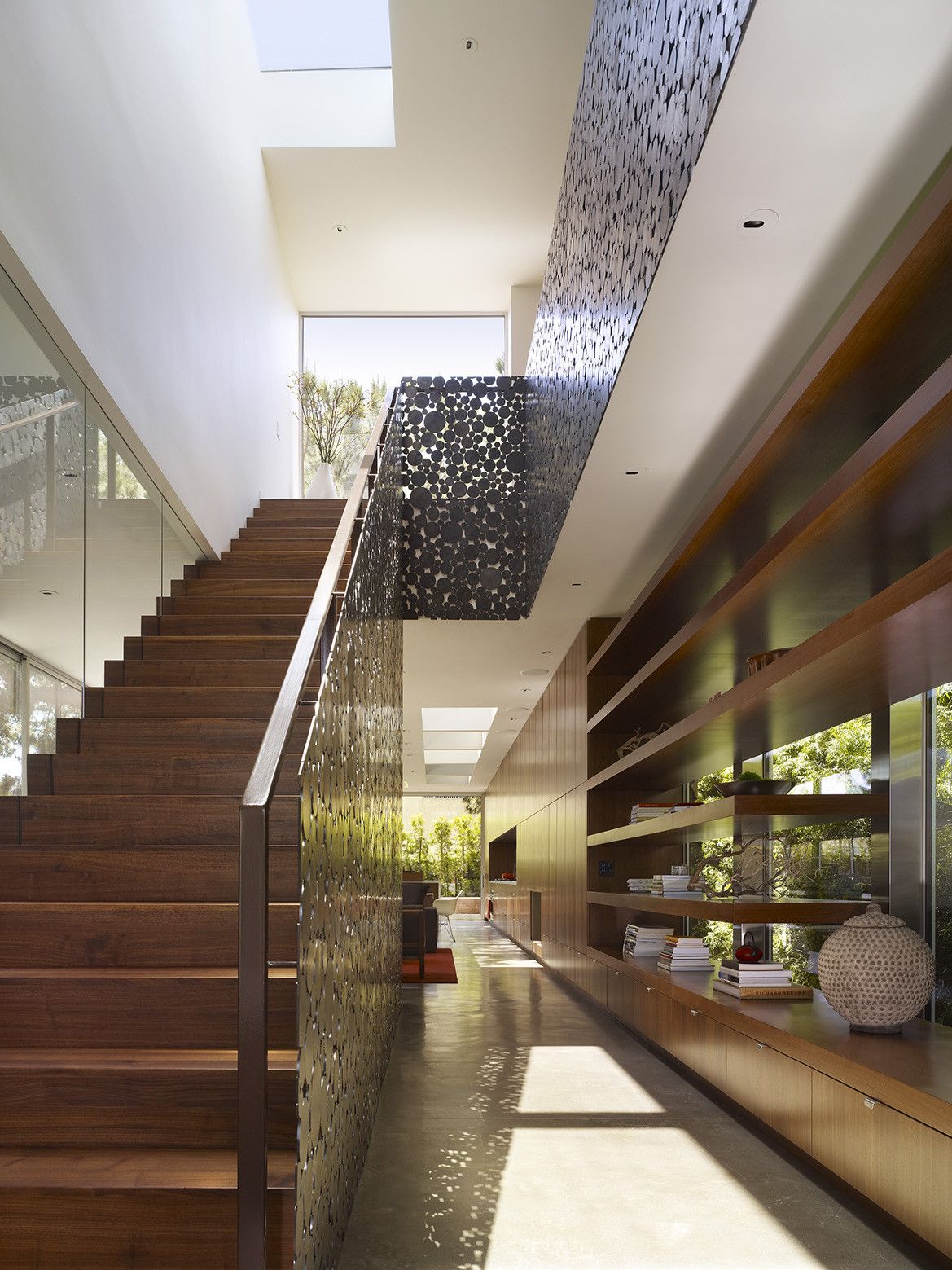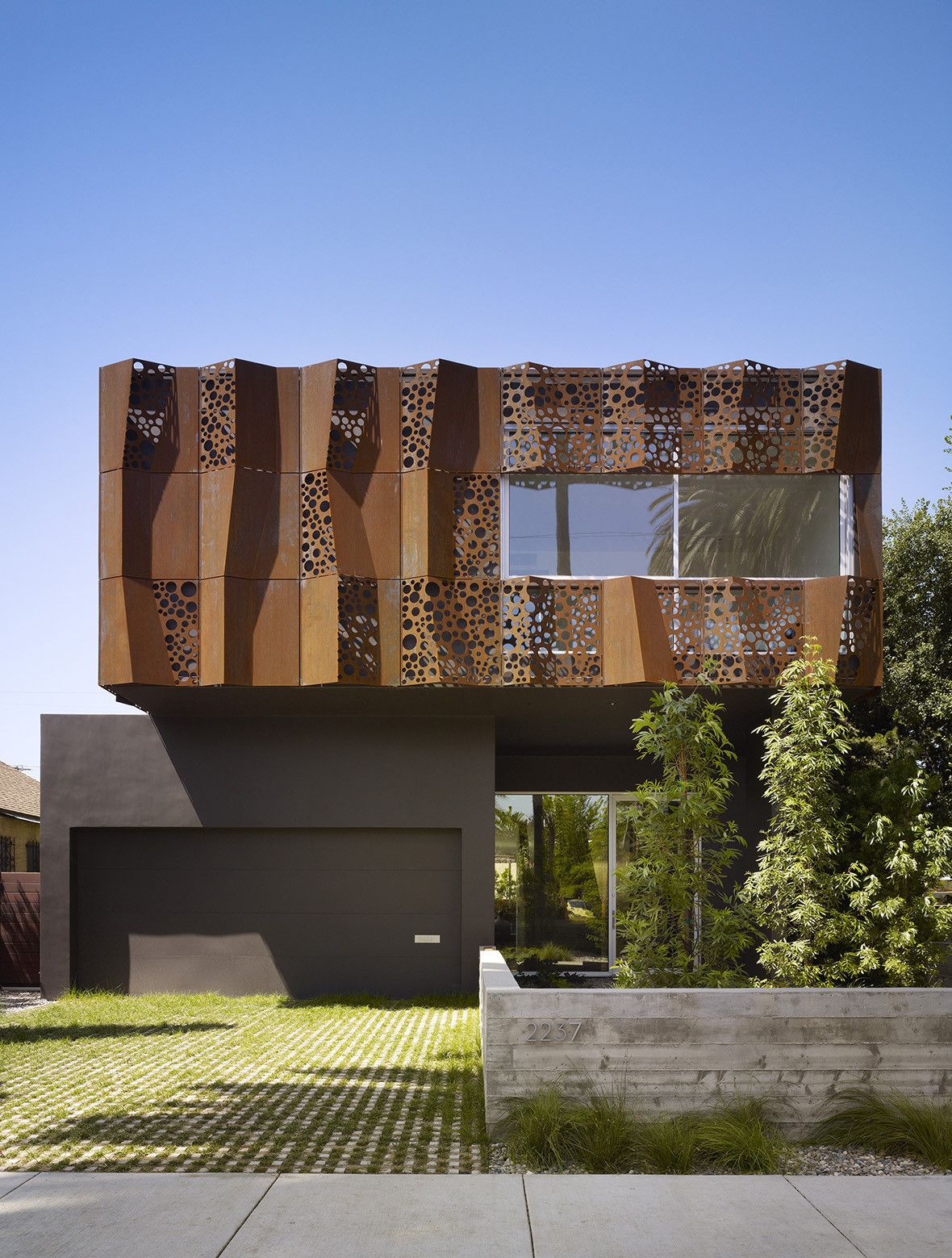 Dense program elements such as the garage with adjacent storage and the stairwell are clustered towards the front of the house and support a lighter, more organic mix of bedroom and bathroom spaces above. This analogy is repeated in the materials. Stucco and concrete on the lower level support lighter programs and materials such as wood, glass and perforated cor-ten metal panels above. An elongated bar containing living, dining and kitchen spaces in an open-plan arrangement on the lower level are surrounded by glass sliding doors and skylights on three sides.