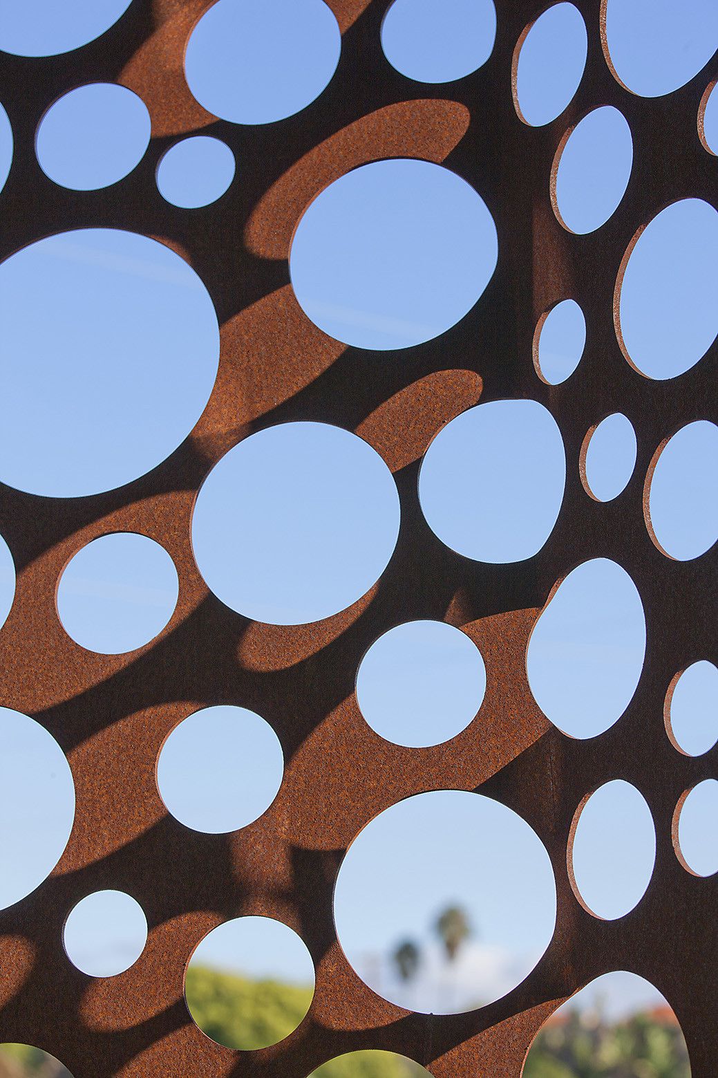 Spatially this area represents the open zone under typical canopies and also offers a unique vantage point to view the pine’s lacy canopy. It is anchored along the edge of the property by the cor-ten panels that descend from the canopy level to the ground.