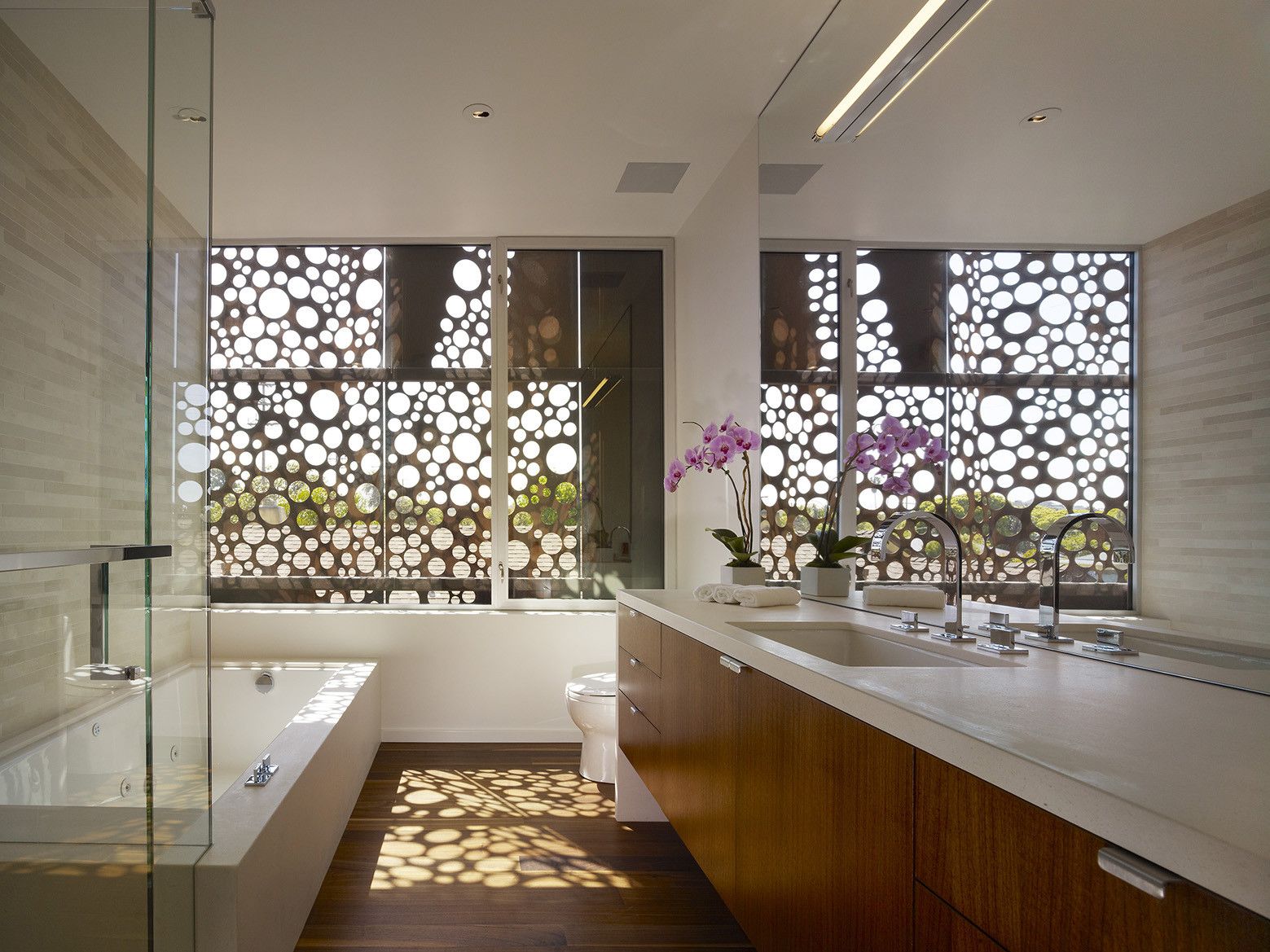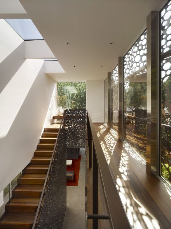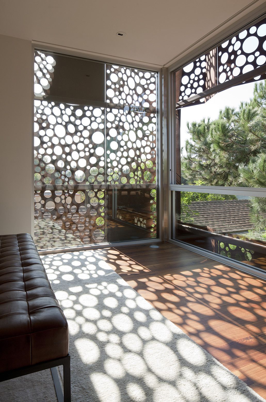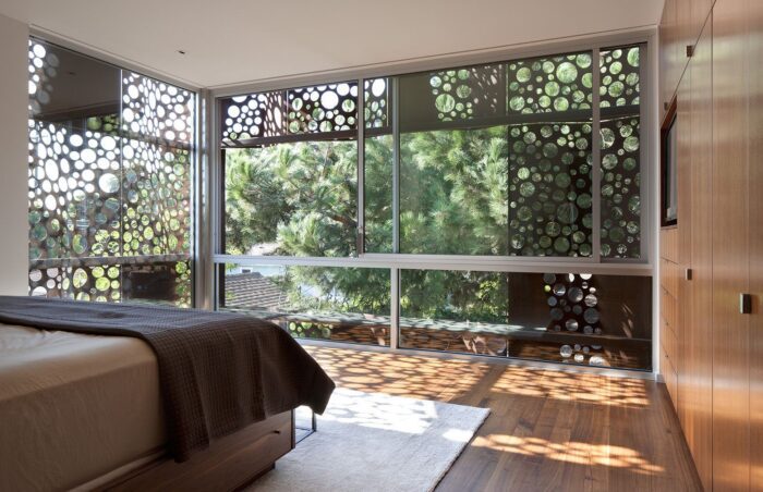 Because bedrooms and bathrooms are the only program located on the upper level, privacy was a main concern. The dense use of the cor-ten screen above optimizes natural day lighting on the north and east facades while mitigating solar gain on the south and west. Throughout, a random, manipulated pattern of varying apertures allows ample views out but obscured views in.