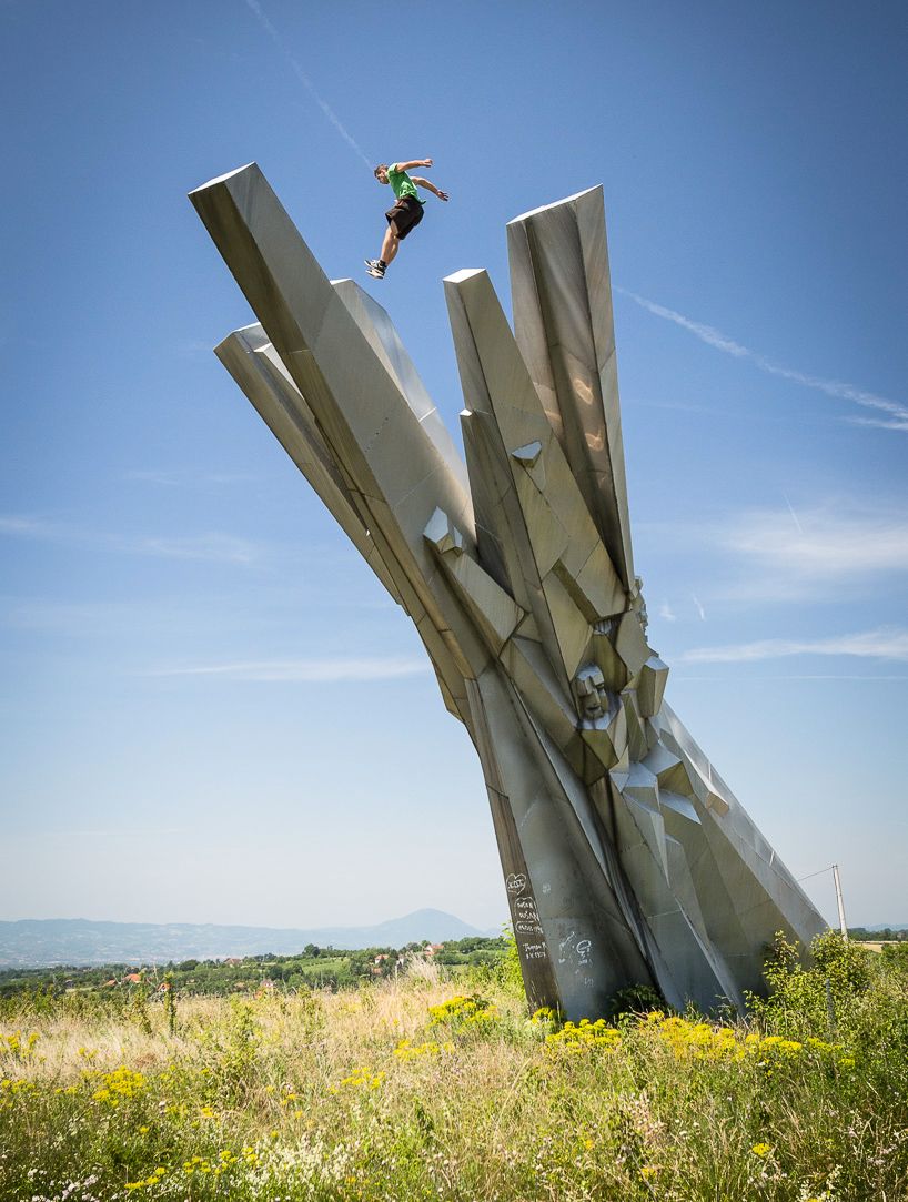 His work inspired, in turn, Andy Day, who himself is a prolific photographer with an avid interest in Parkour Athletics. Day traveled to Serbia, Croatia and Bosnia and documented a series of photographs over the course of three months, titled, “Former”, in which Parkour Athletes explore several of these monuments. In an attempt to enliven the now-almost-forgotten art work and War memorials, he provides a different perspective to them.