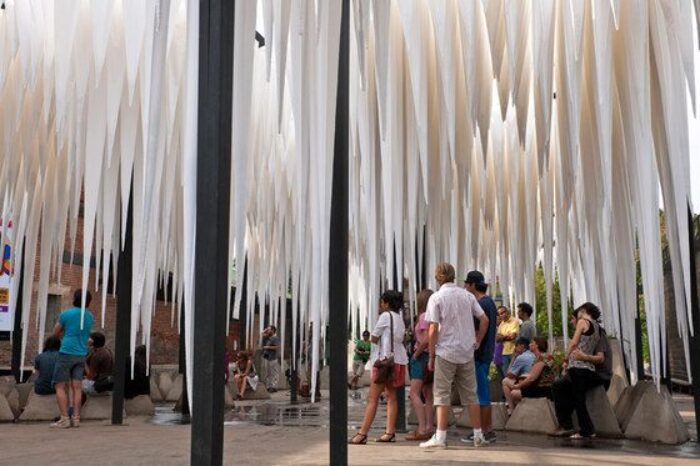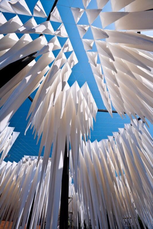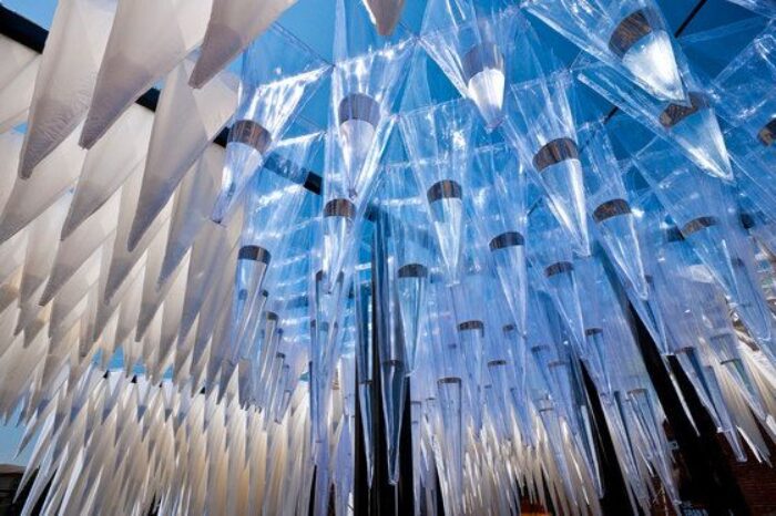 This is accomplished through the hanging components of the roof topography, constituted geometrically and materially like textile prisms placed upside-down with a partial granular substratum filling. They are fed by a hydraulic network that continuously irrigates using measured doses. When filled with small amounts of water, these elements act as regulators or atmospheric interfaces, experiencing a phenomenon of absorption and release where, through capillarity, water drops gradually flow against gravity along the prism edges, slowing down the time of concentration and fall. This delay process that consequently produces multiple dripping rhythms over the ground topography, formally demonstrates management of duration. It materializes an architectural form in which water can be particularized in a system that has extensive effects over an area.