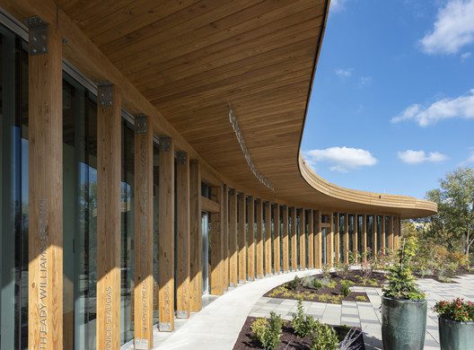 The form of the Graeser Family Education Center is organic, providing a sculptural presence on the grounds. The building contains three separate areas of different scales, accommodating a variety of needs: a meeting and event room, enclosed building core element, and main flexible space for education programs. The long spans of the wooden structure are supported by a continuous ribbon-like ring beam that sits on 99 micro columns around the perimeter. These each provide donor recognition, which was critical for the momentum-building of this initial phase.