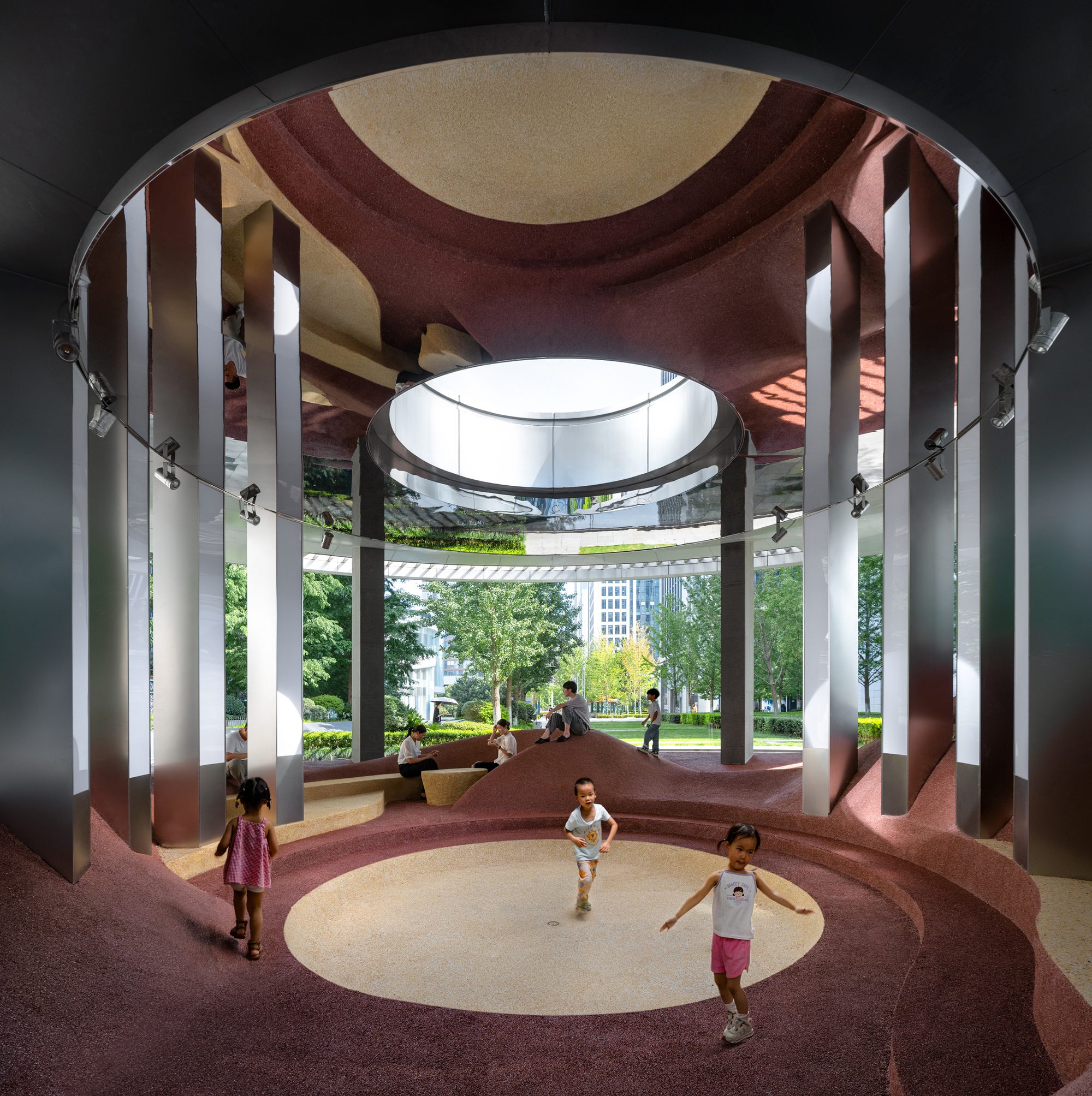 A mirrored ceiling complements the ground below, reflecting the shifting light and extending the dialogue between earth, body, and sky. As day turns to night, the undulating landscape softly mirrors the warm glow of interior lights, merging shadows, people, and nature into a living tableau of urban intimacy.