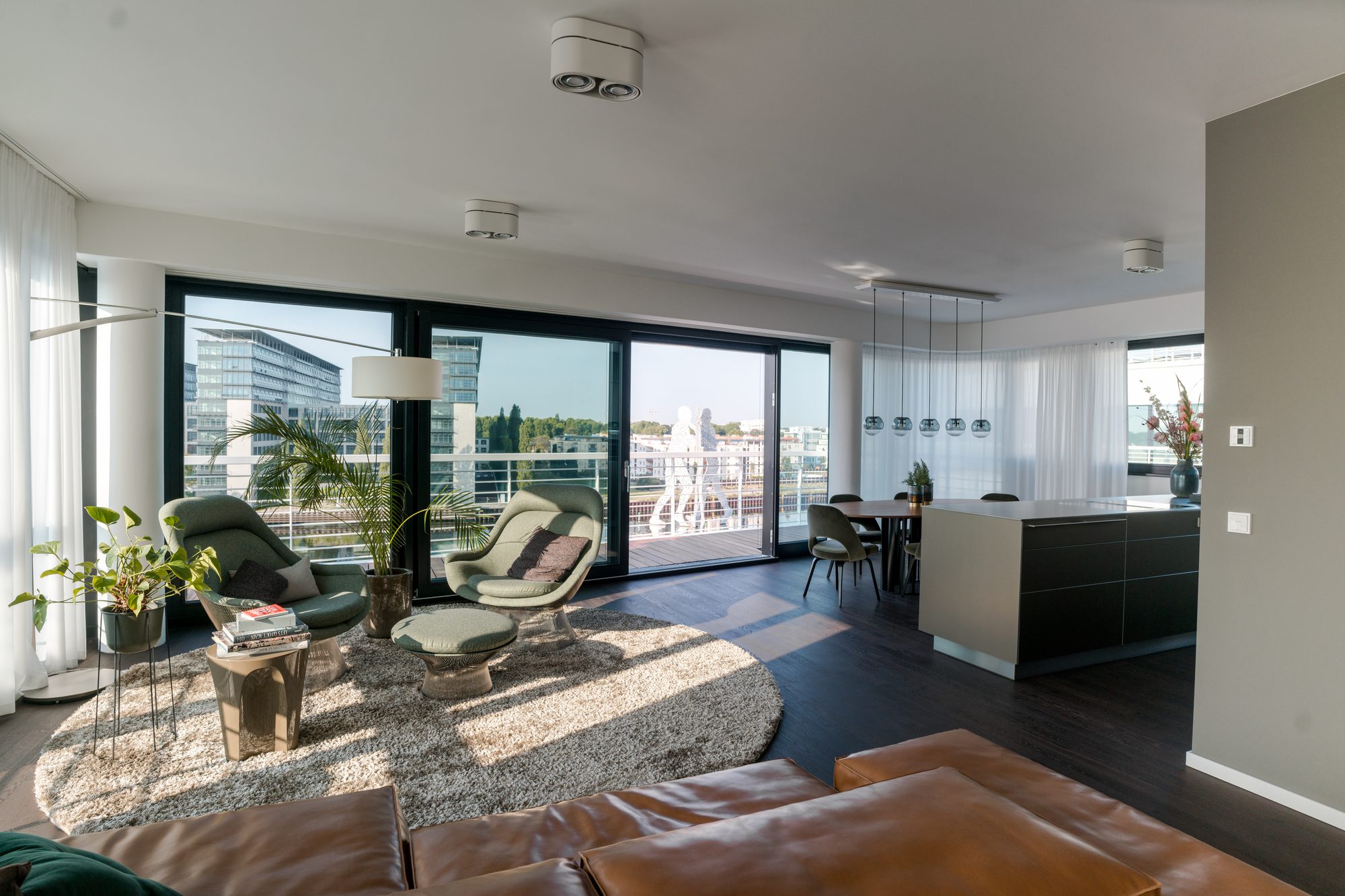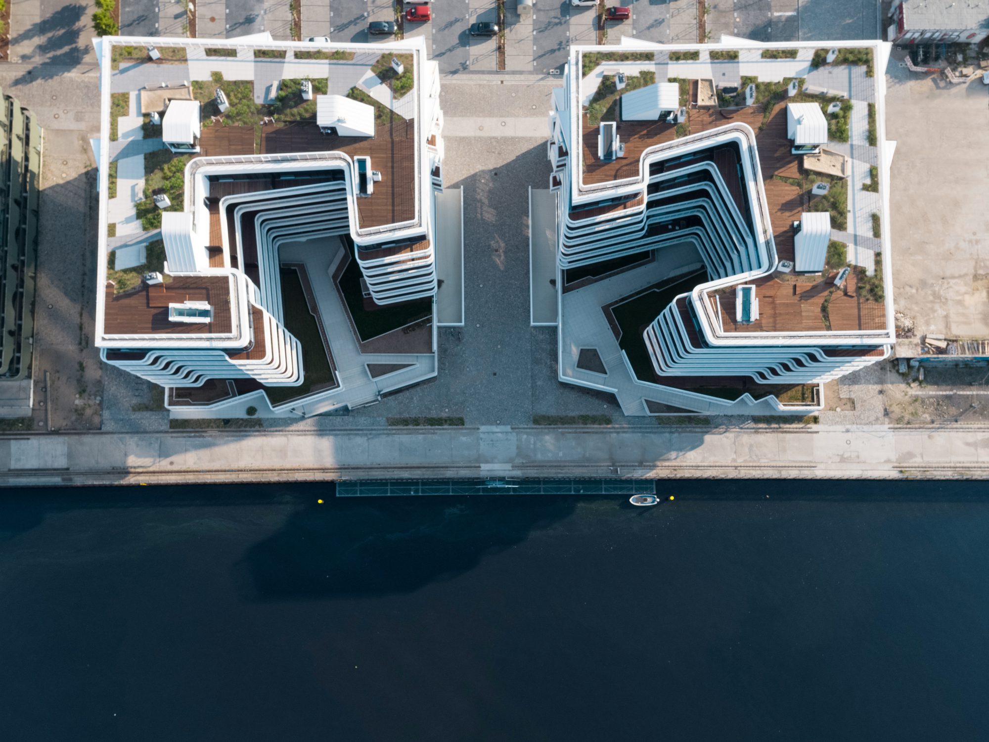 WAVE Residential Complex, The design for the ensemble provides public access to the riverside zone along the Spree. “Wave” not only incorporates the waterfront path but also orients the building to the south overlooking the water with spacious courtyard gardens and yacht-like balconies. By facing out over the water towards the iconic “Molecule Men” landmark, it avoids the typical inward-looking hermetic privacy of many projects. At its centre, the riverside path widens to form a small square together with gardens and a jetty alongside the Spreepromenade.