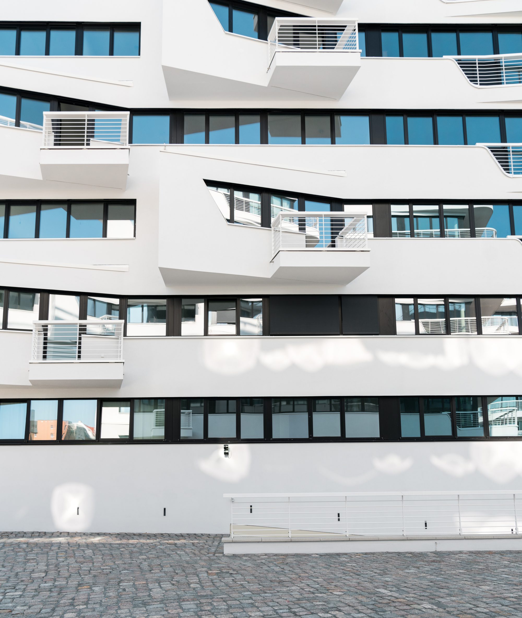 By not building along the waterfront and pairing the inner side wings, the two buildings form a continuous architectural figure. The elongated facade frontage ensures that each apartment has a view over the water and sun from the south. The soft curving lines of the south-facing elevation give the facade a sculptural, eroded amorphous figure that echoes the narrative qualities of its waterside location in the building’s fluid architectural form. The design of the ensemble springs from this conceptual idea as well as its accommodation of the social requirements of the neighbourhood.