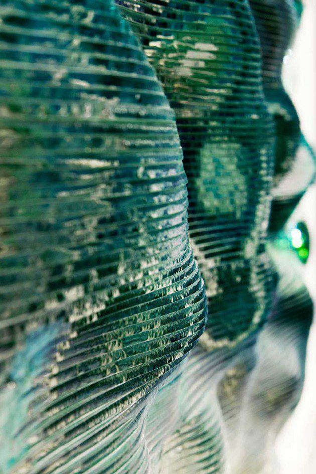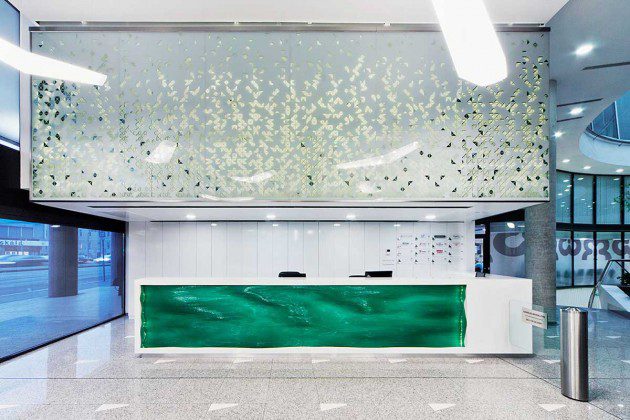 About a 100 layers of such custom glass pieces, each about 6-8 mm thick, stacked above one another make up the entire design. These wavy glass layers are supported in a thick white box like a rectangular framing. Being encased in a box of monochromatic white helps highlight the greenery of the stacked glass layers. LED lights run all around the insides of the white frame adding a soft glow to the glass panel and a sophisticated feeling to the entire visitor space