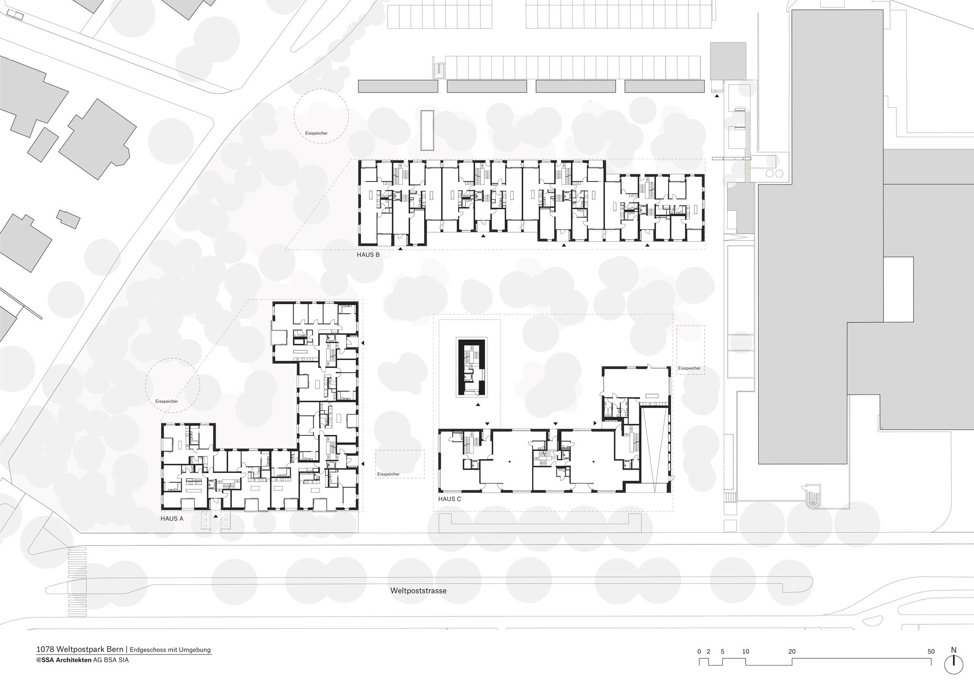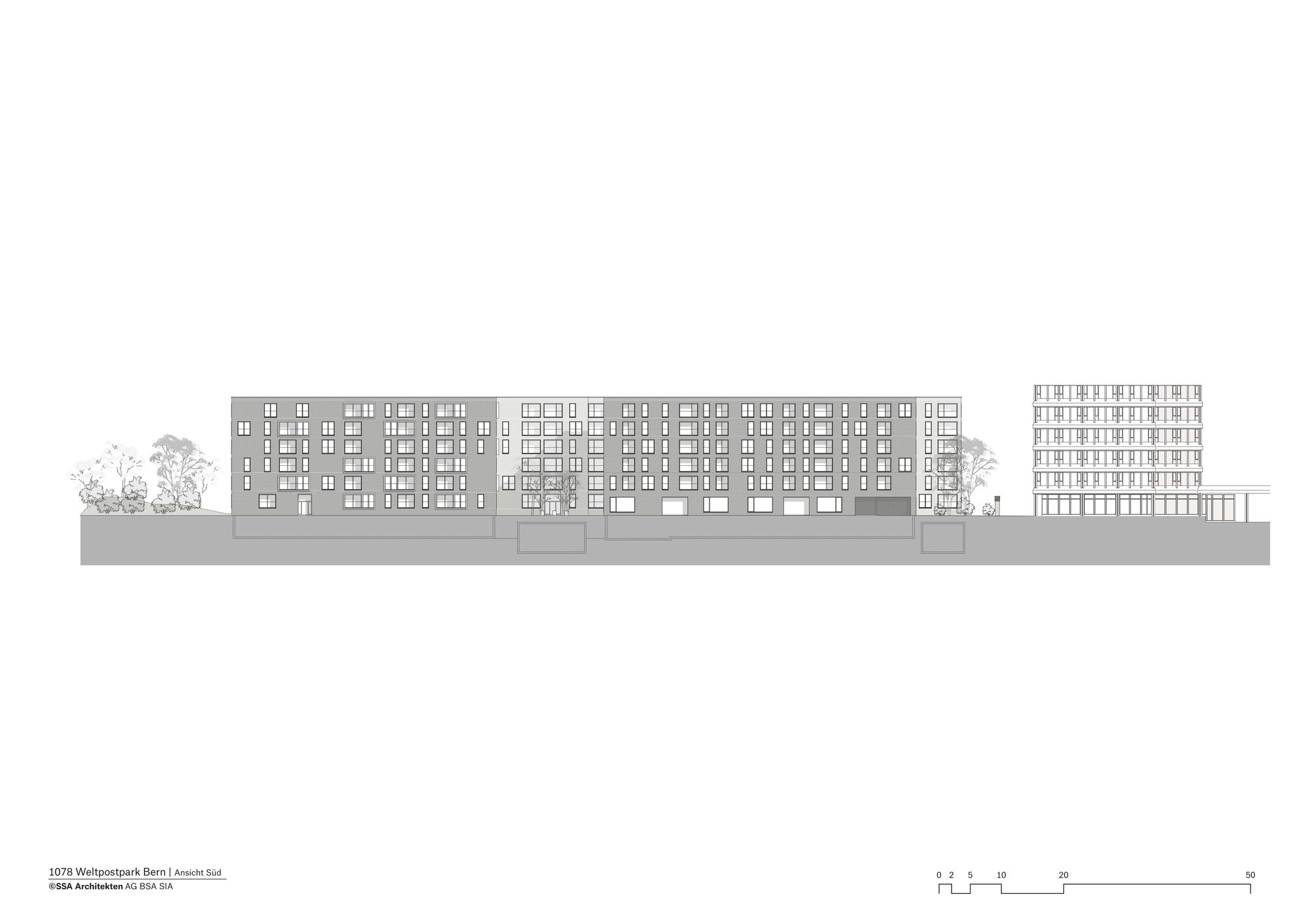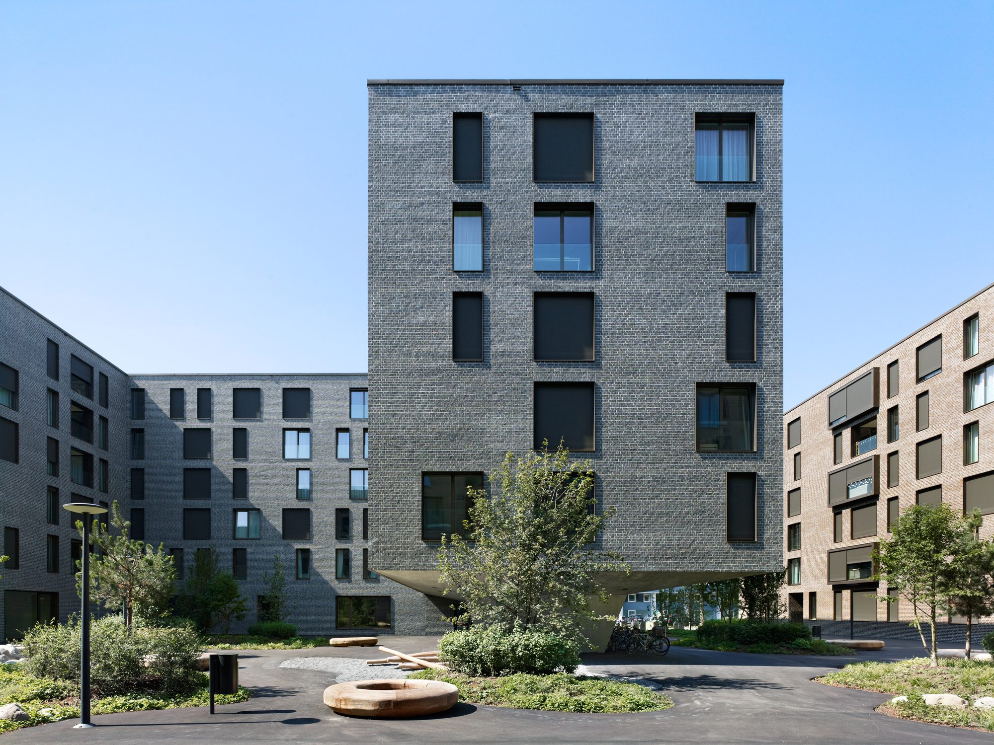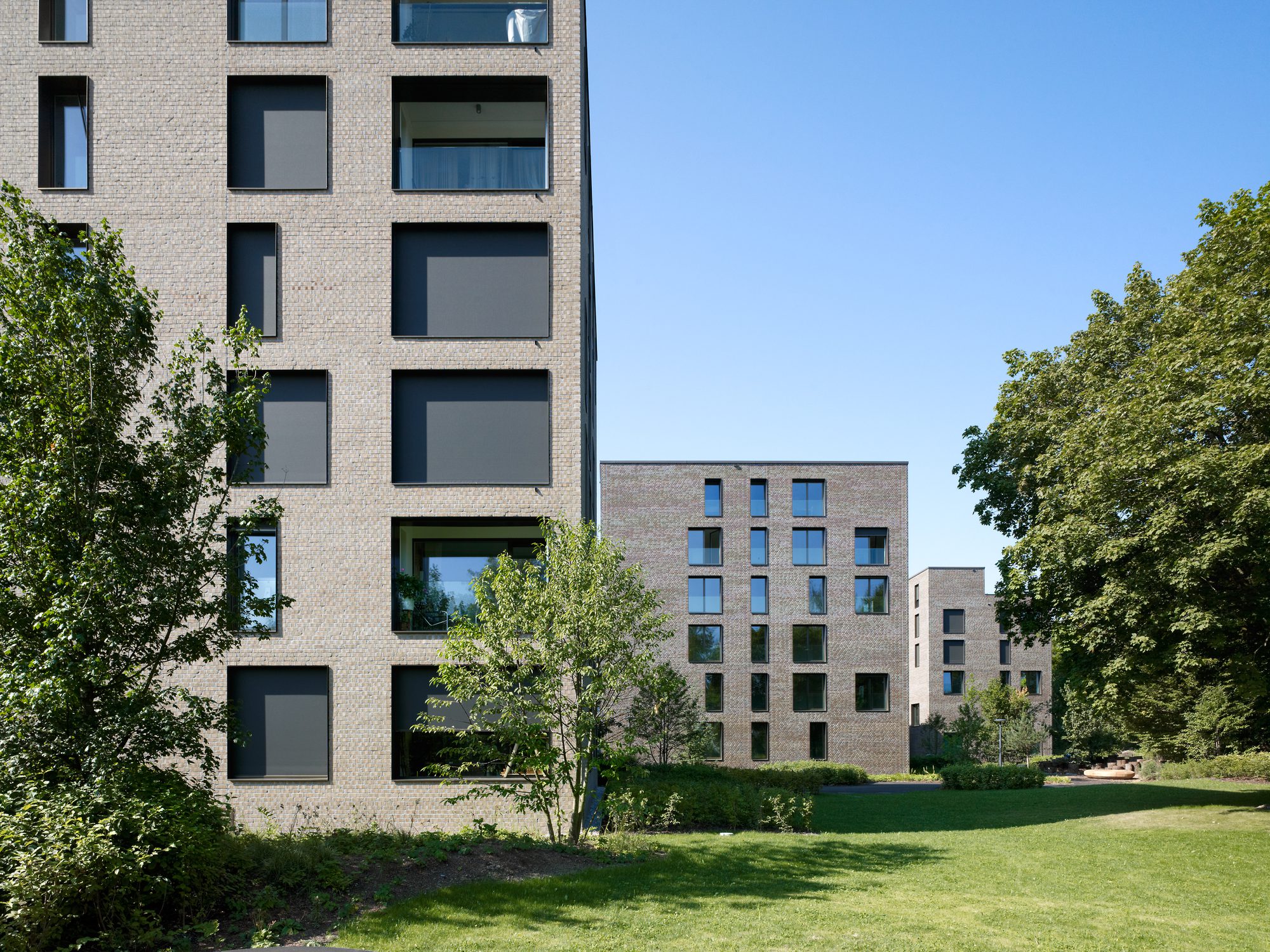 Sustainable architecture in an urban context The last apartments in the SSA Architekten-designed Weltpostpark development are now occupied. The striking six-storey residential buildings have an urban feel about them, while the park-like surroundings and the varied clinker brick facades create a homely atmosphere. What’s more, high-quality architecture also includes affordable residential units, and the development’s demand for energy is met in its entirety by regenerative resources. The Oberes Murifeld site is a heterogeneous mixed residential and urban quarter. Facing the Weltpoststrasse road are the larger office blocks of the Weltpostverein alongside a number of commercial and industrial buildings. A motorway marks the northern limits of the site. In between are a range of villas, allotments, and smaller parks. The design concept of the three residential buildings by SSA Architekten takes its cue from this variety of surrounding elements.