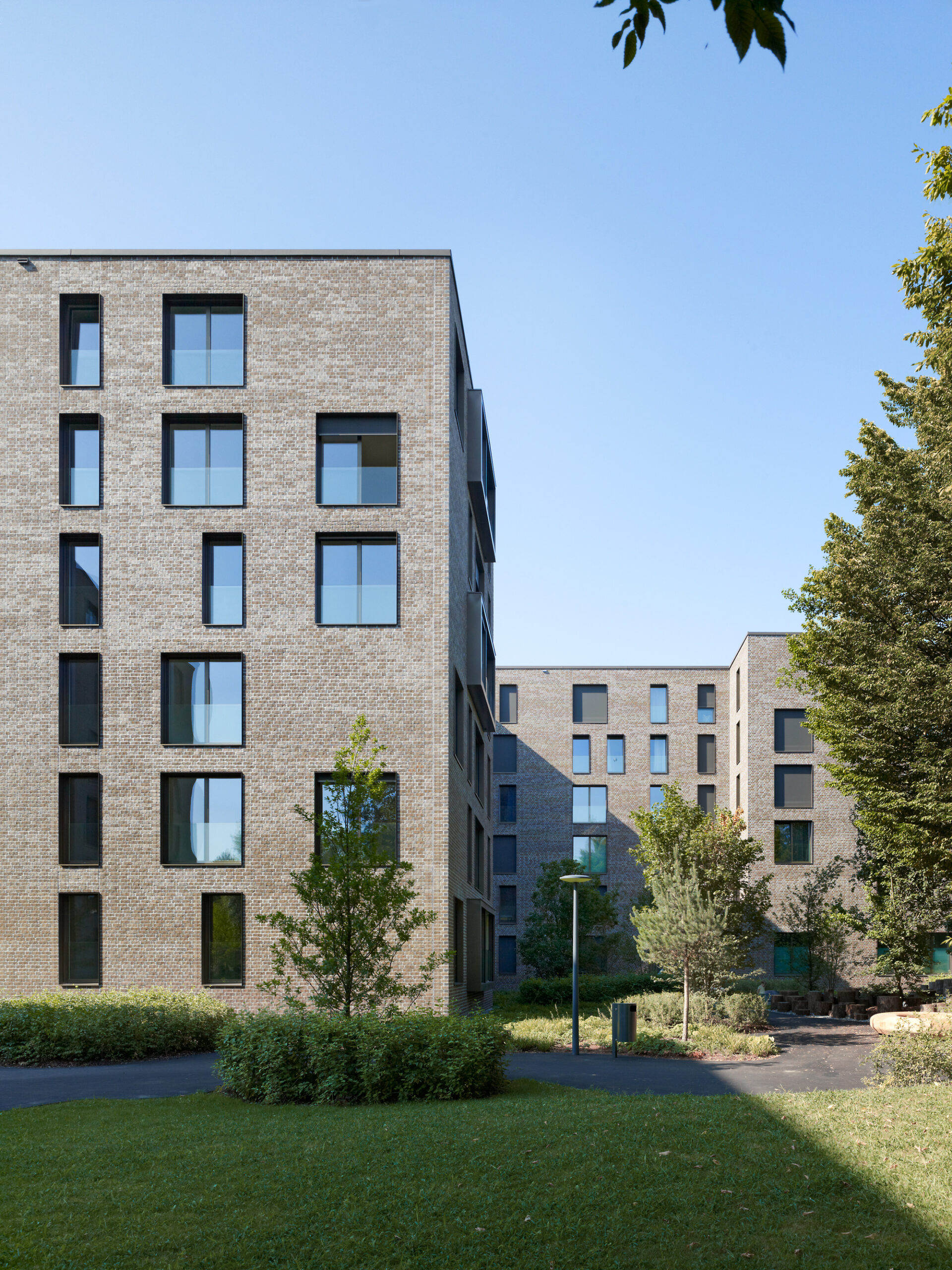 The greenbelt flows through the densely developed site with its sealed surfaces and a variety of communal areas and conveys a welcoming and homely atmosphere. The overall concept creates an attractive, sheltered residential area. This is also helped by the high-quality clinker brick facades. At first sight, the surfaces and colours of the clearly cut structures do not differ much from conventional facades. However, the kilned bricks are not mounted with the clean obverse layer towards the exterior, as would be usual, but with the rough base set into the visible outer side of the wall.