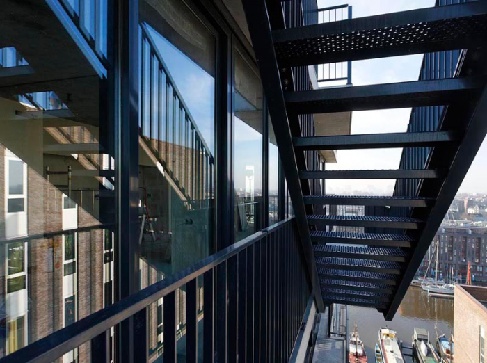 “Openness is the driving concept behind this design. By reducing the amount of materials used: glass, steel and concrete, the facade is opened up to allow for an expansive feeling of space within the building“, described the architects of MVRDV. The full height glass facade can be fully opened and contrasts with the other buildings within the so called VOC Cour port redevelopment that are mainly made of brick.