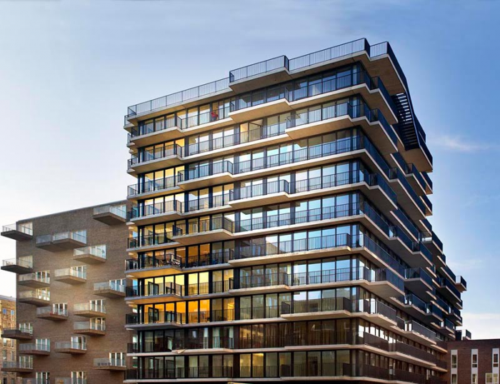 Rotterdam architects MVRDV have completed an apartment building at the docklands in Amsterdam, the Netherlands. The building is split into 46 apartments and a day-care center. Each apartment has a balcony of varying depths which stretch as bands along the entire facade creating the character of the building.