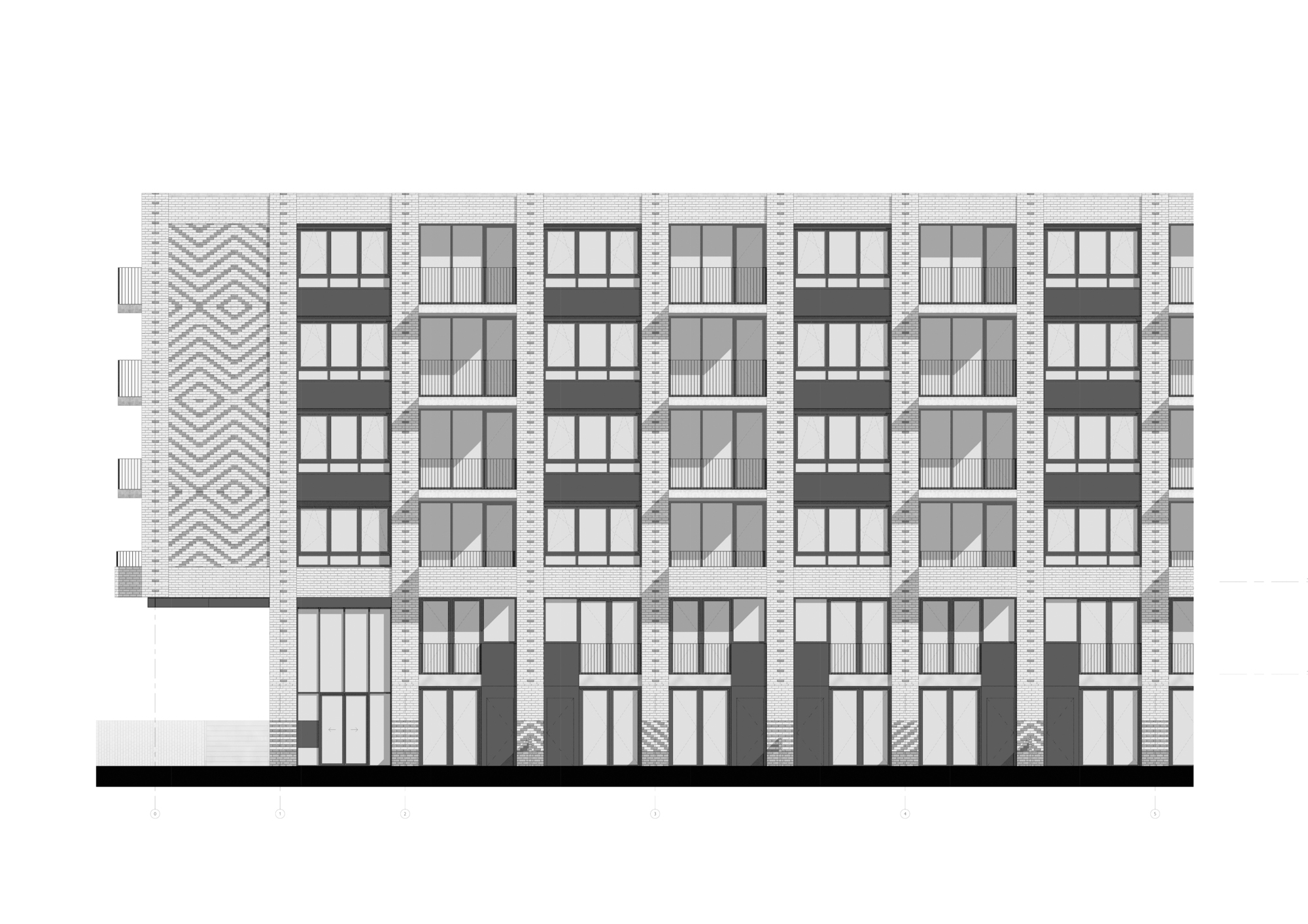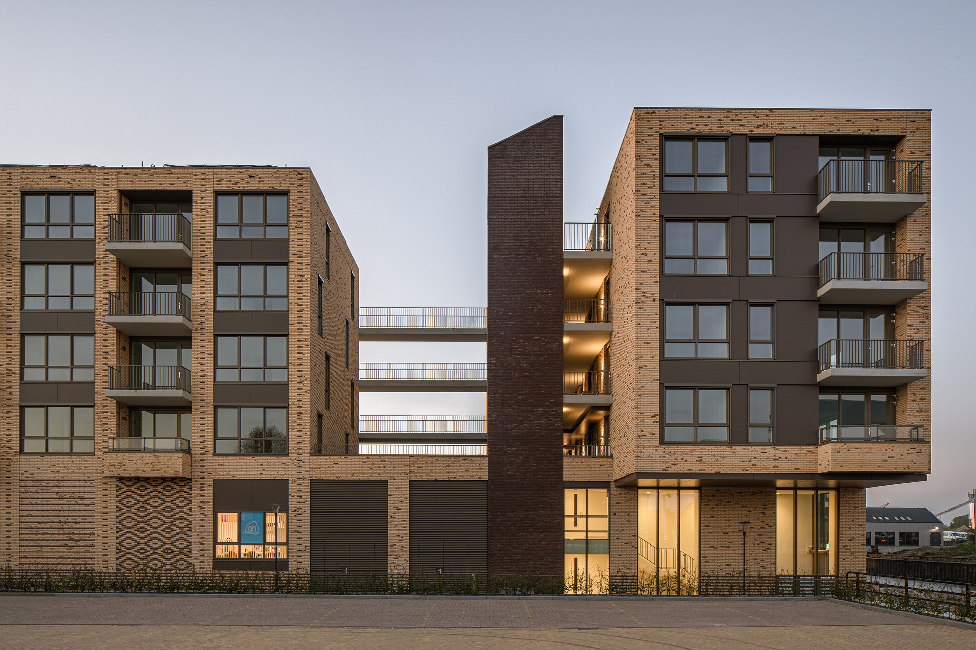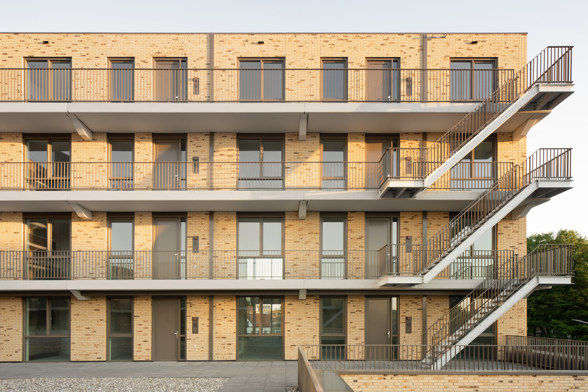 Life on the quay On the ground floor a new housing type is introduced: the quay house. These quay houses consist of a half-width plan across two floors. As a result, there are thirteen front doors along the quay, which encourages inhabitation to break out along the car-free quay. The pilasters on the ground floor are finished with either a brick bench or planter. These built-in furnishings mark a semi-private space for the quay houses, stimulating use by the residents.